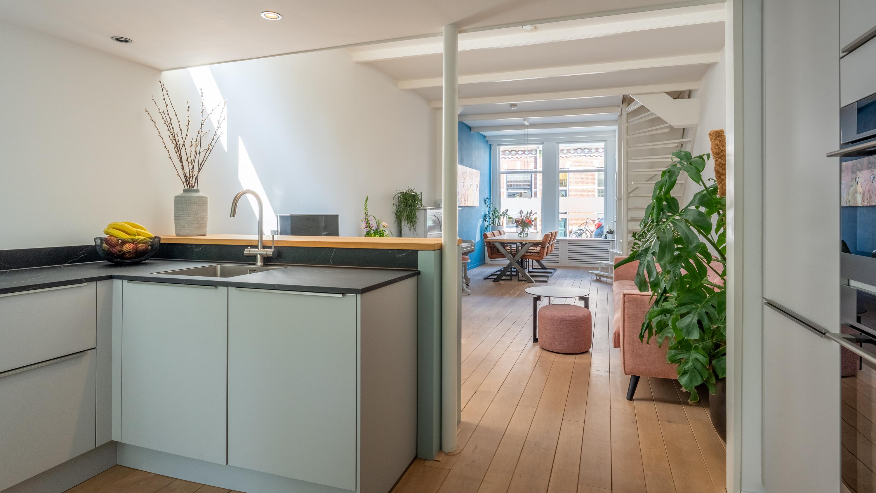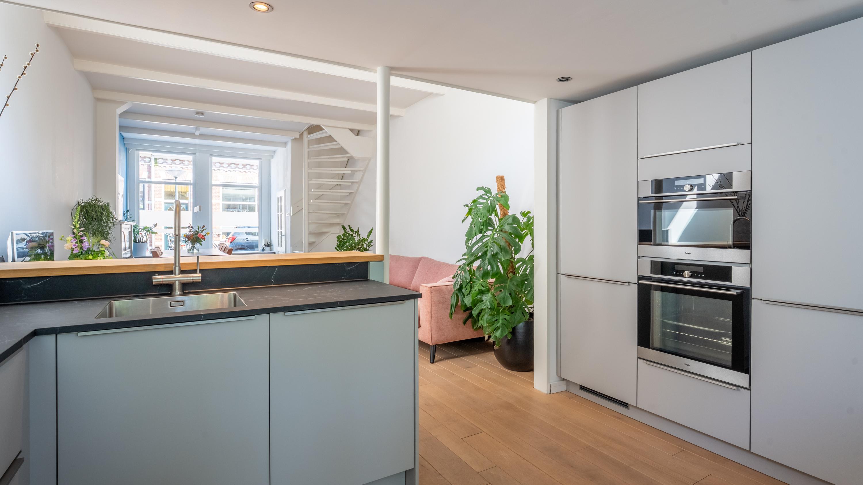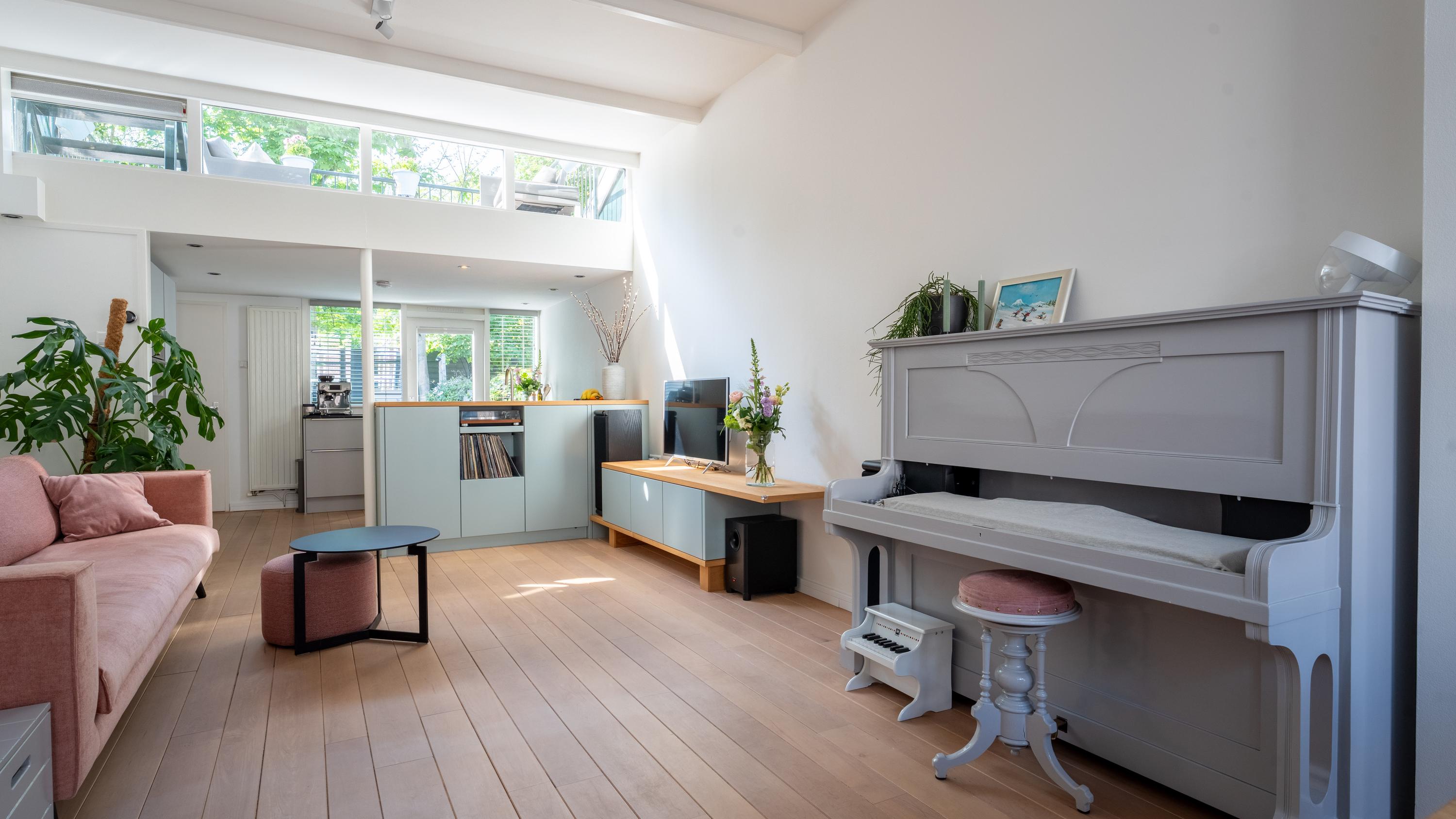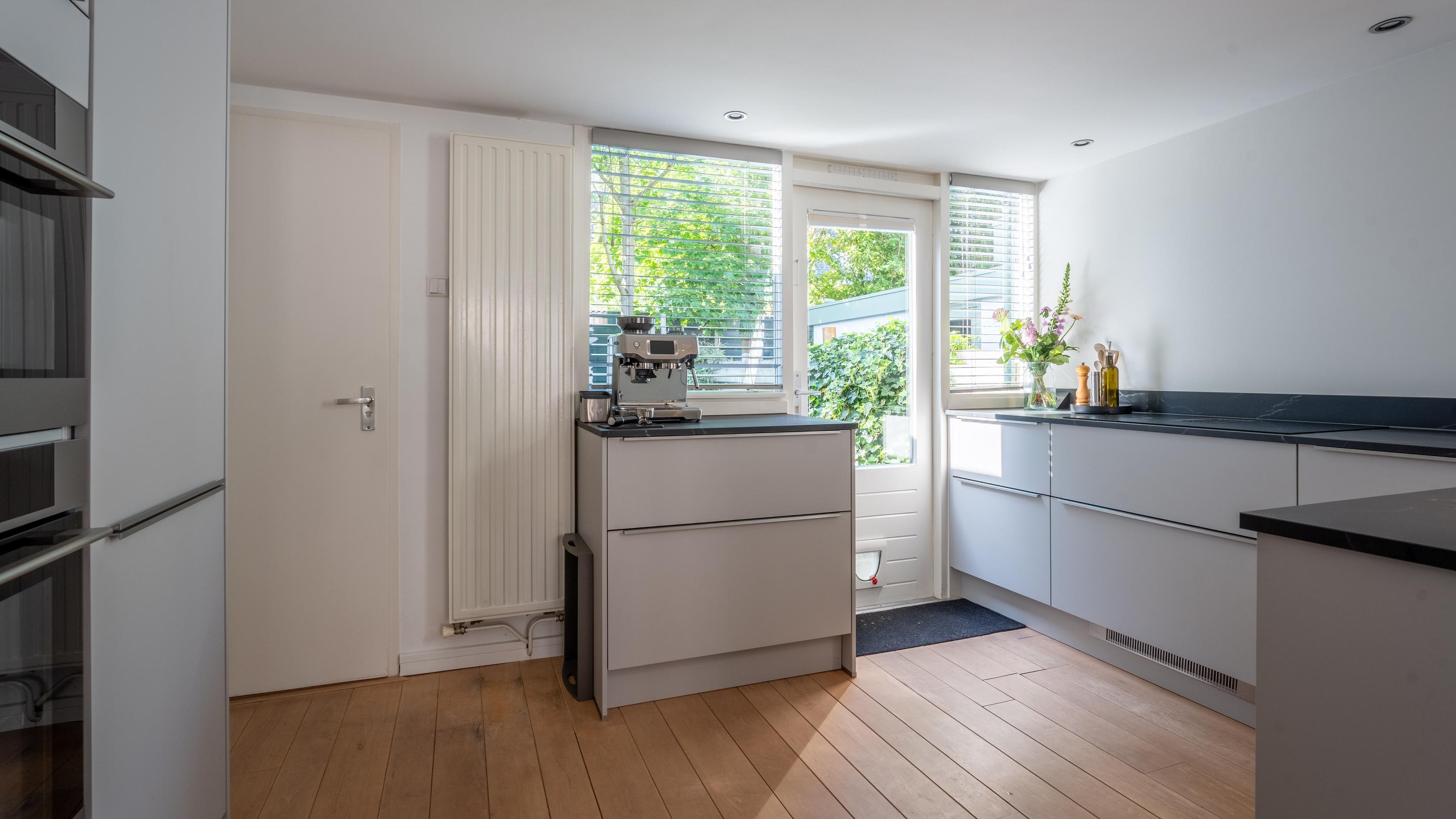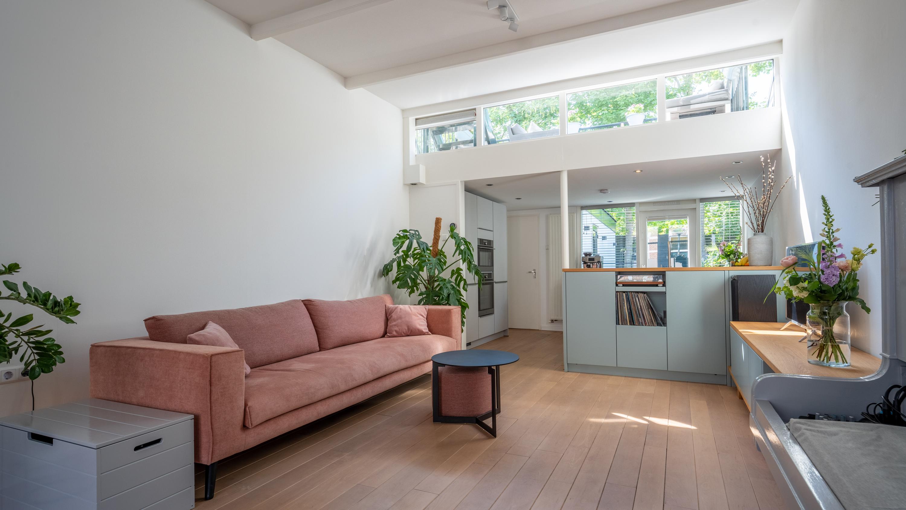 De diepe woonkamer met hoog plafond en grote ramen aan de voorzijde baadt in het licht, mede dankzij extra hoog geplaatste ramen boven de keuken die extra daglicht tot diep in de zitkamer brengen. De moderne open keuken is in 2022 volledig vernieuwd en voorzien van hoogwaardige inbouwapparatuur waaronder tevens een kokend waterkraan. Vanuit de keuken bereik je een separaat toilet en de prettige, schaduwrijke achtertuin. Hier vind je een aangebouwde stenen schuur met de cv-opstelling (2024), en een praktische achterom via recht van overpad.