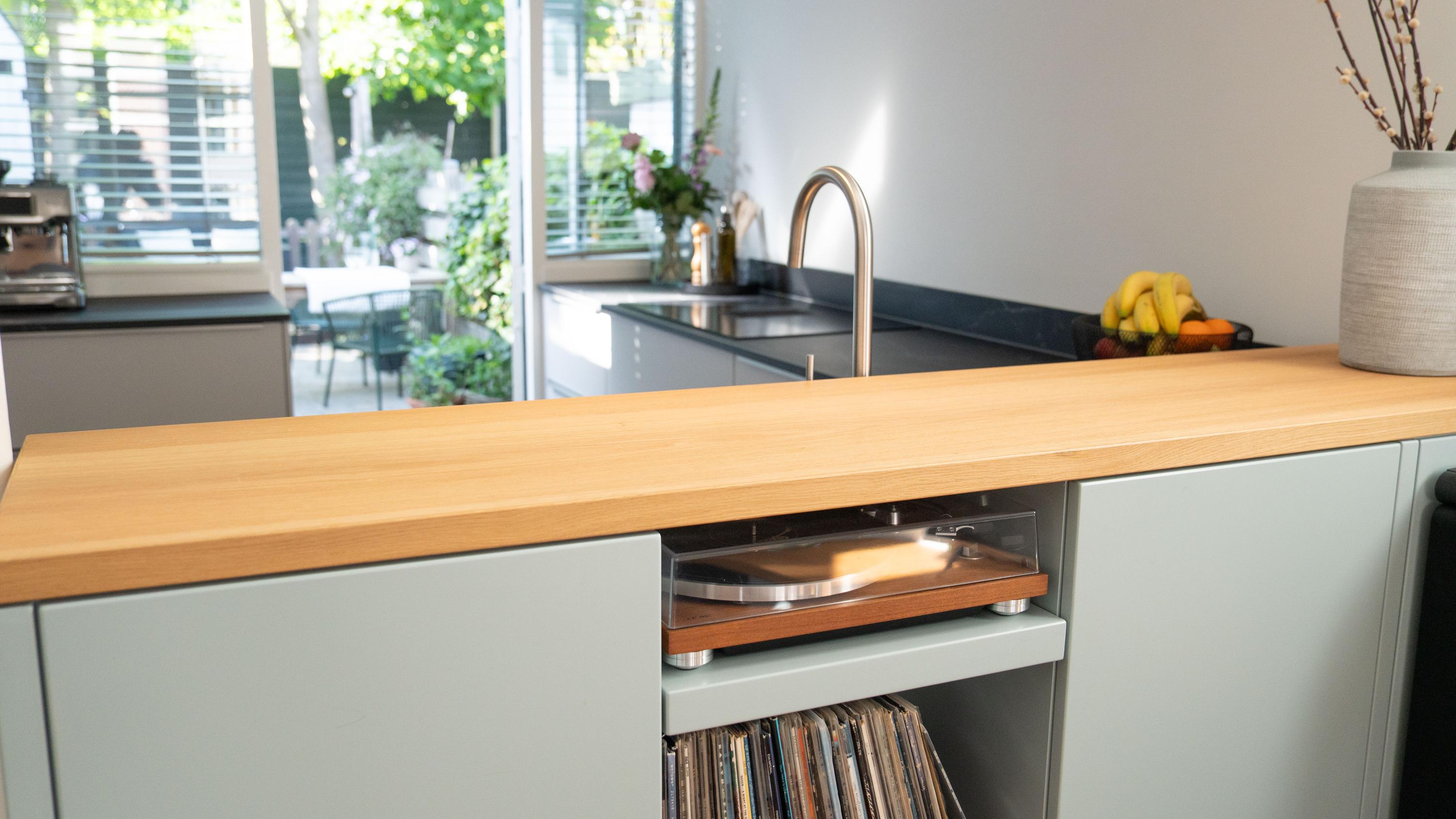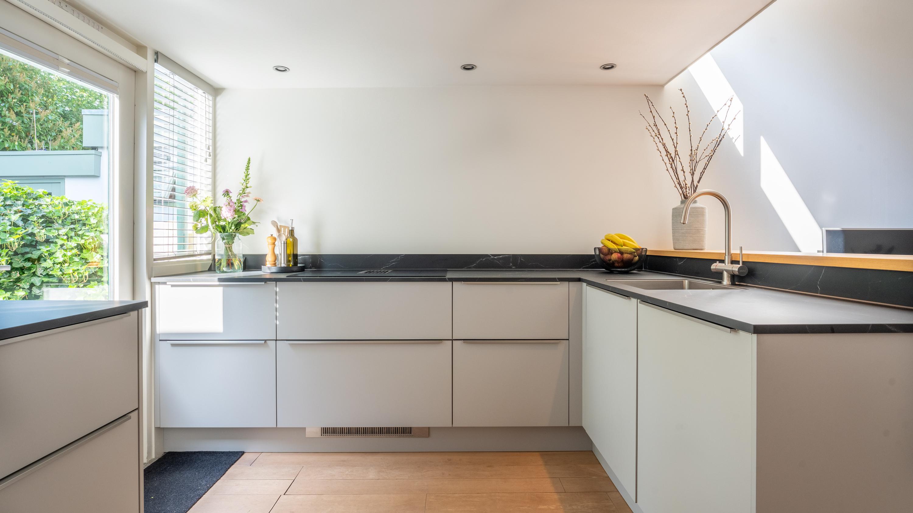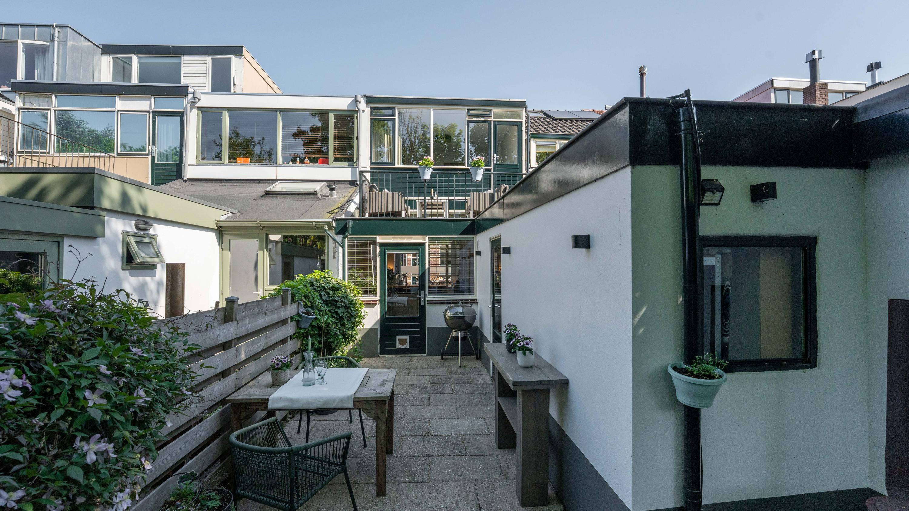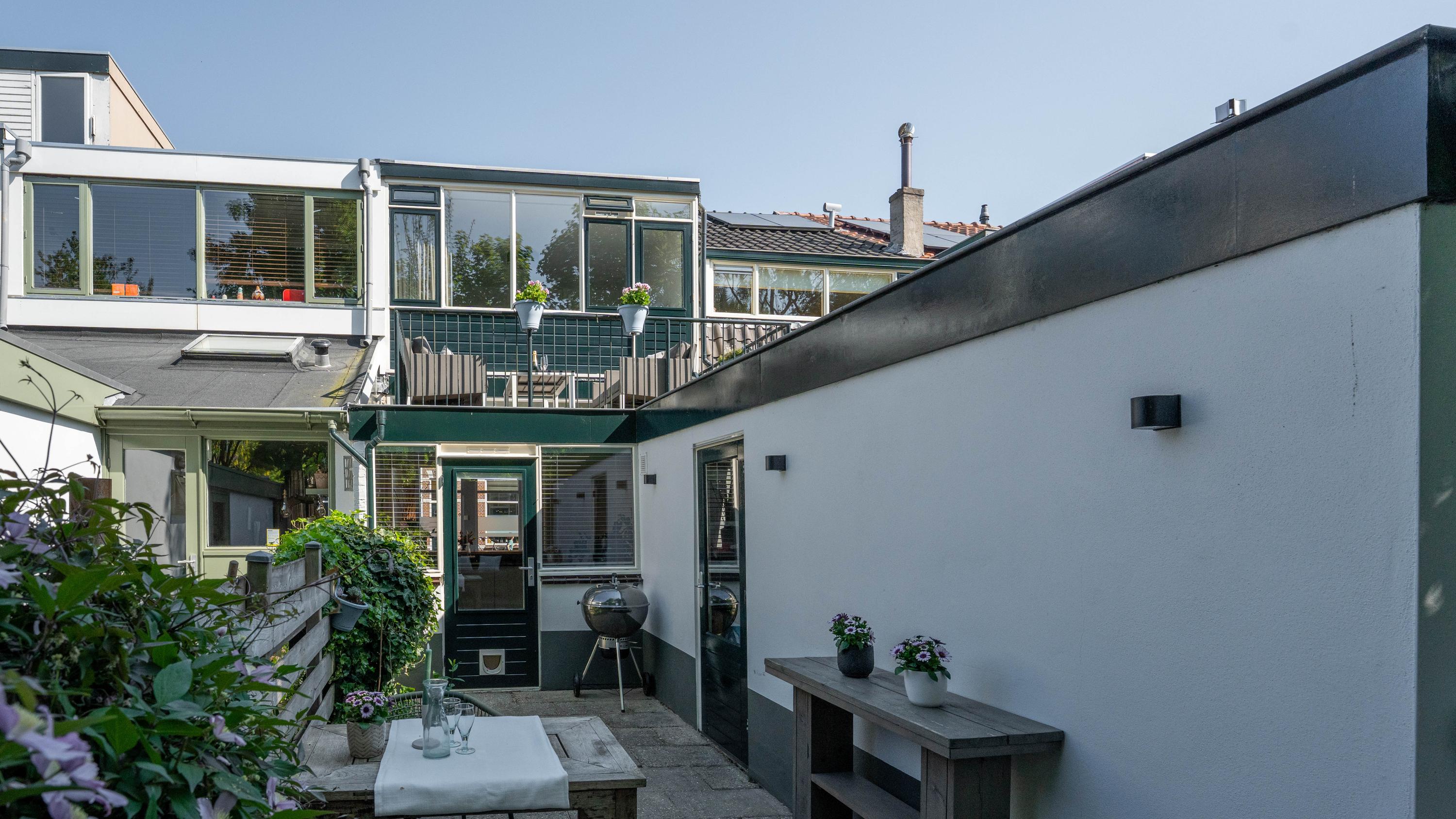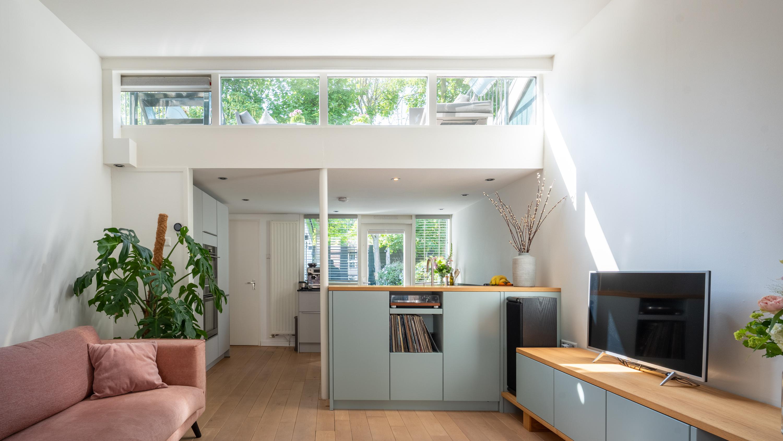 De diepe woonkamer met hoog plafond en grote ramen aan de voorzijde baadt in het licht, mede dankzij extra hoog geplaatste ramen boven de keuken die extra daglicht tot diep in de zitkamer brengen. De moderne open keuken is in 2022 volledig vernieuwd en voorzien van hoogwaardige inbouwapparatuur waaronder tevens een kokend waterkraan. Vanuit de keuken bereik je een separaat toilet en de prettige, schaduwrijke achtertuin. Hier vind je een aangebouwde stenen schuur met de cv-opstelling (2024), en een praktische achterom via recht van overpad.
