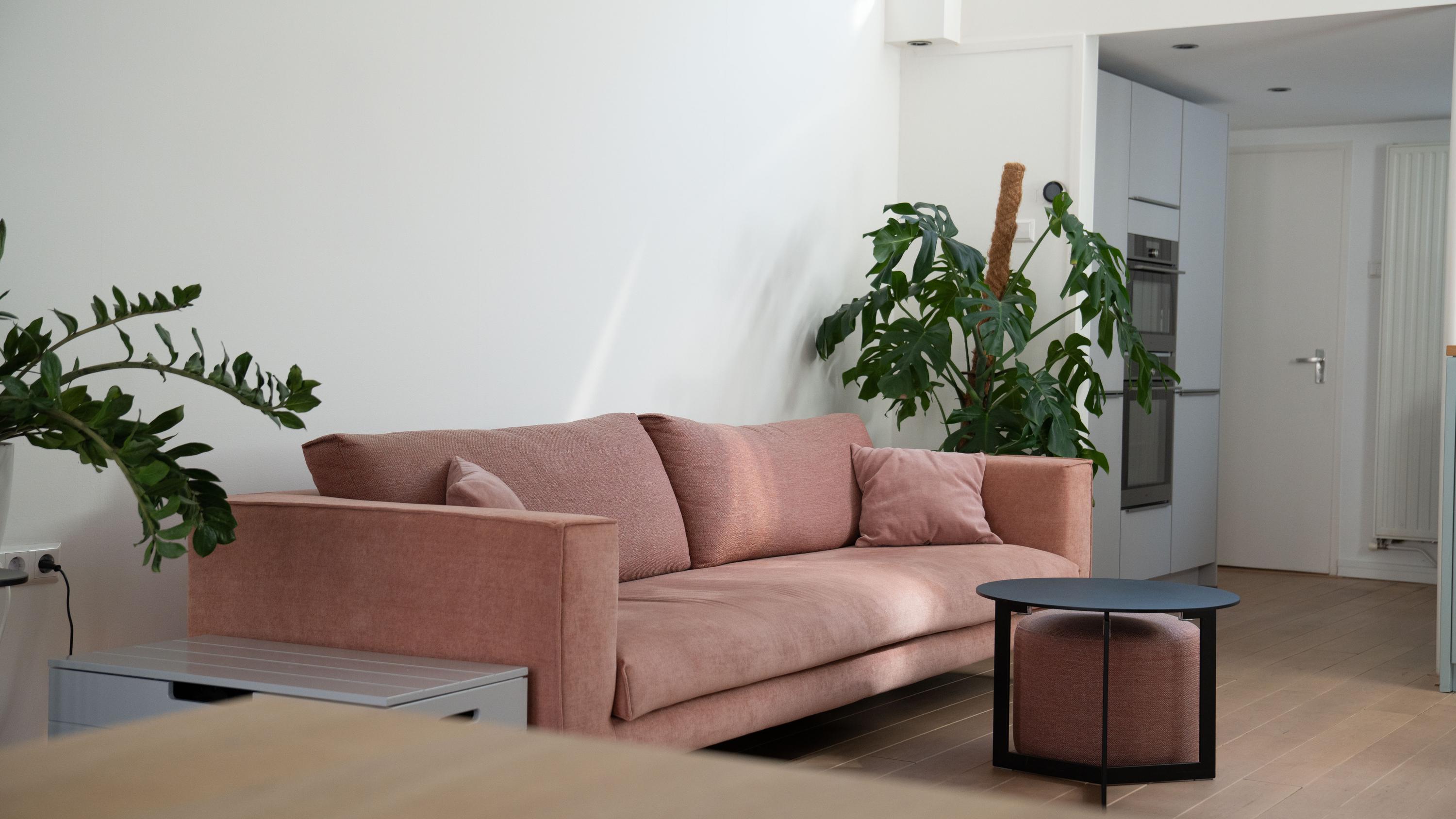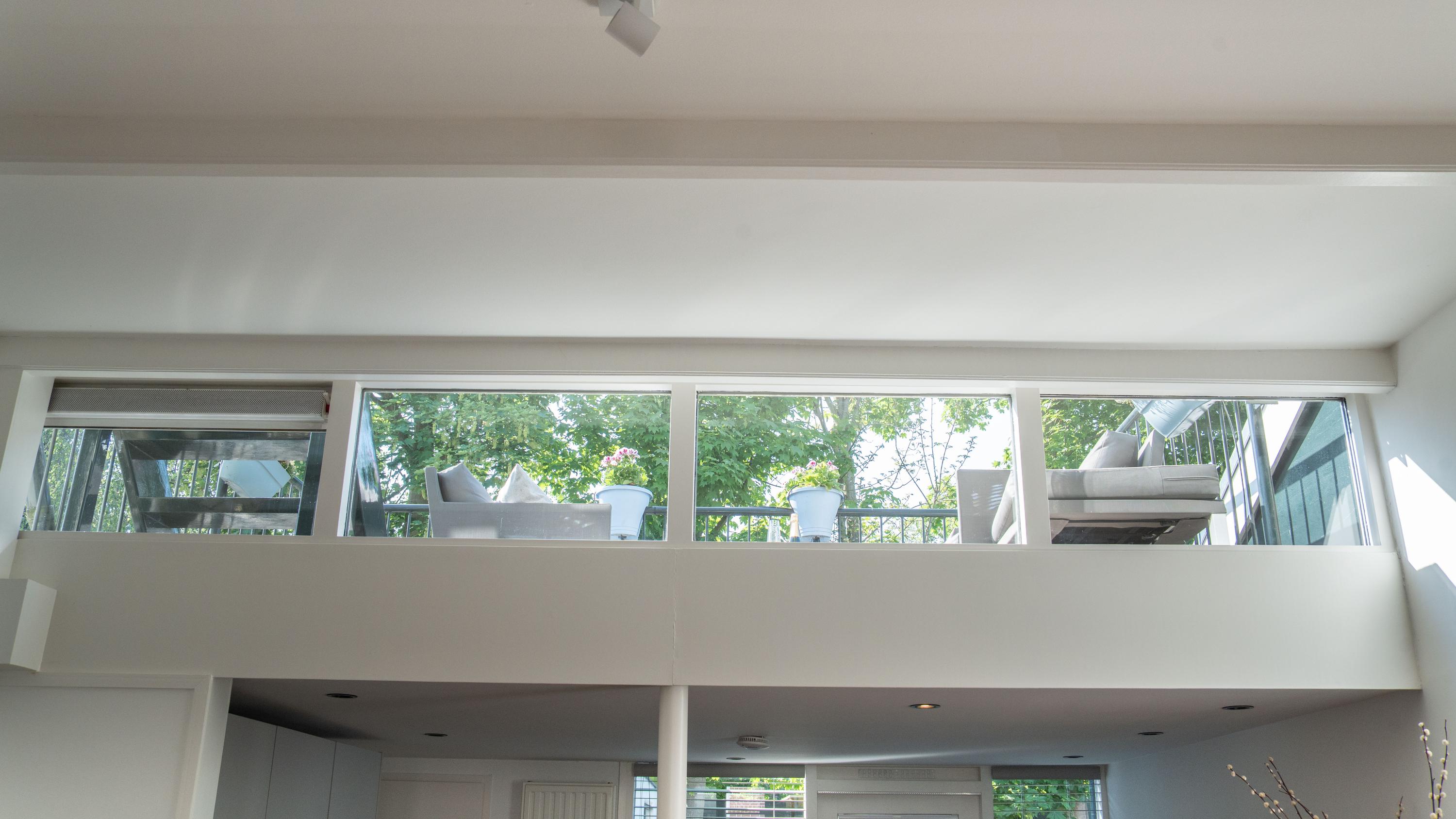 Diepe woonkamer met hoog plafond en veel lichtinval