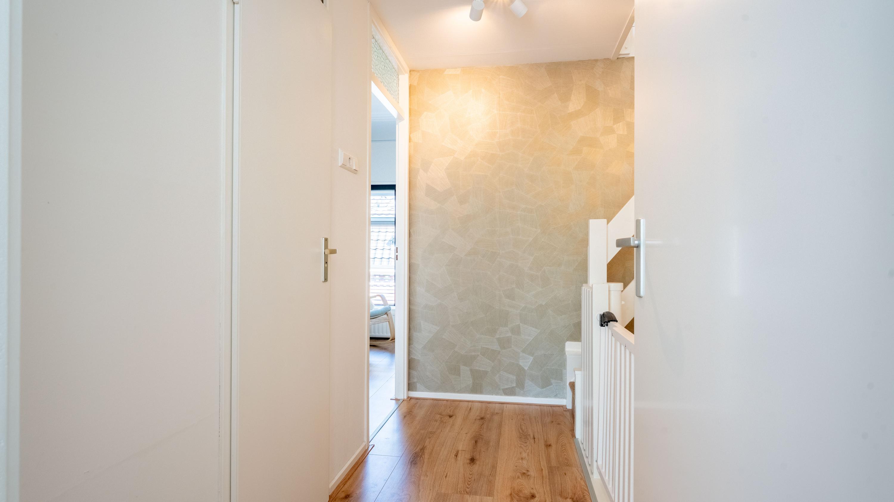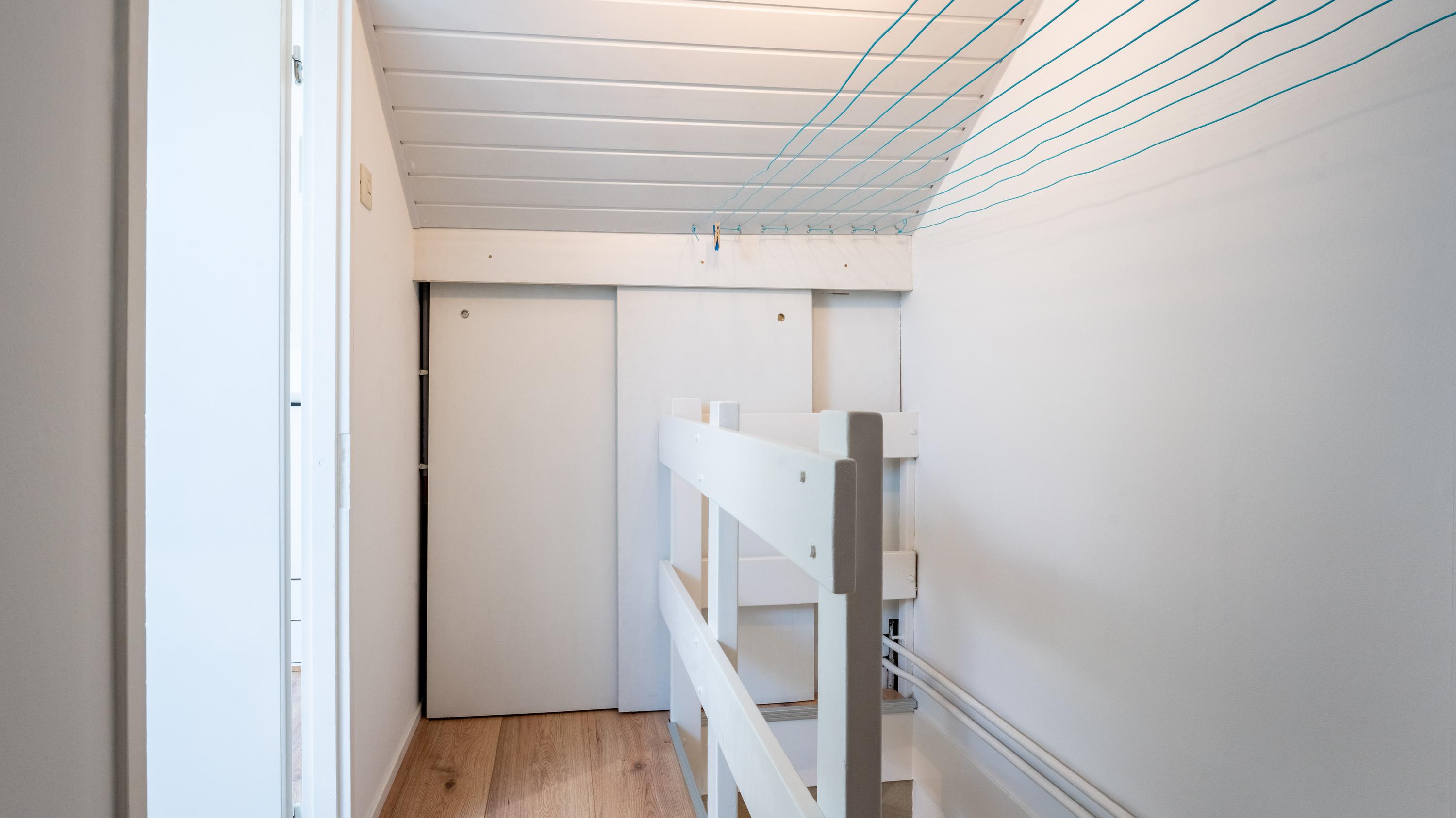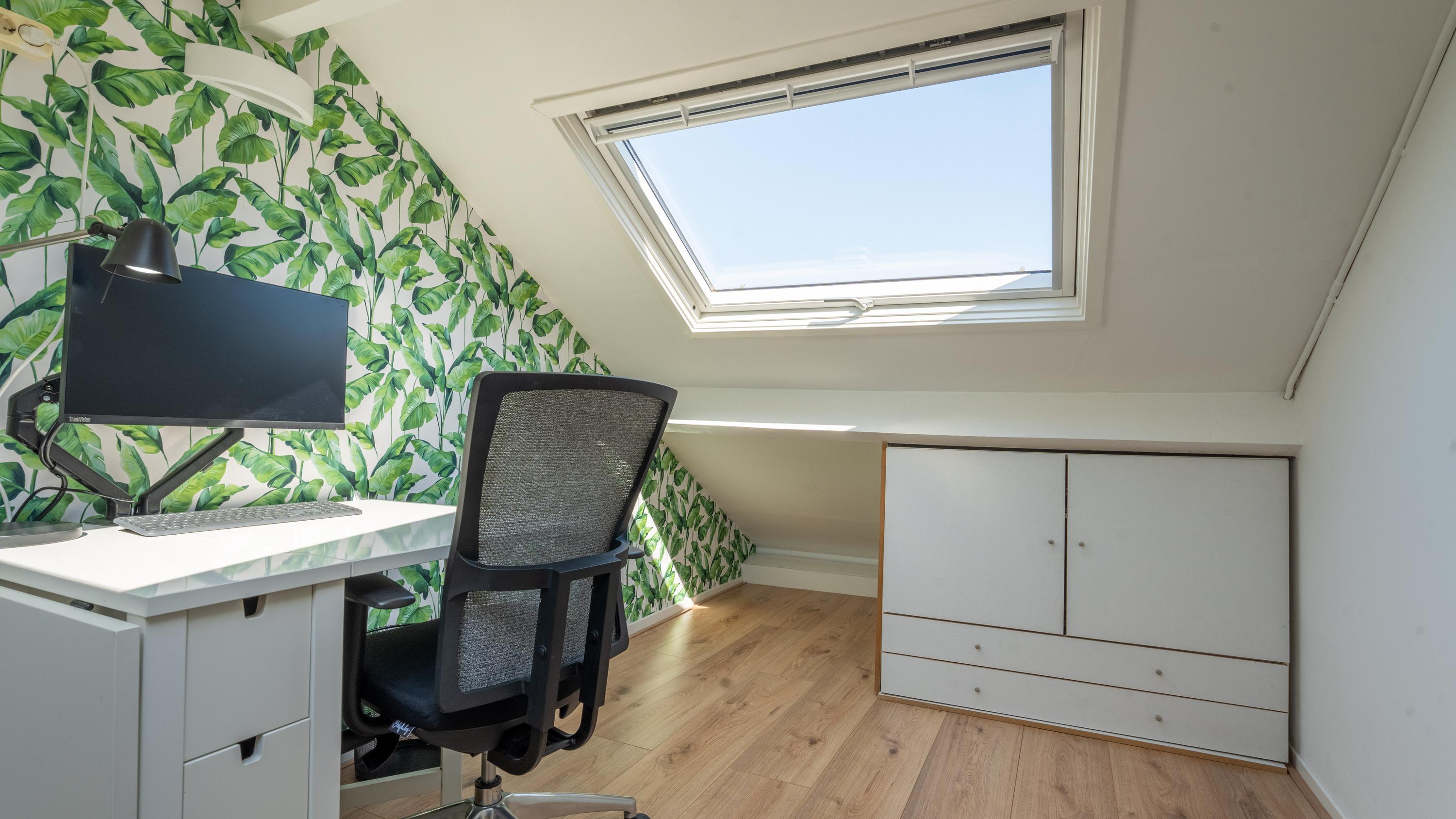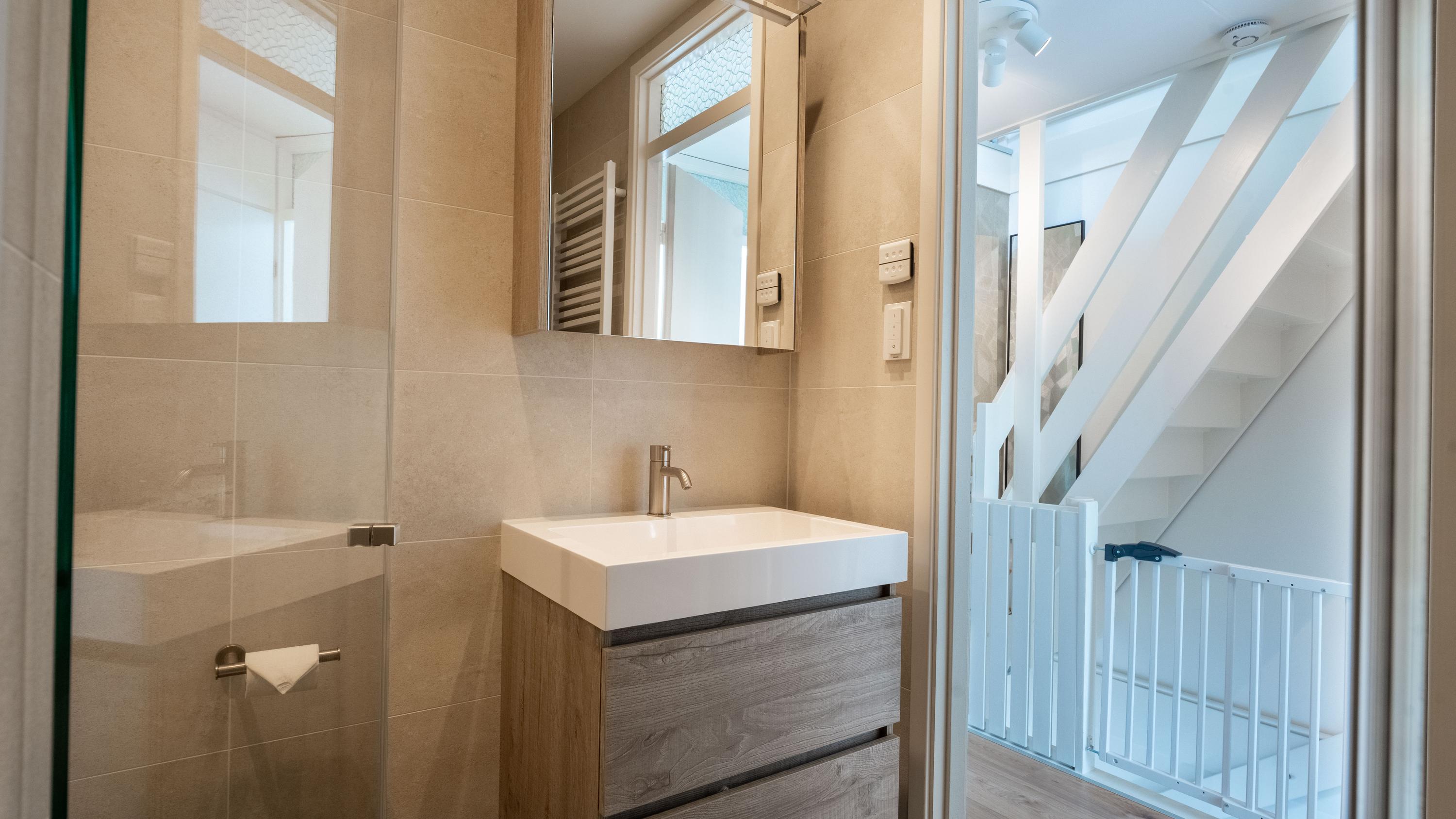 Een stijlvolle wenteltrap leidt naar de eerste etage, met een overloop waar een slimme bergkast is geïntegreerd met opstelling voor wasmachine en droger. De slaapkamer aan de voorzijde is licht en rustig gelegen. De royale slaapkamer aan de achterzijde biedt directe toegang tot een sfeervol dakterras op het noordwesten – perfect voor een avond buiten in alle rust. De moderne badkamer (2019) is voorzien van een ruime inloopdouche, zwevend toilet, wastafel met ladekast en een verlichte spiegel.