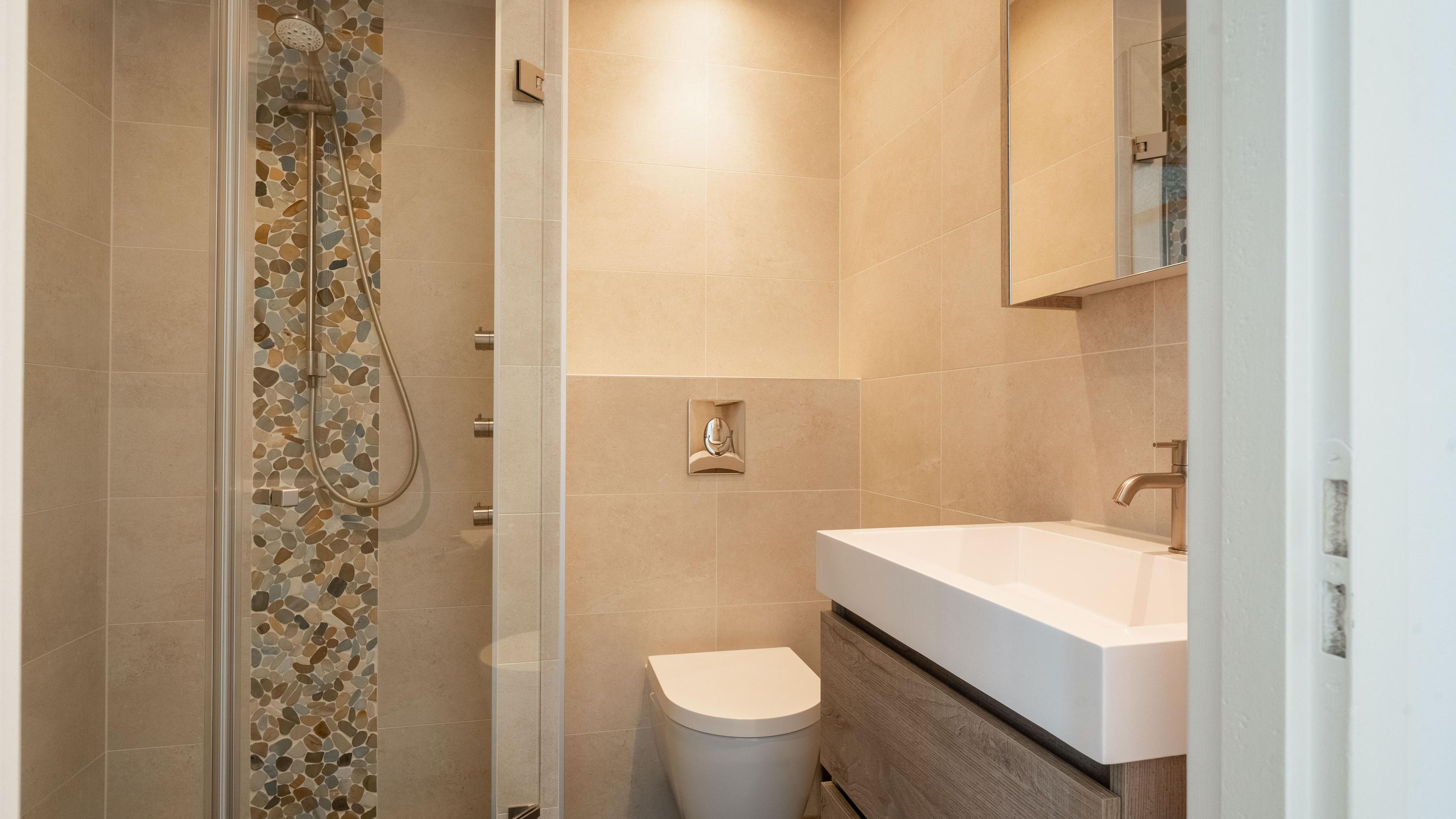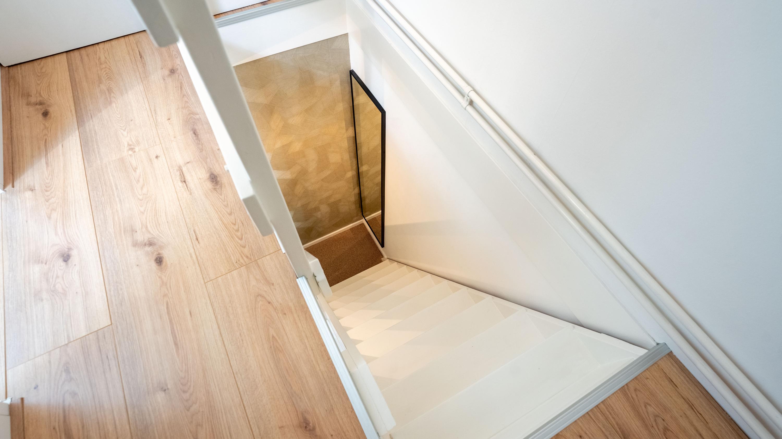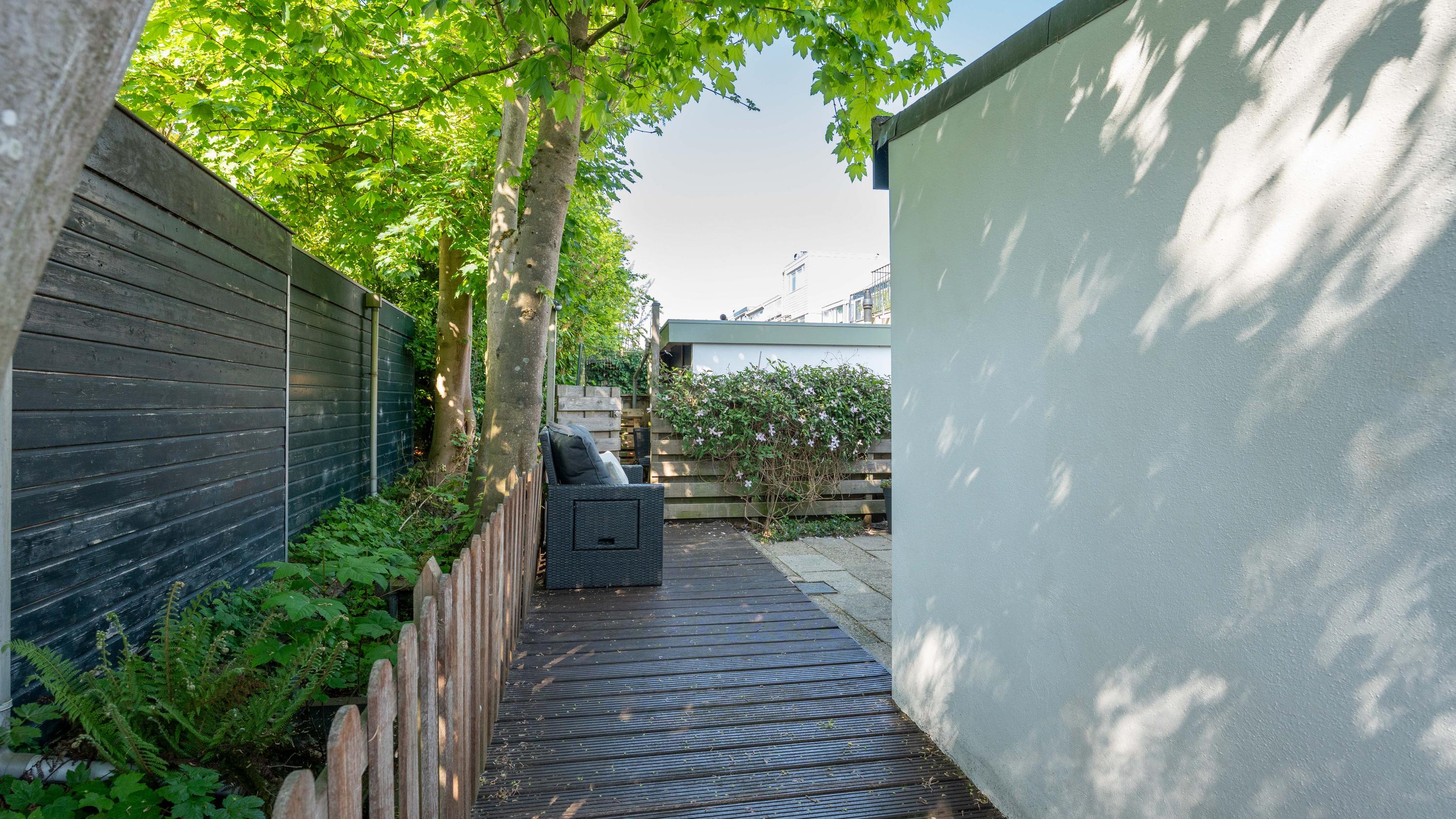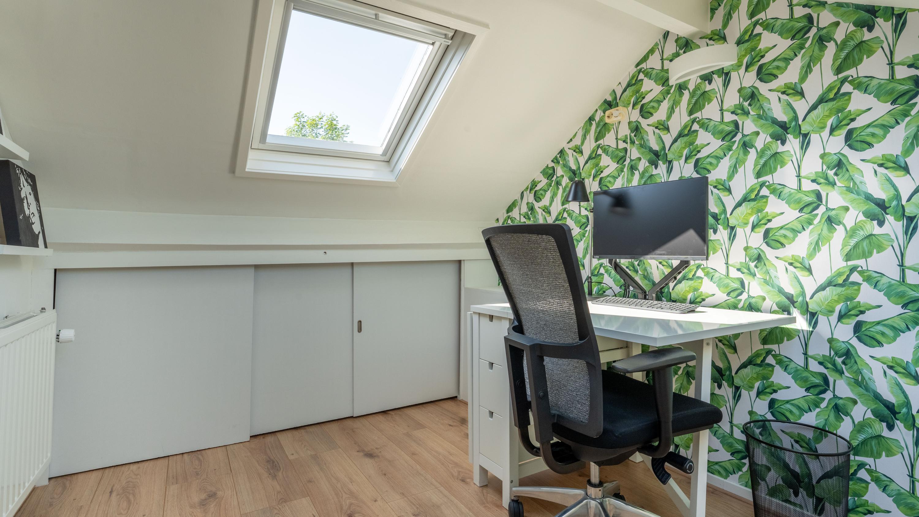 Een stijlvolle wenteltrap leidt naar de eerste etage, met een overloop waar een slimme bergkast is geïntegreerd met opstelling voor wasmachine en droger. De slaapkamer aan de voorzijde is licht en rustig gelegen. De royale slaapkamer aan de achterzijde biedt directe toegang tot een sfeervol dakterras op het noordwesten – perfect voor een avond buiten in alle rust. De moderne badkamer (2019) is voorzien van een ruime inloopdouche, zwevend toilet, wastafel met ladekast en een verlichte spiegel.