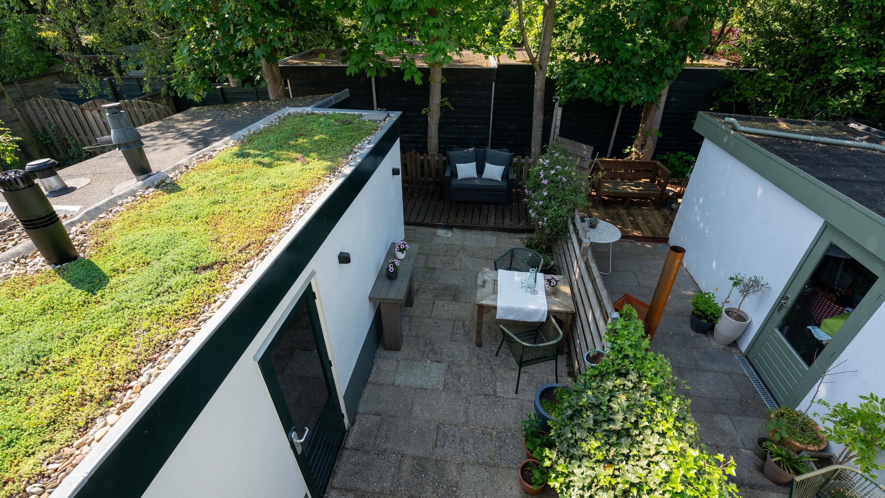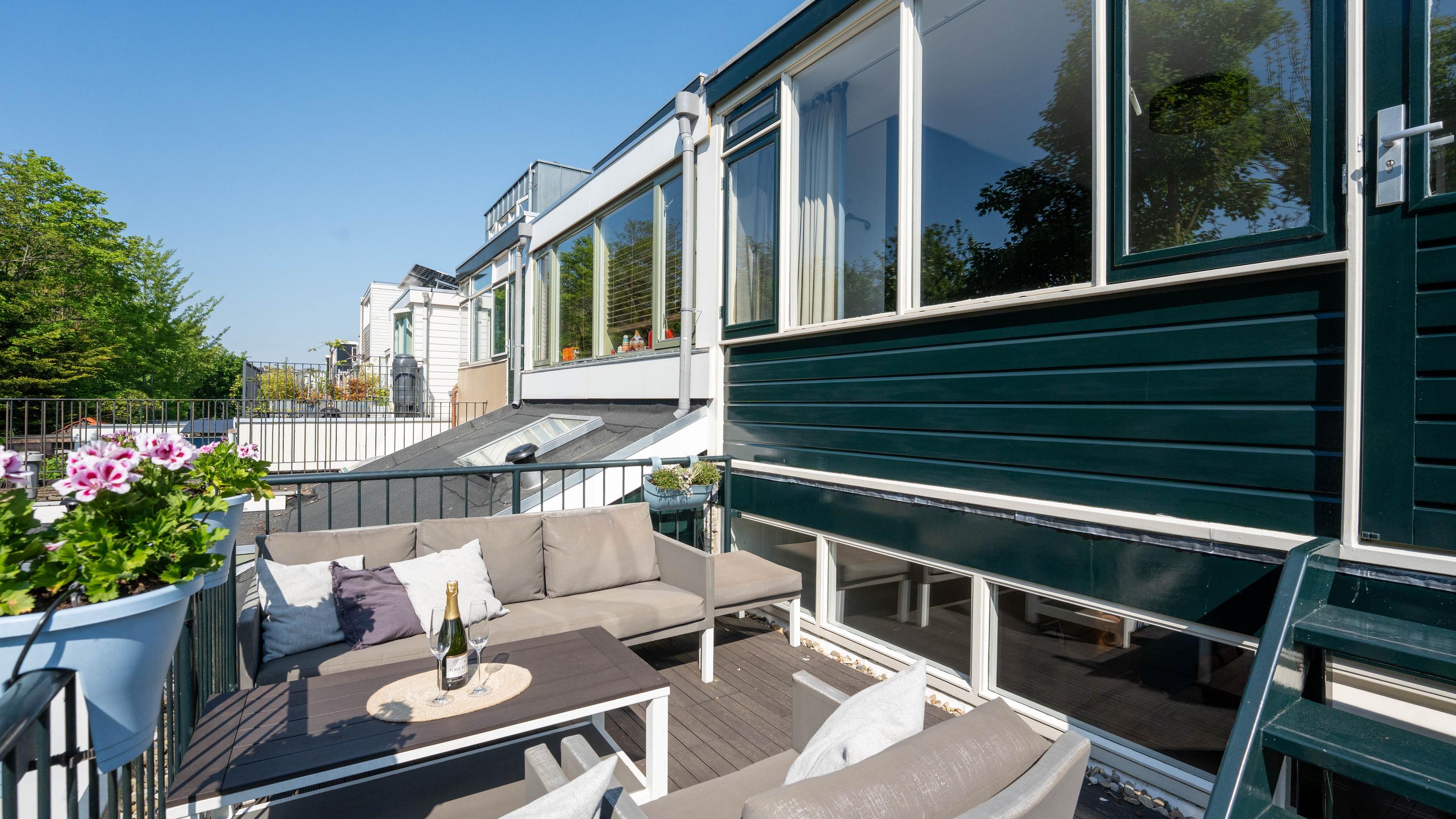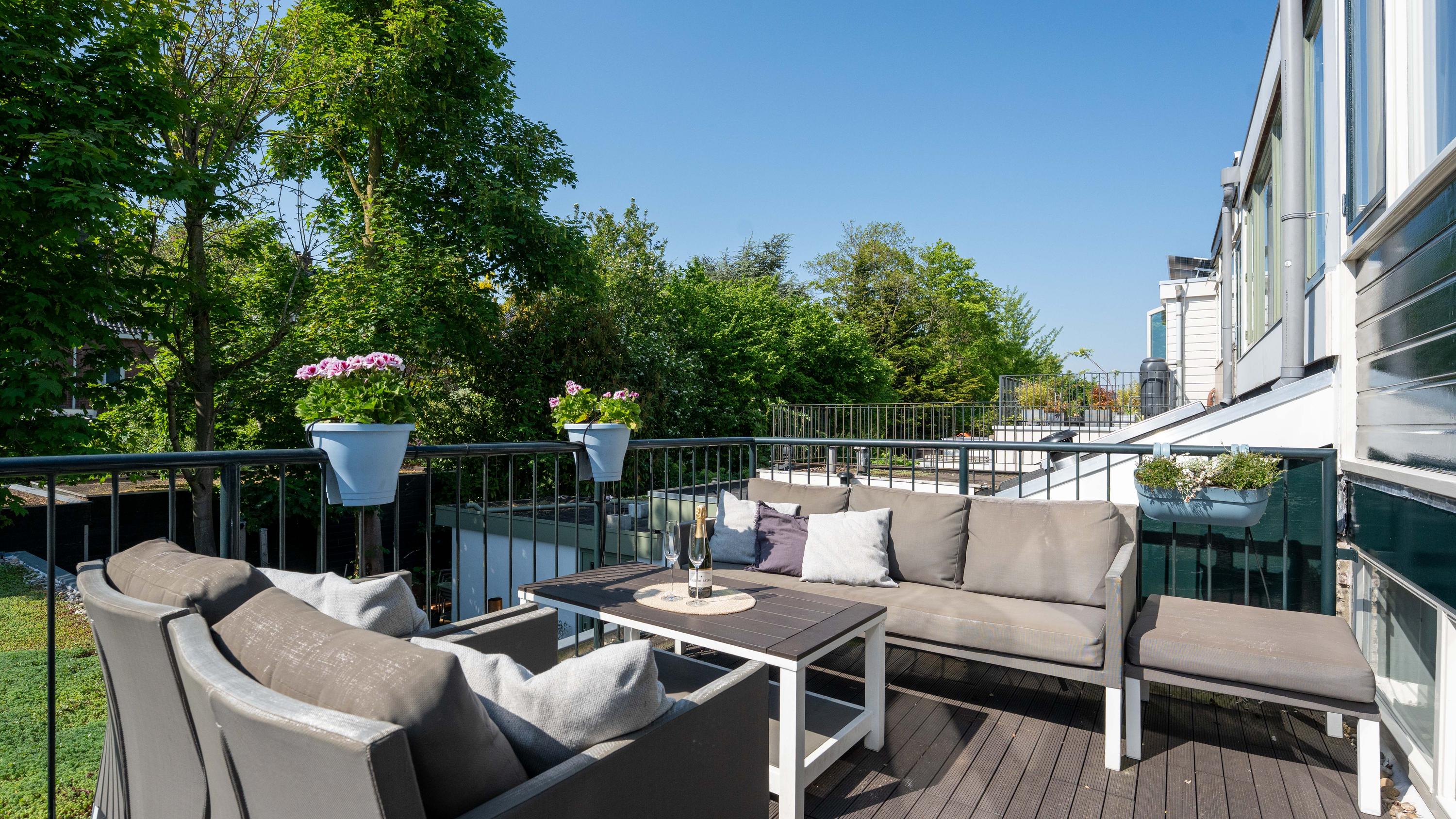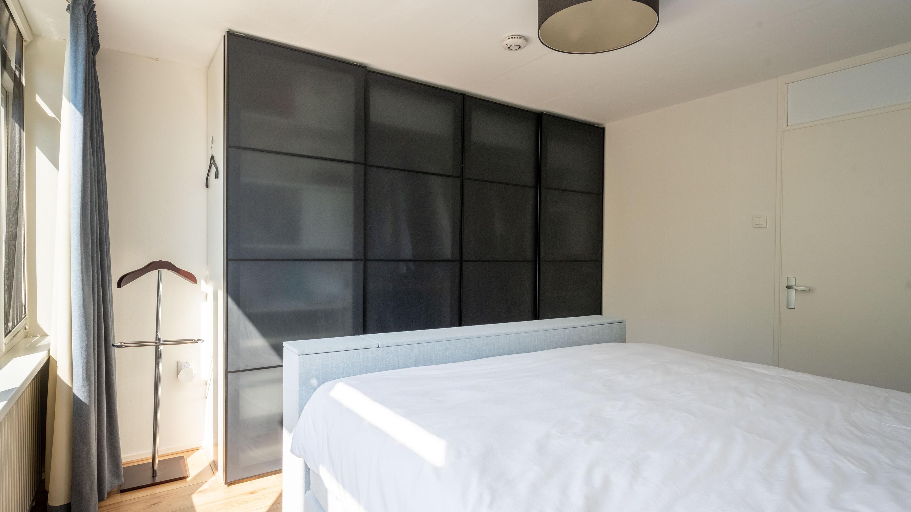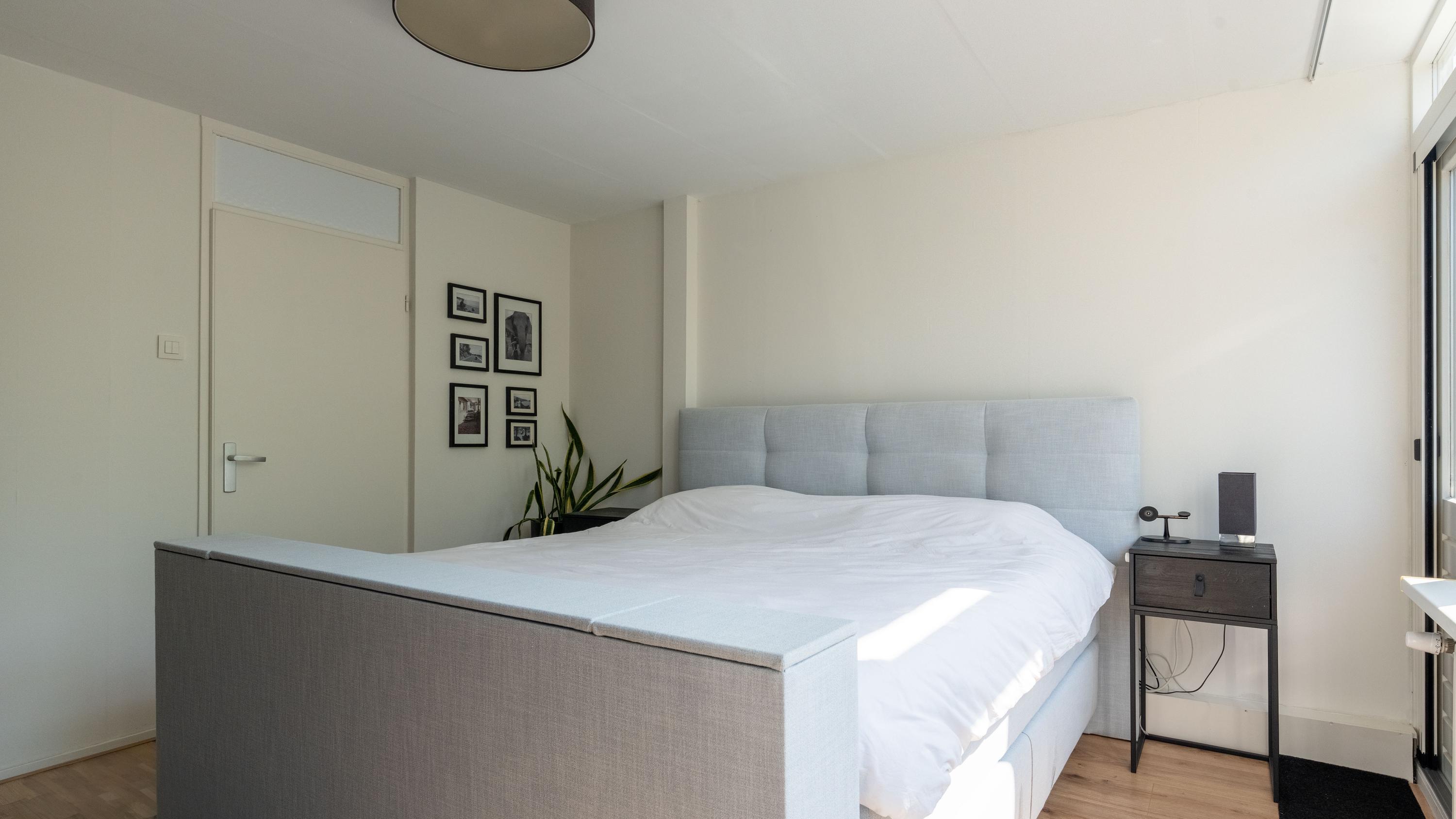 Een stijlvolle wenteltrap leidt naar de eerste etage, met een overloop waar een slimme bergkast is geïntegreerd met opstelling voor wasmachine en droger. De slaapkamer aan de voorzijde is licht en rustig gelegen. De royale slaapkamer aan de achterzijde biedt directe toegang tot een sfeervol dakterras op het noordwesten – perfect voor een avond buiten in alle rust. De moderne badkamer (2019) is voorzien van een ruime inloopdouche, zwevend toilet, wastafel met ladekast en een verlichte spiegel.