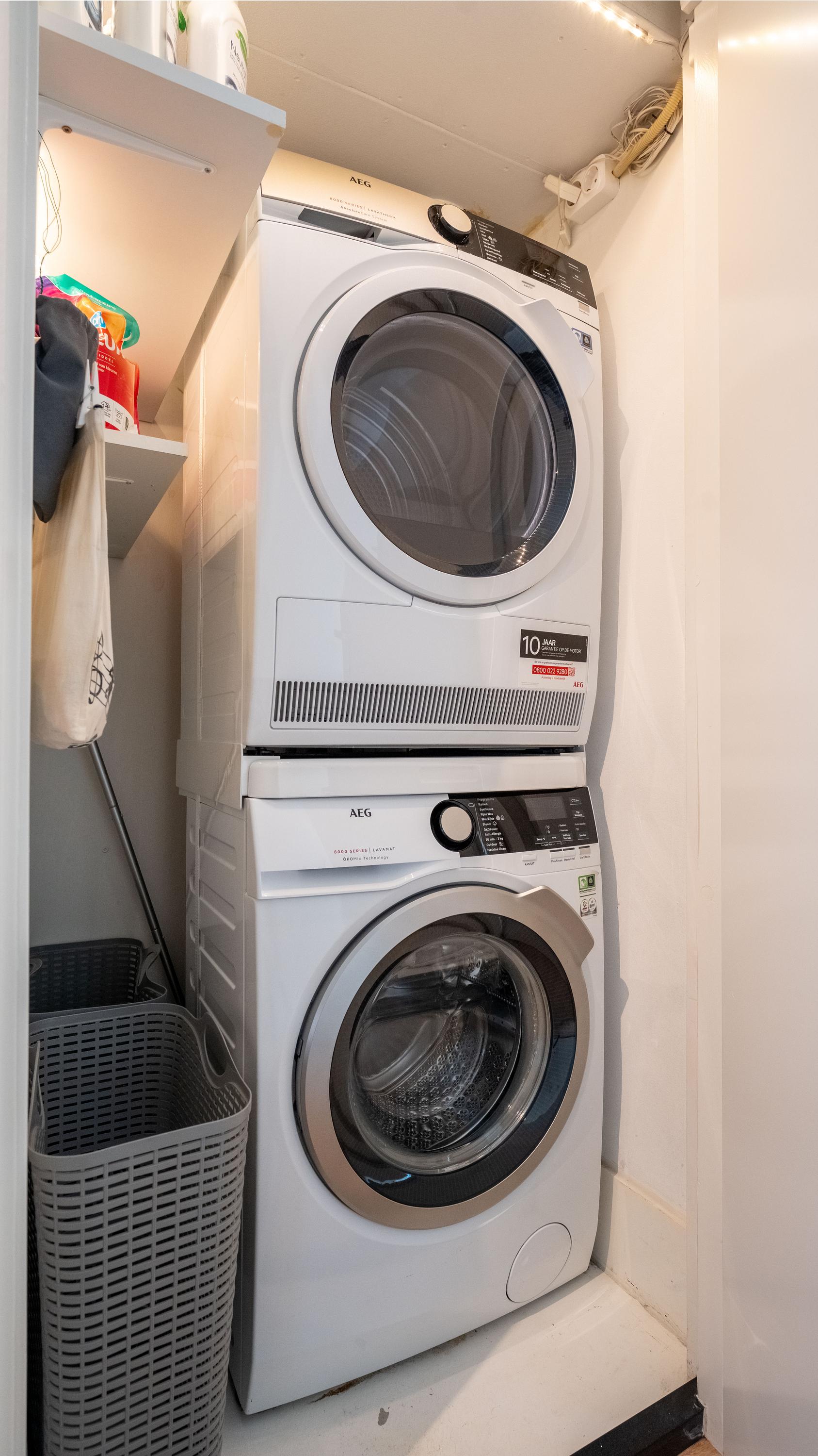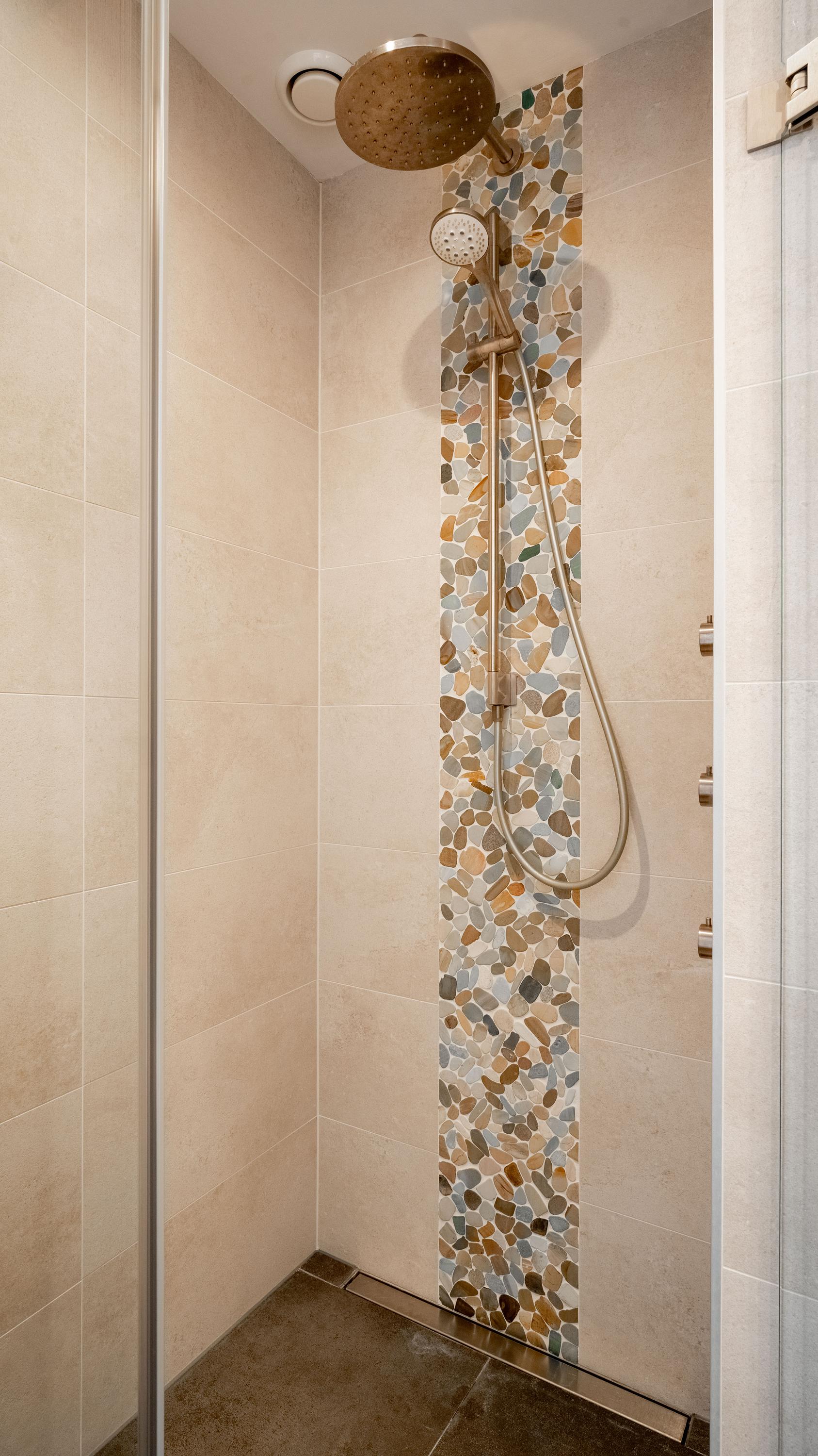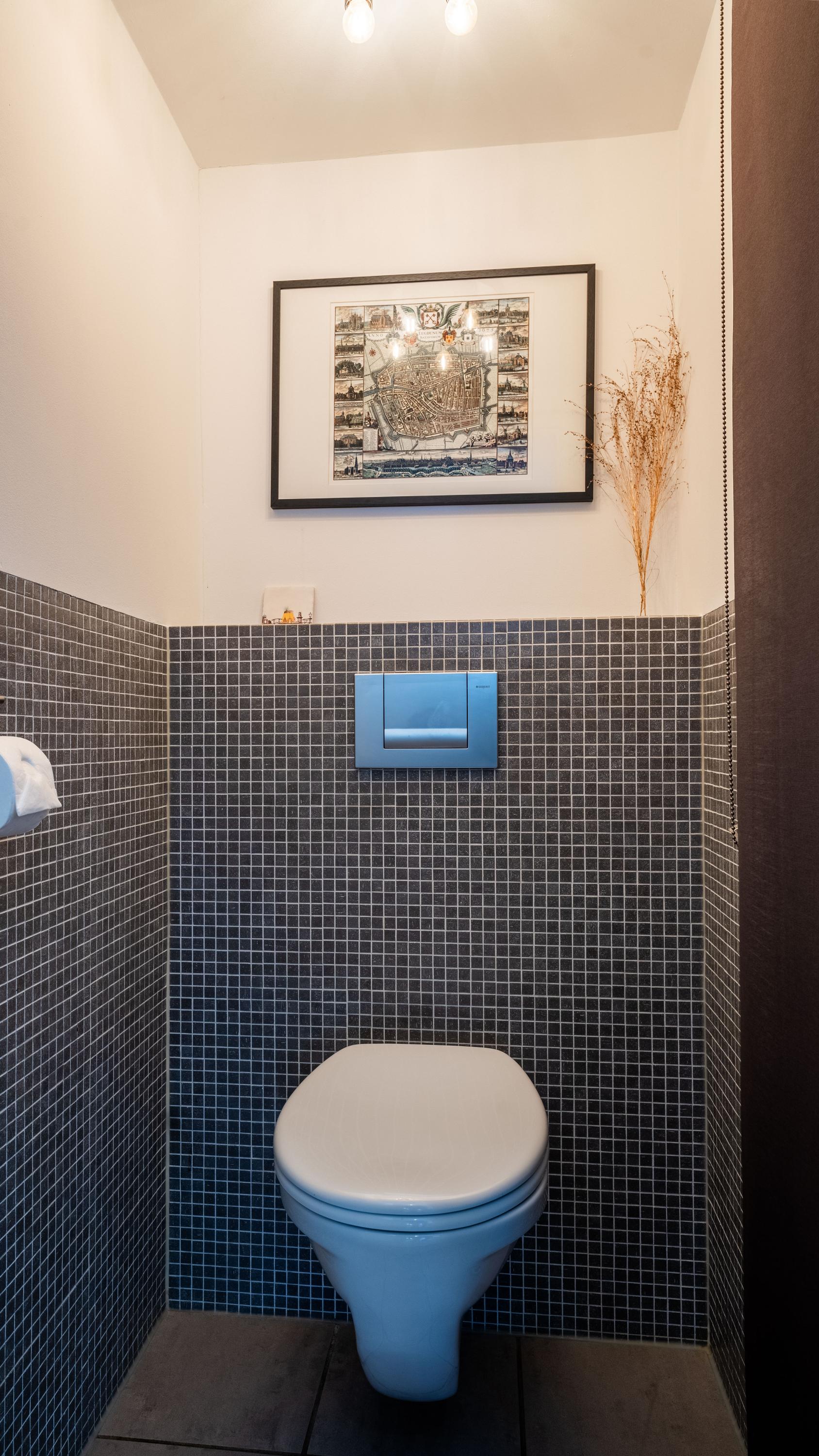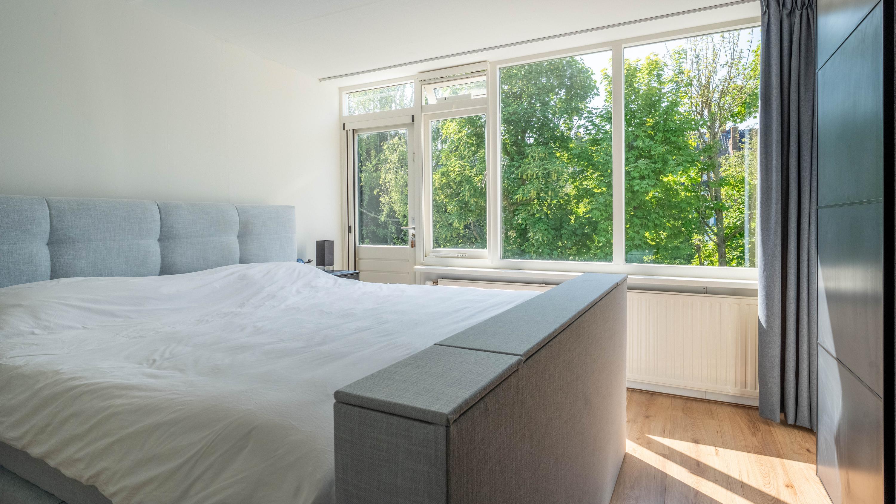 Een stijlvolle wenteltrap leidt naar de eerste etage, met een overloop waar een slimme bergkast is geïntegreerd met opstelling voor wasmachine en droger. De slaapkamer aan de voorzijde is licht en rustig gelegen. De royale slaapkamer aan de achterzijde biedt directe toegang tot een sfeervol dakterras op het noordwesten – perfect voor een avond buiten in alle rust. De moderne badkamer (2019) is voorzien van een ruime inloopdouche, zwevend toilet, wastafel met ladekast en een verlichte spiegel.