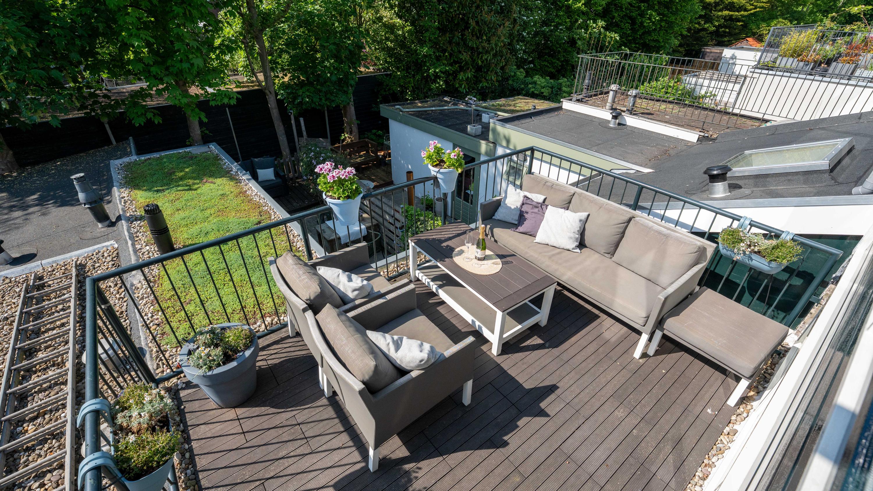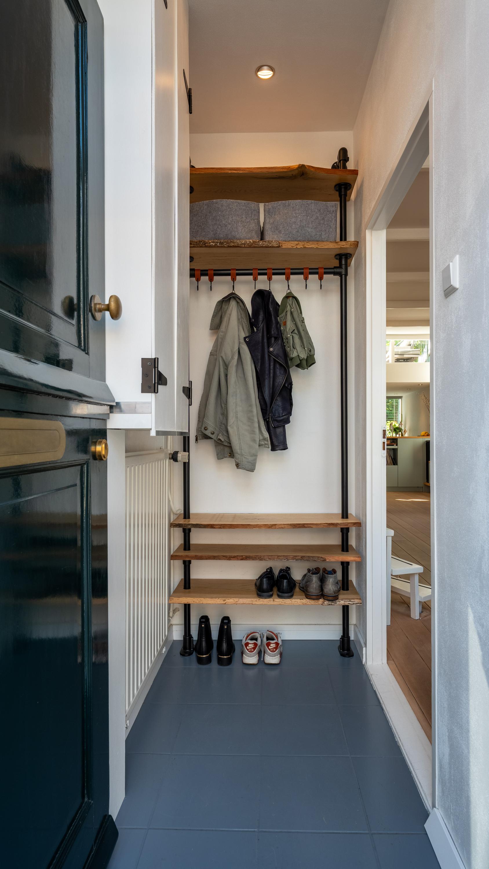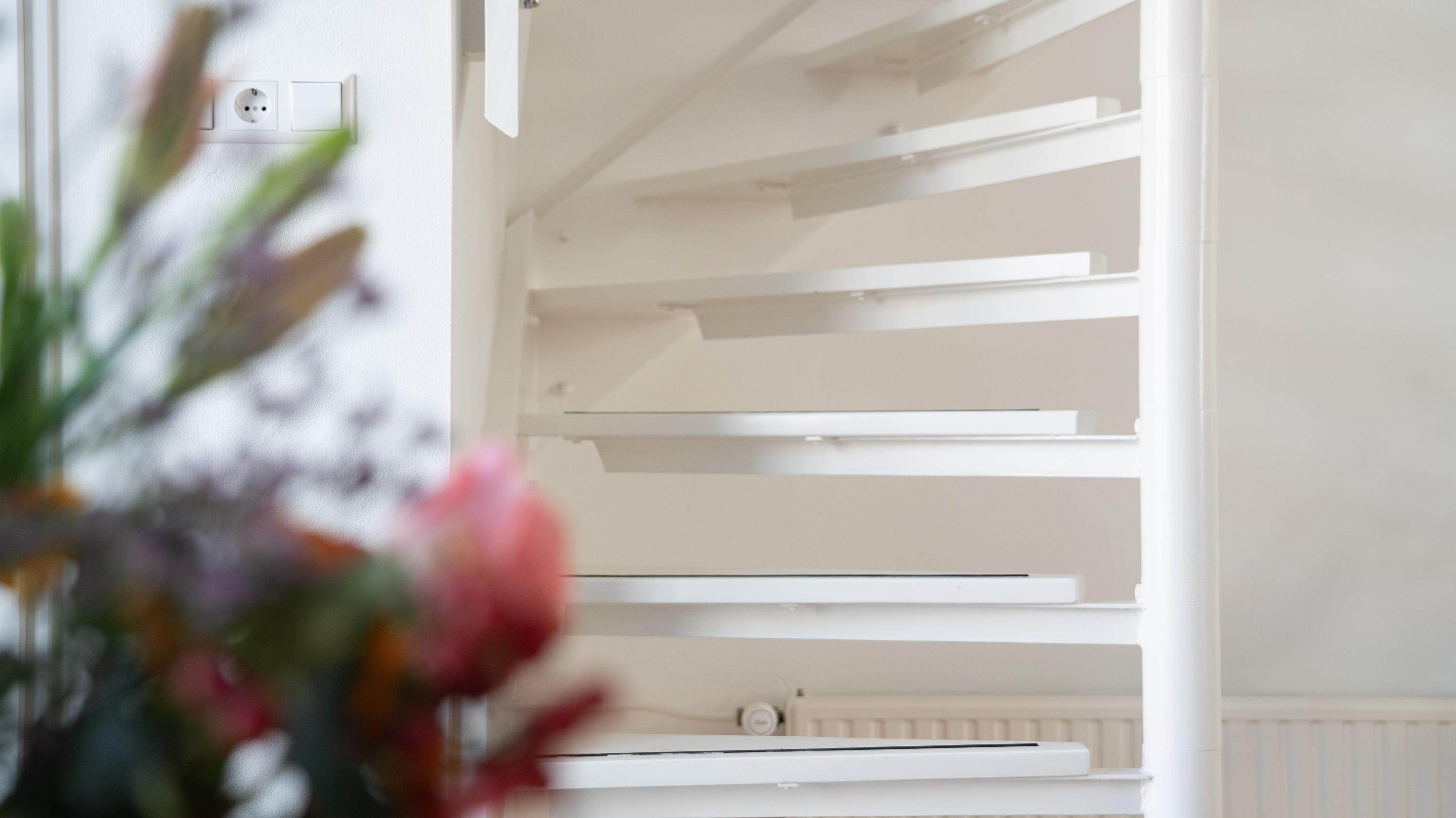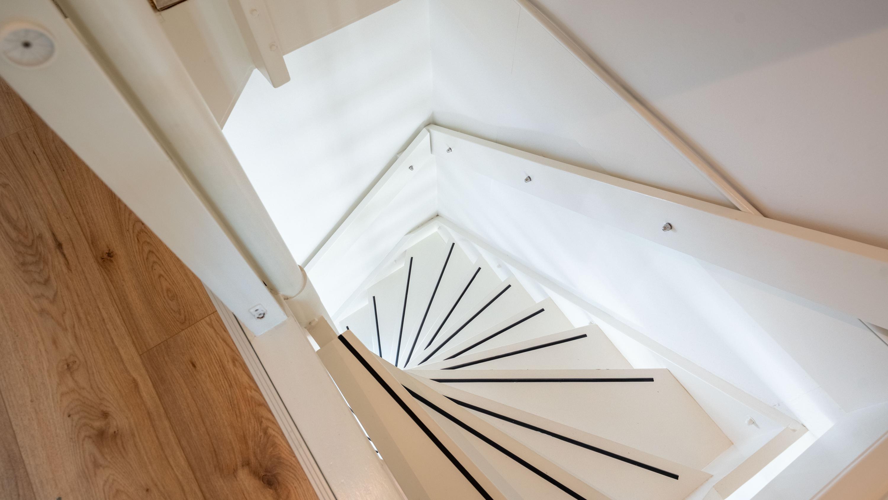 Een stijlvolle wenteltrap leidt naar de eerste etage, met een overloop waar een slimme bergkast is geïntegreerd met opstelling voor wasmachine en droger. De slaapkamer aan de voorzijde is licht en rustig gelegen. De royale slaapkamer aan de achterzijde biedt directe toegang tot een sfeervol dakterras op het noordwesten – perfect voor een avond buiten in alle rust. De moderne badkamer (2019) is voorzien van een ruime inloopdouche, zwevend toilet, wastafel met ladekast en een verlichte spiegel.