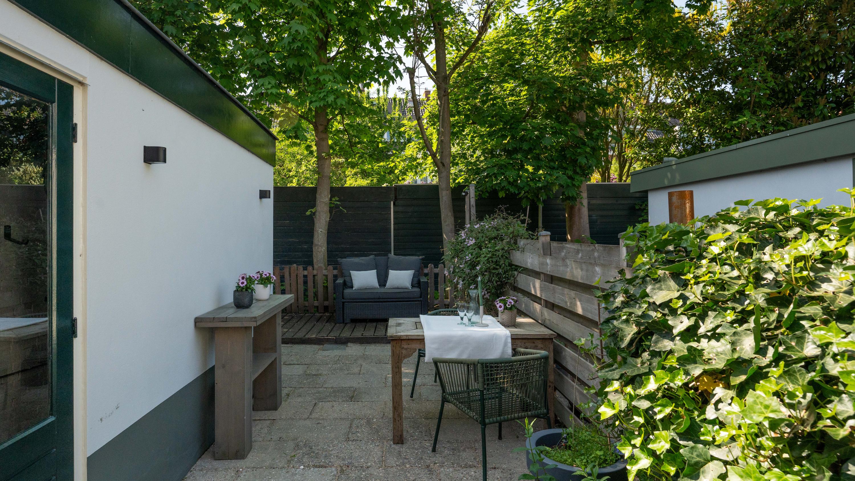 Prettige, schaduwrijke achtertuin met aangebouwde stenen schuur en achterom