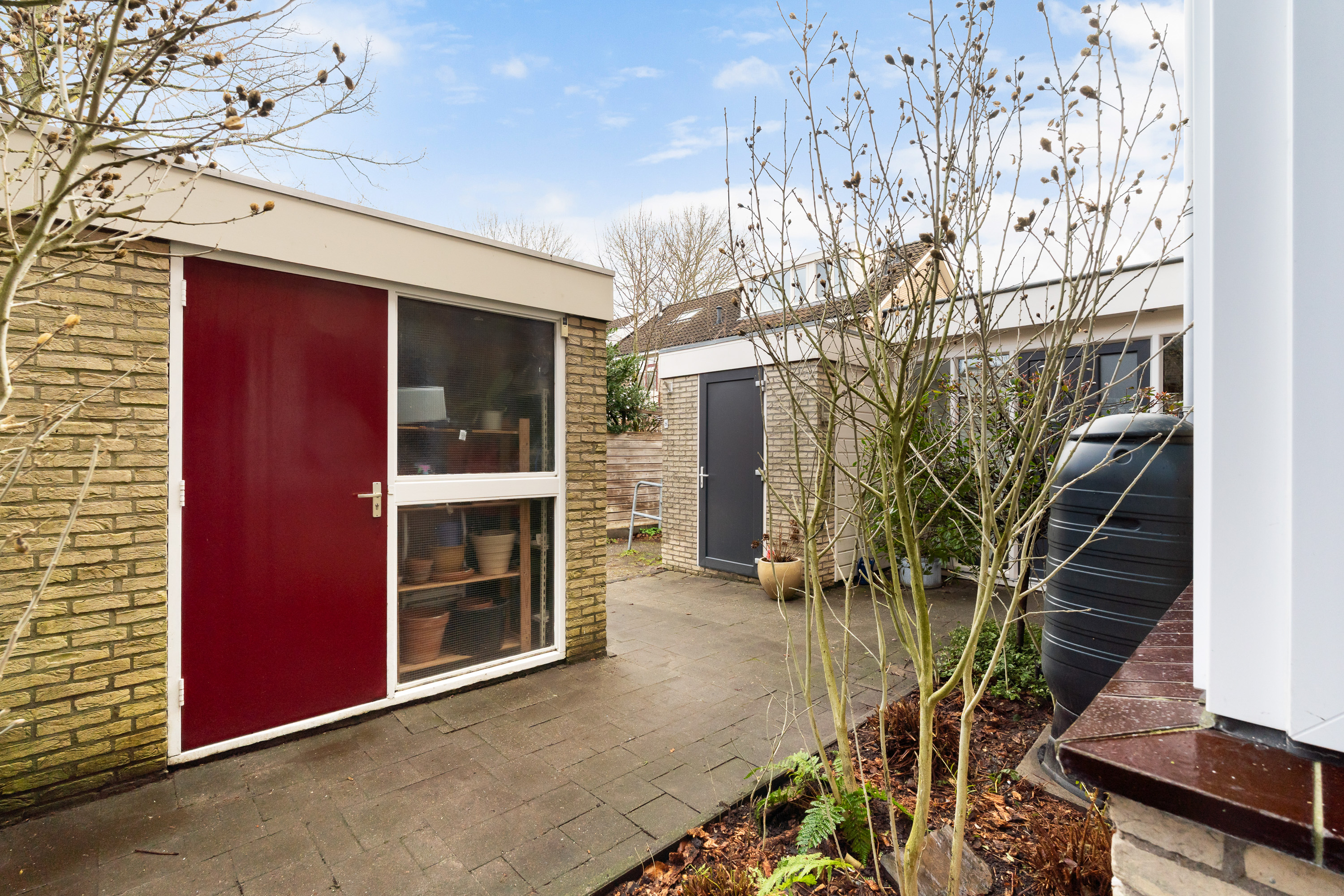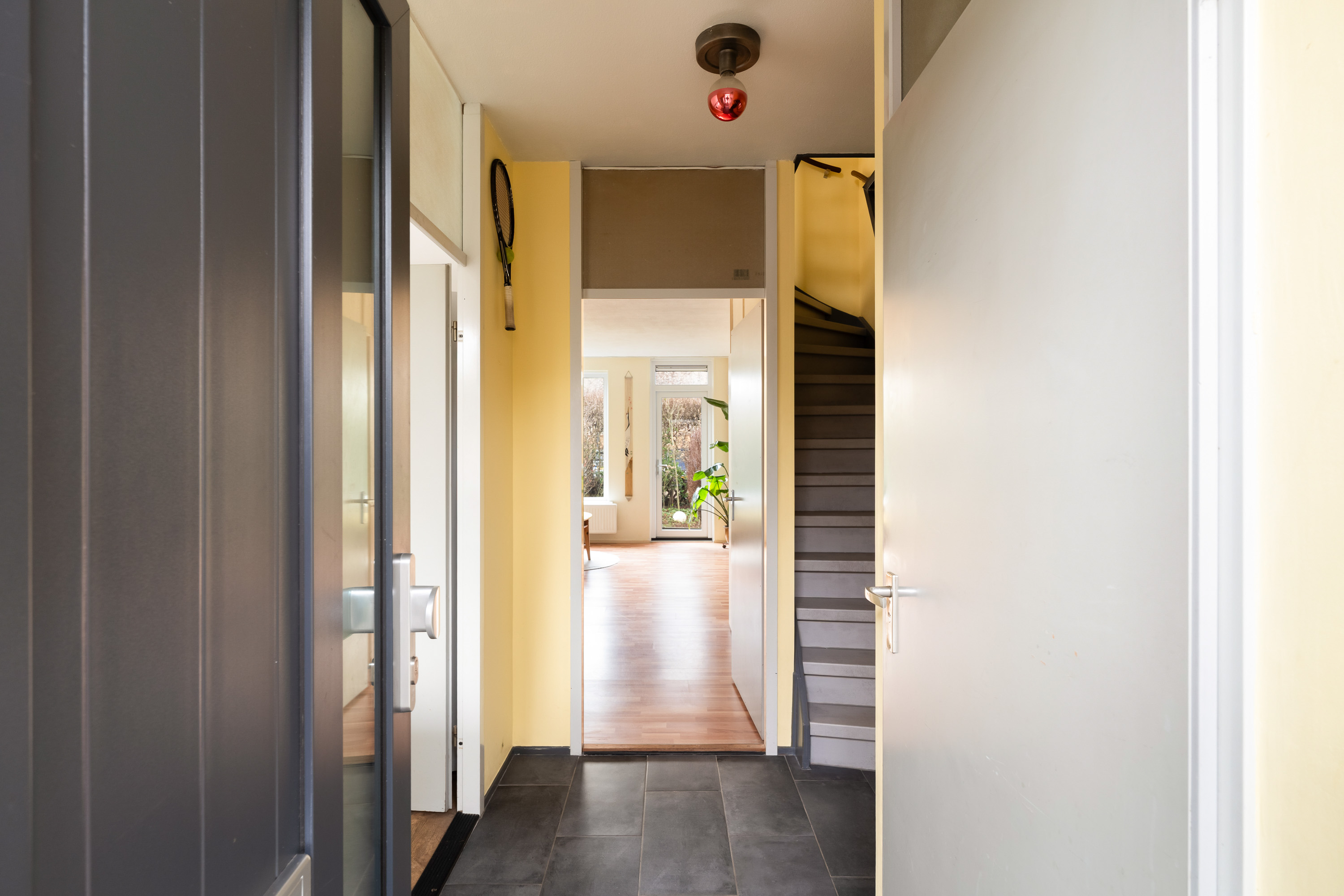 Vanaf de rustige, autoluwe straat is de entree van de woning door de aparte schuur onttrokken aan het directe zicht vanaf de stoep en geeft toegang tot de centrale hal waarvandaan het gastentoilet alsmede de keuken en woonkamer bereikbaar zijn.