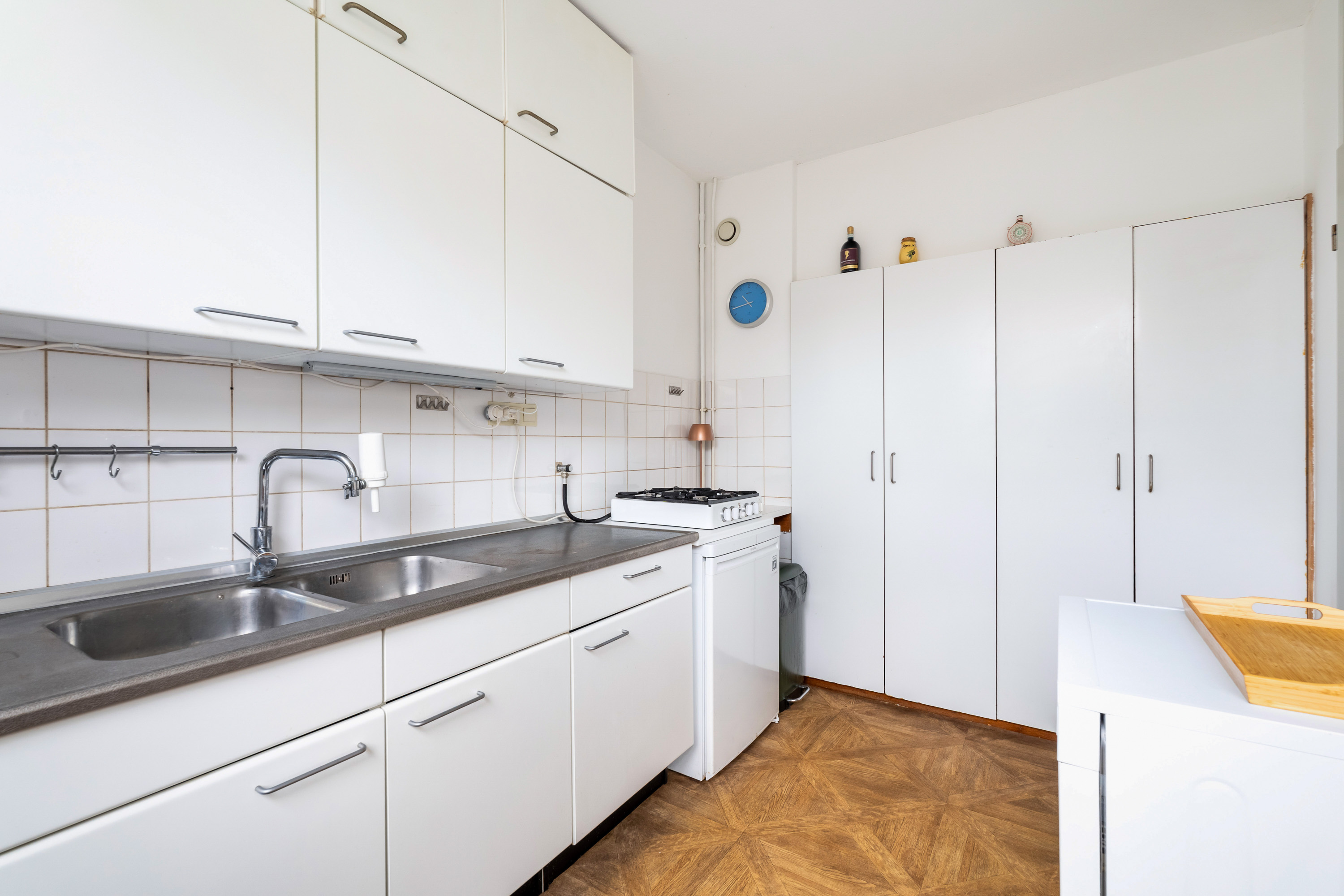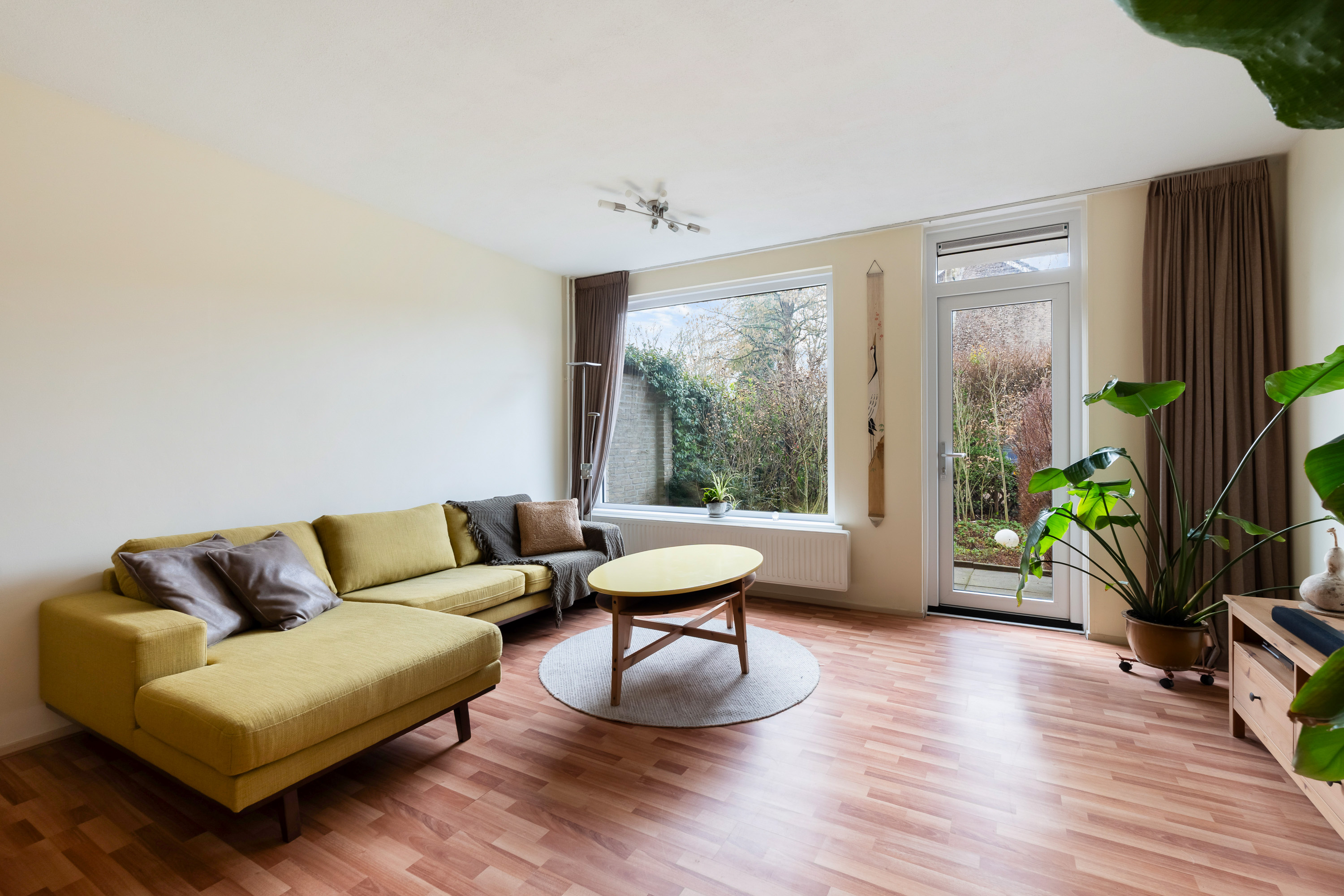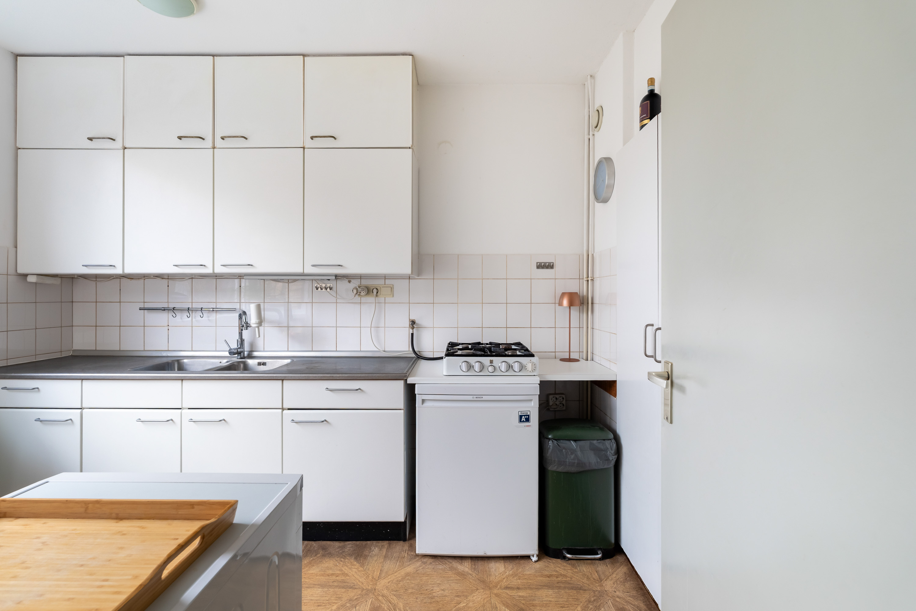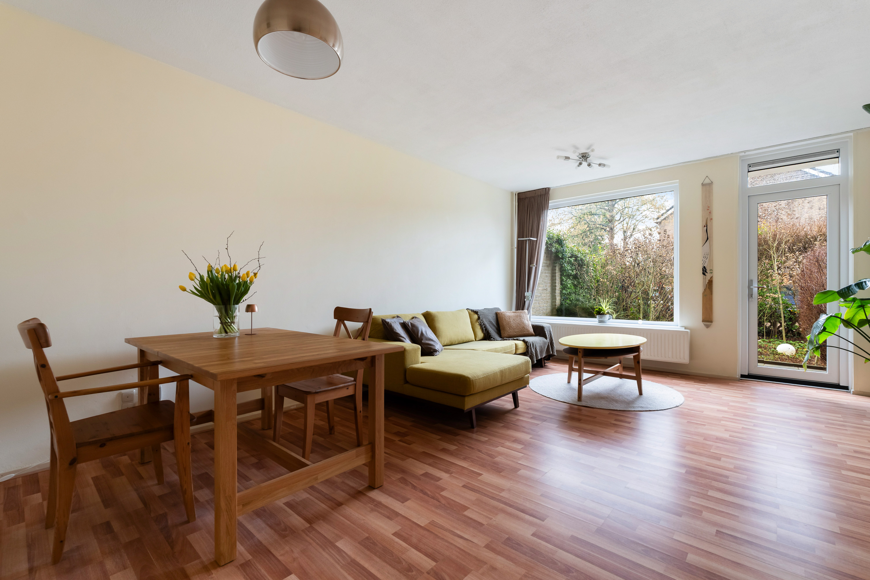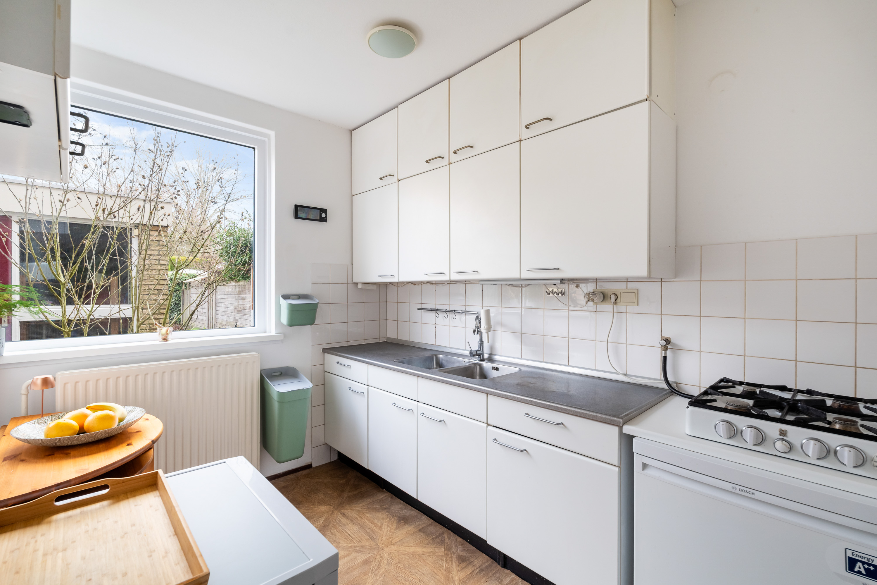 De lekker gelegen woonkamer is licht en geeft direct zicht op en toegang tot de groene en goed onderhouden achtertuin gelegen op het Zuidwesten. De vaste kast biedt ruimte voor opslag. De keuken is eenvoudig en separaat.