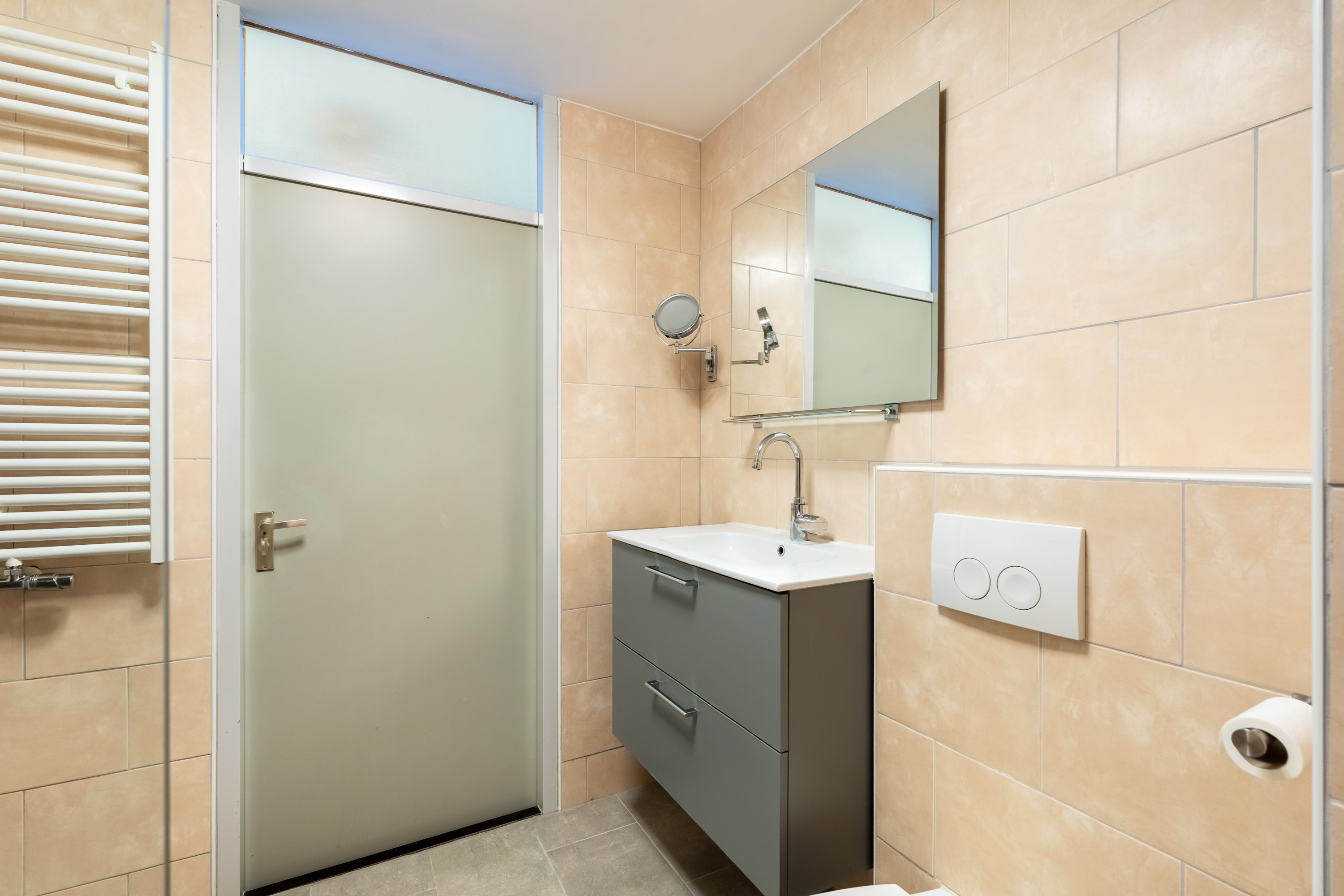 De strakke en moderne badkamer is voorzien van een brede wastafel met badmeubel, toilet en wandkast alsmede een ruime inloopdouche.
