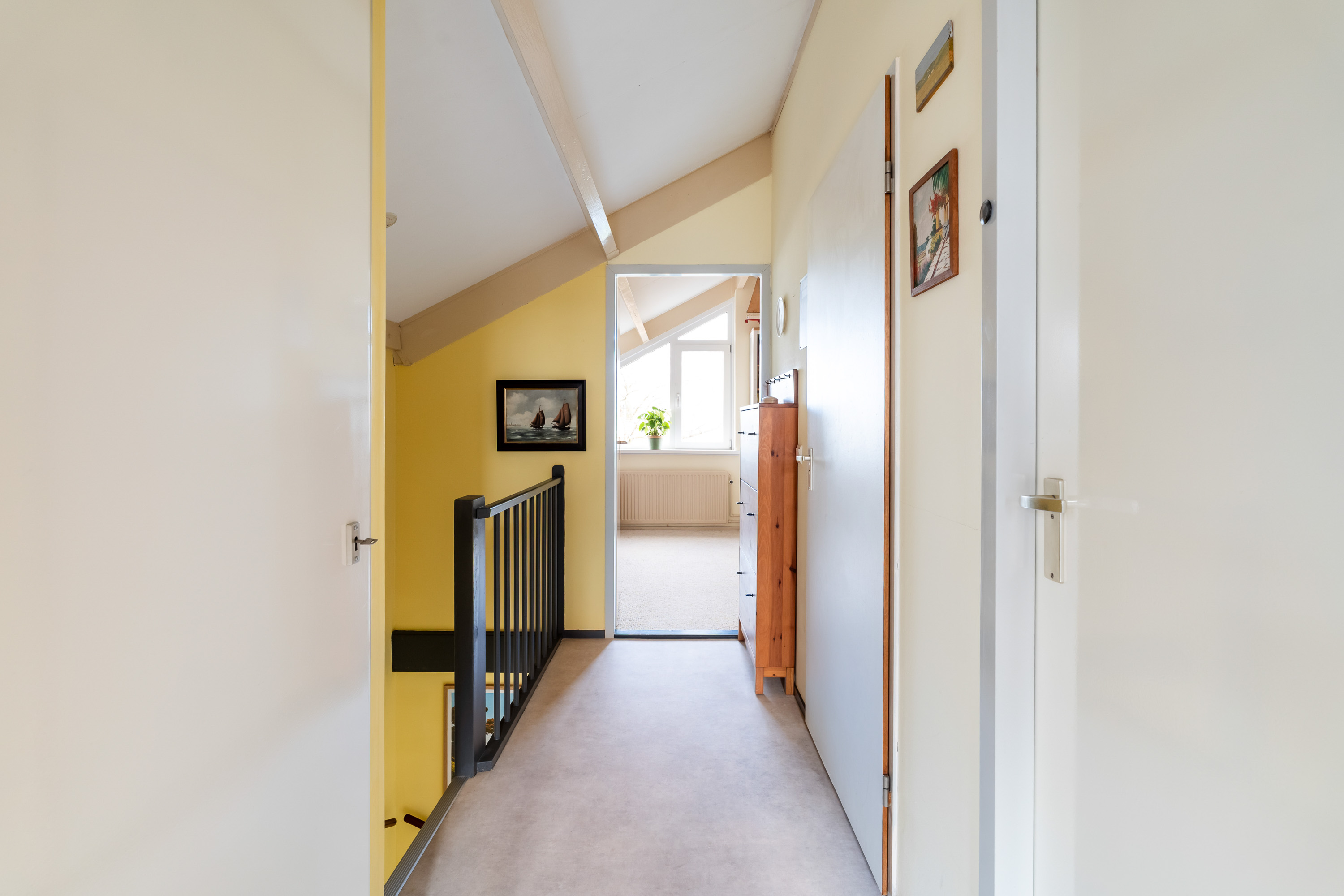 Middels de centrale trap zijn op de eerste etage twee ruime slaapkamers en de 1e badkamer te vinden. De slaapkamer aan de achterzijde biedt tevens toegang tot een eigen balkonnetje en sfeervol zicht op de eigen tuin en groene omgeving.