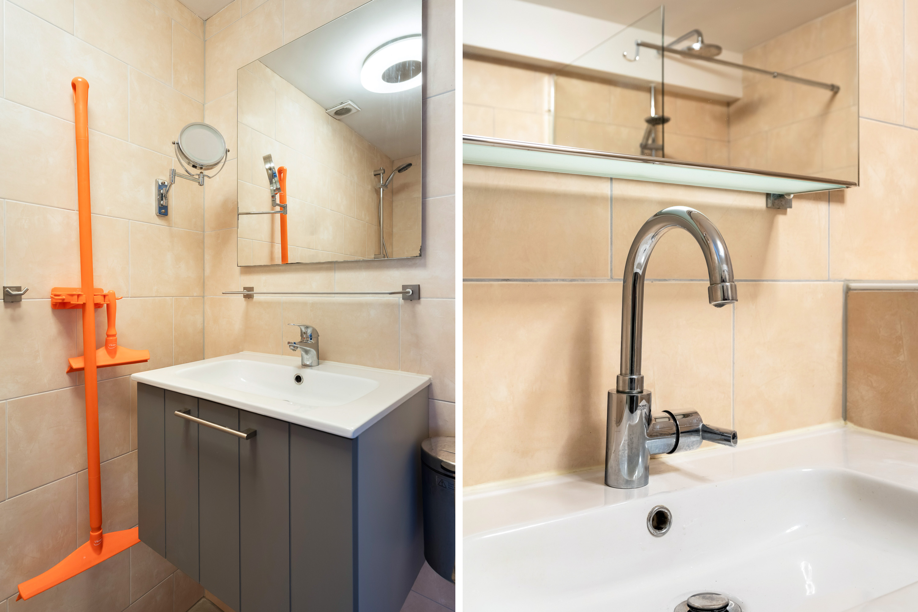 Op de tweede etage treffen we nog eens twee goede slaapkamers aan, een technische ruimte met wasmachine opstelling én een tweede badkamer in dezelfde moderne stijl als de eerste en voorziet in een douche en wastafel met lademeubel.