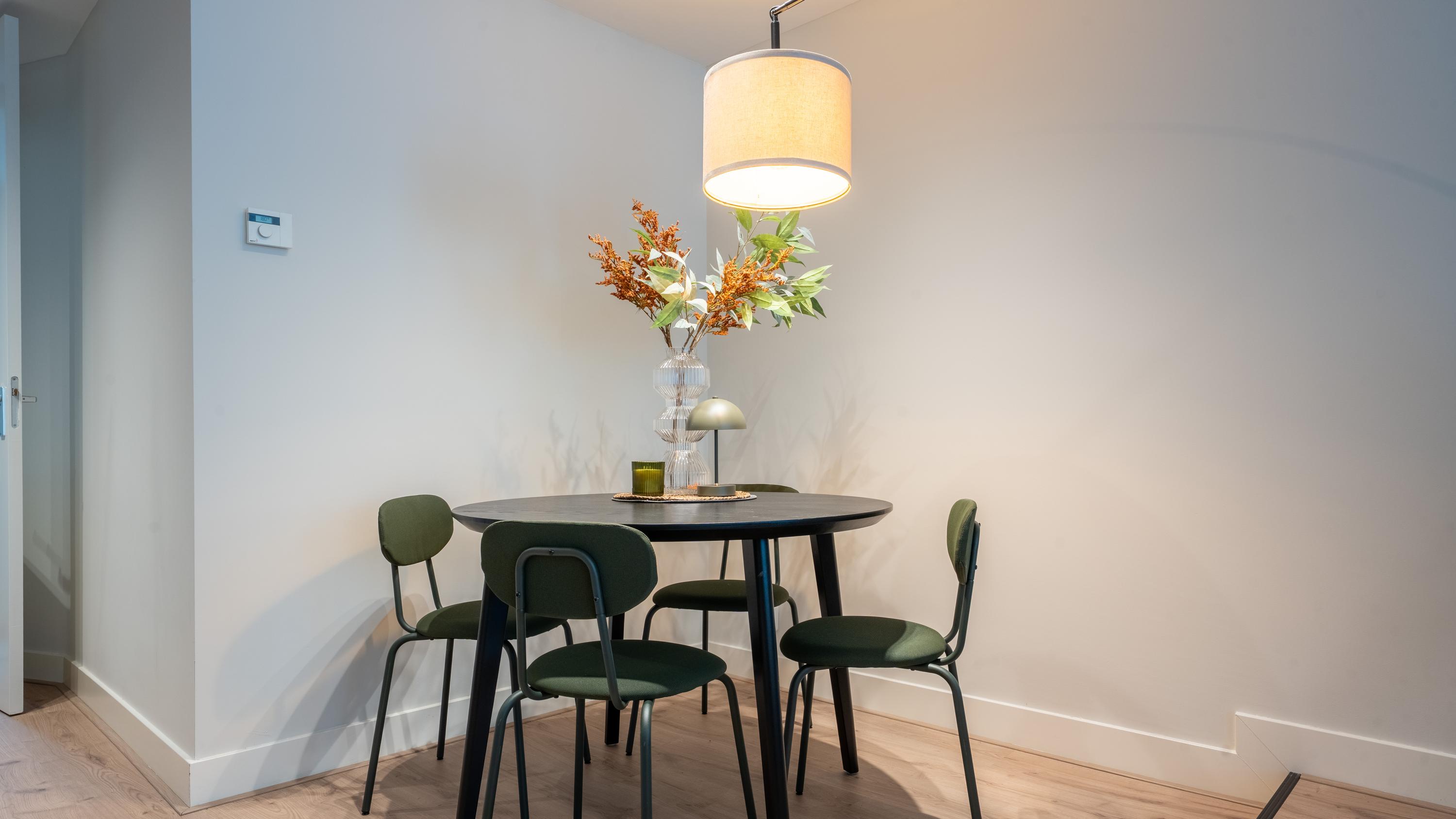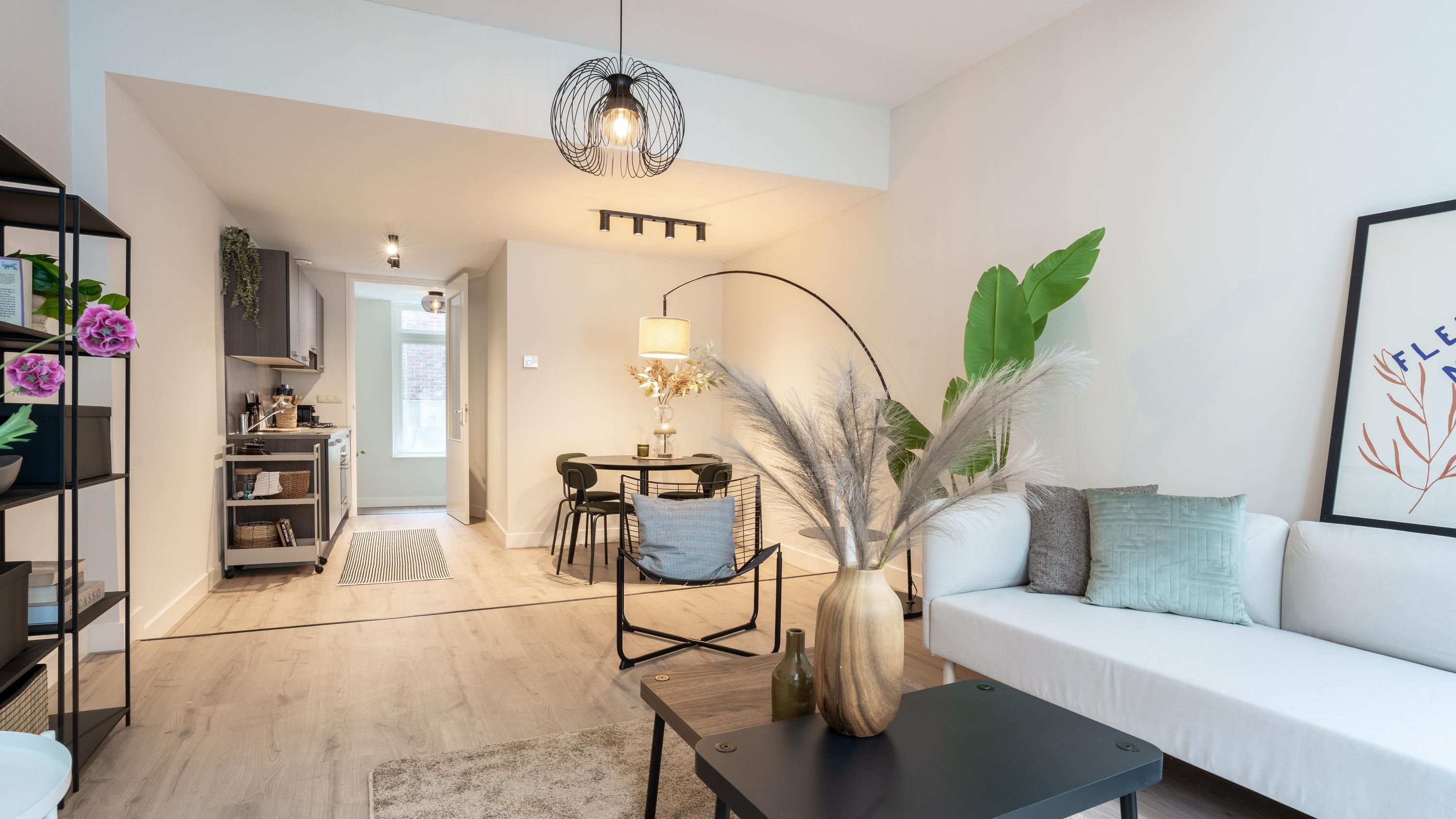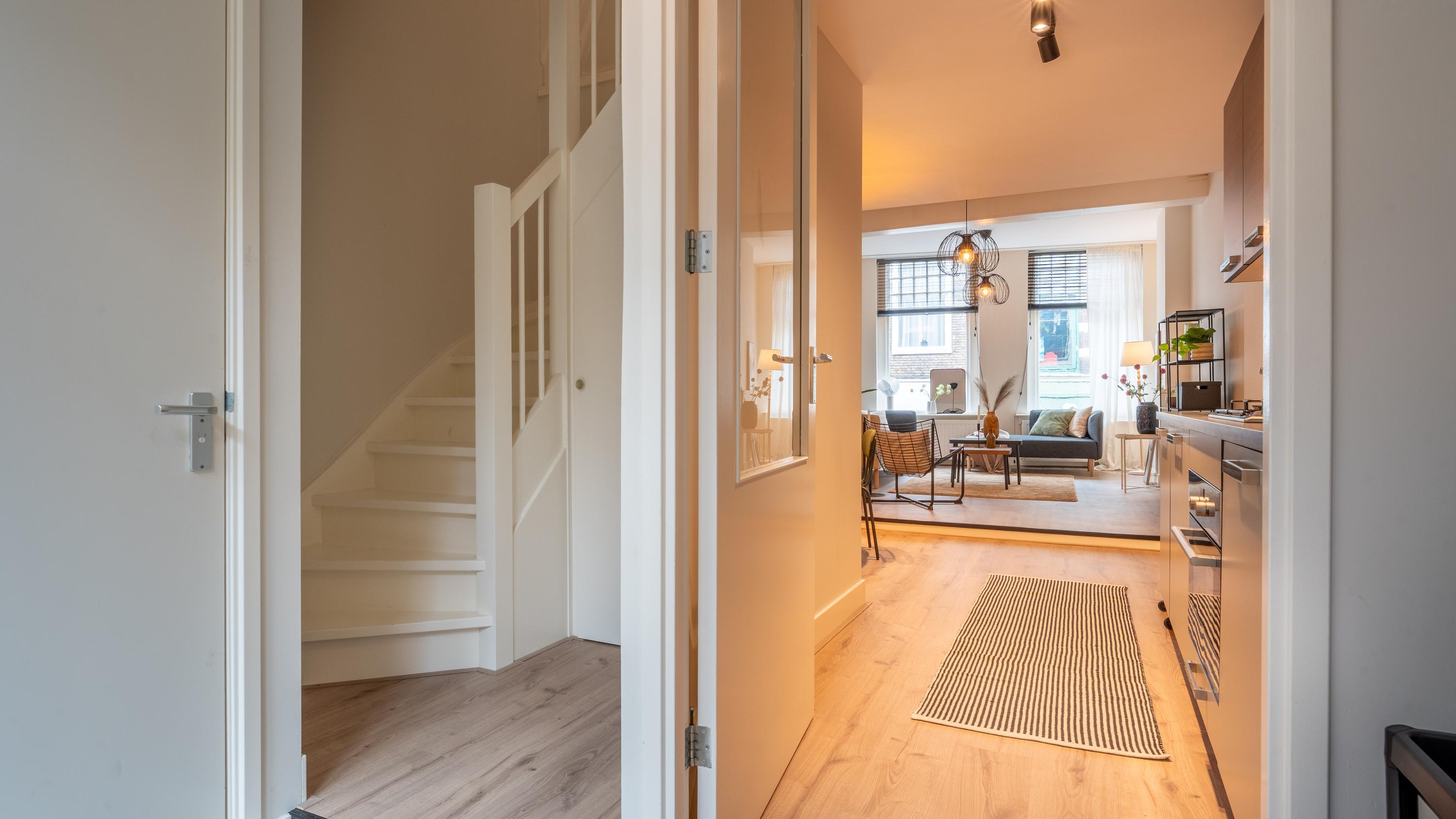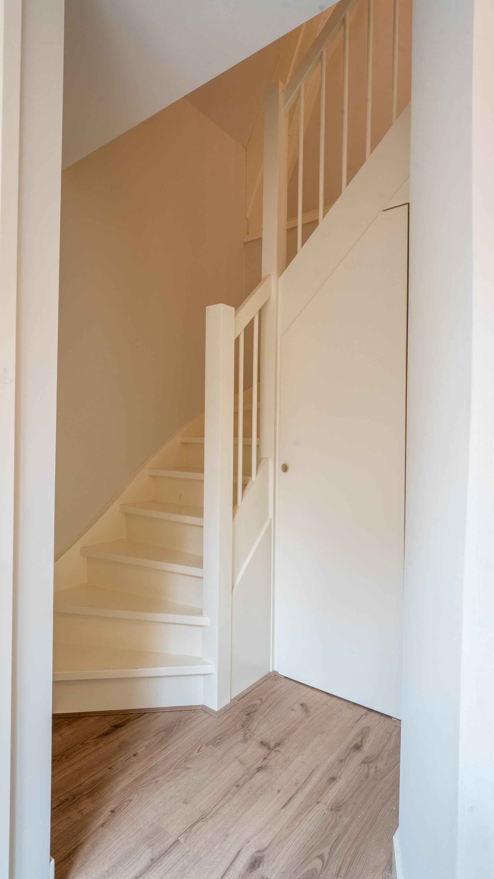 De entreehal op de eerste verdieping is praktisch ingedeeld met een meterkast, separaat toilet en trapkast voor extra opbergruimte. De moderne keuken is strak afgewerkt en voorzien van hoogwaardige inbouwapparatuur, waaronder een koelkast, vaatwasser, inductiekookplaat en afzuigkap. Vanuit de keuken loop je door naar de ruime living, waar een gezellige eethoek en een lichte, sfeervolle zitkamer samenkomen tot een heerlijke leefruimte.