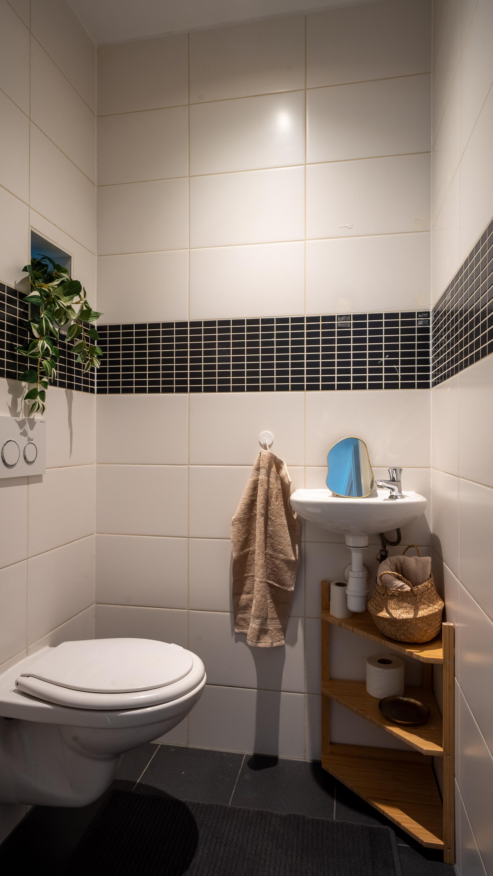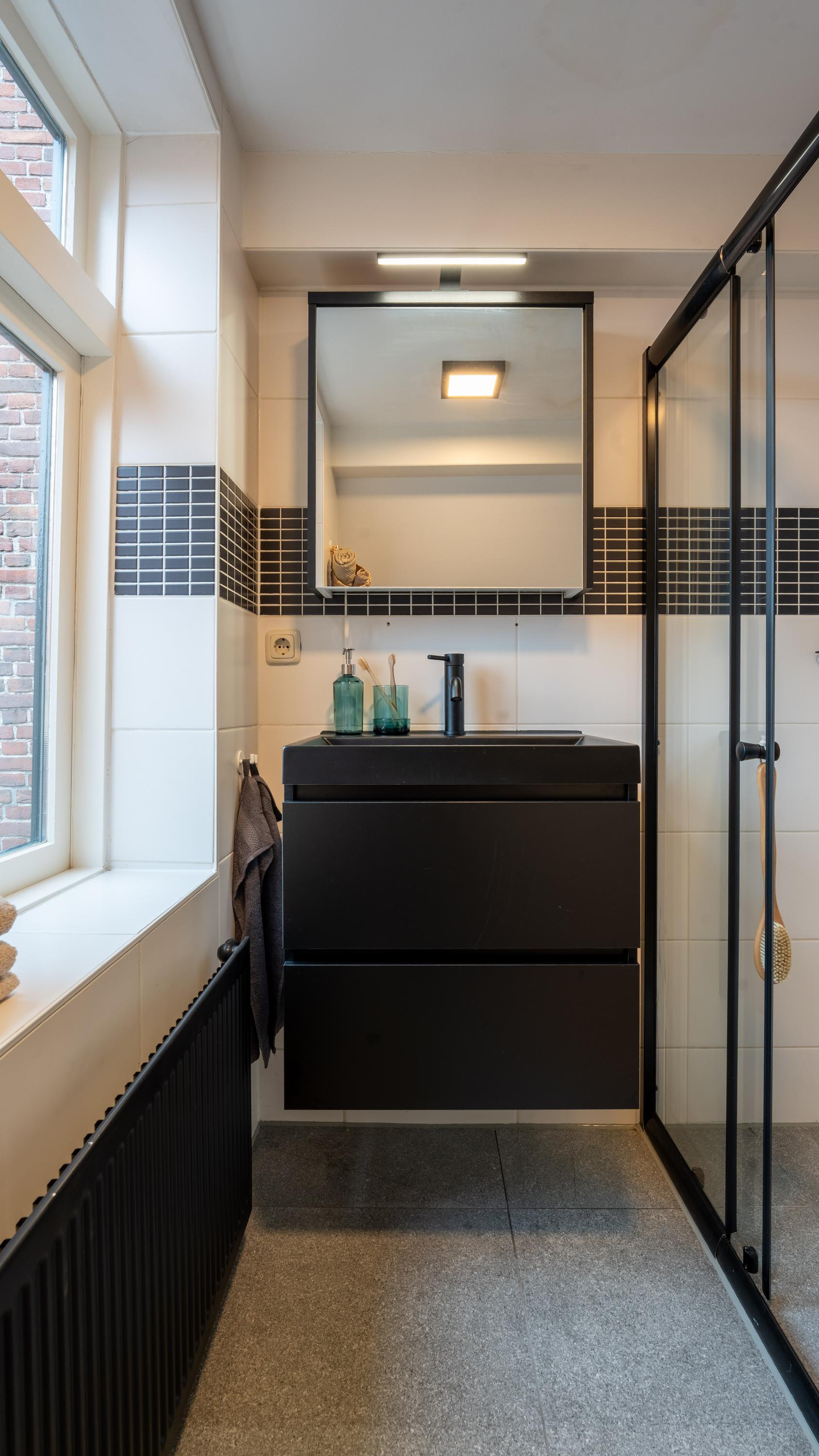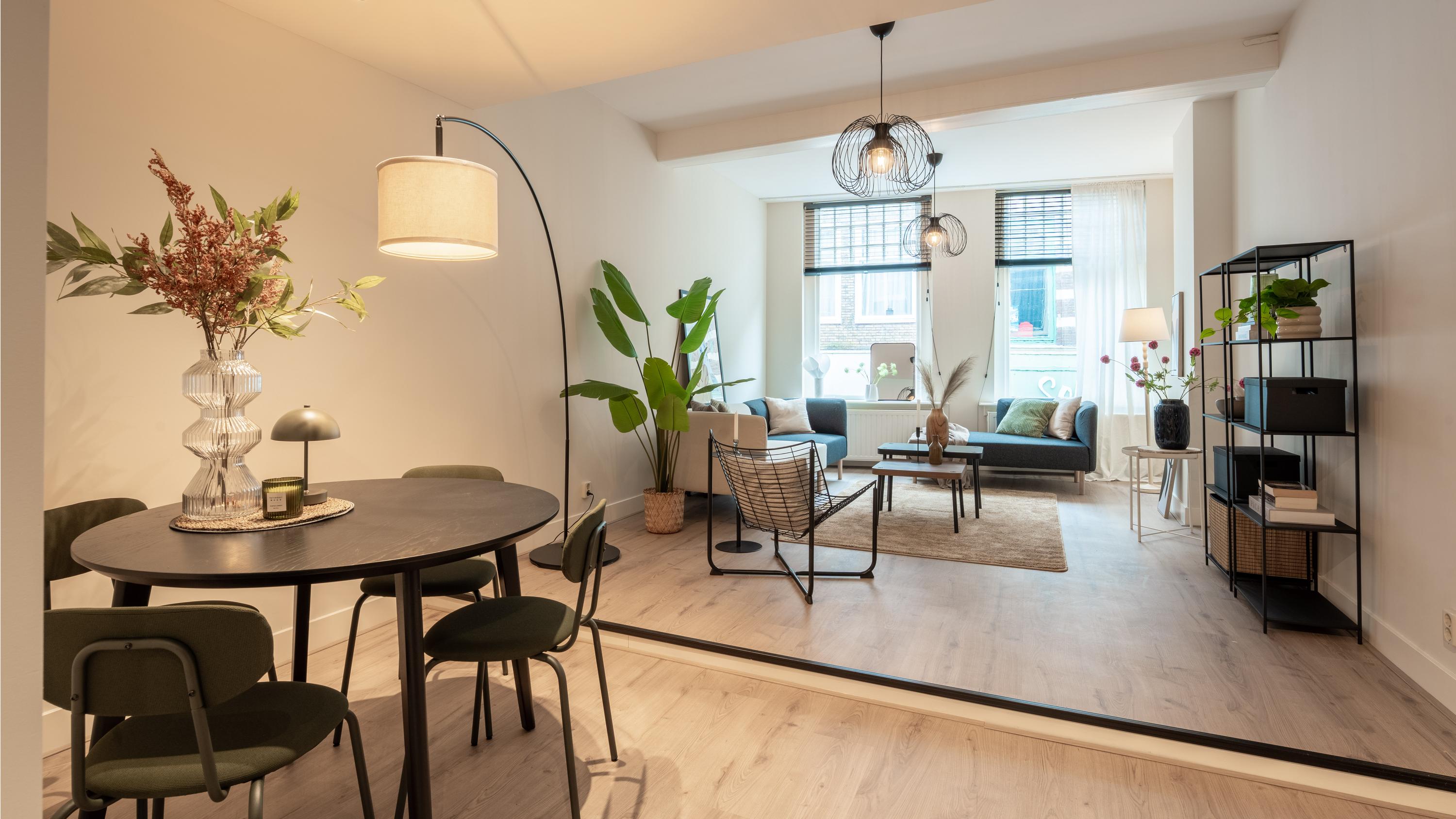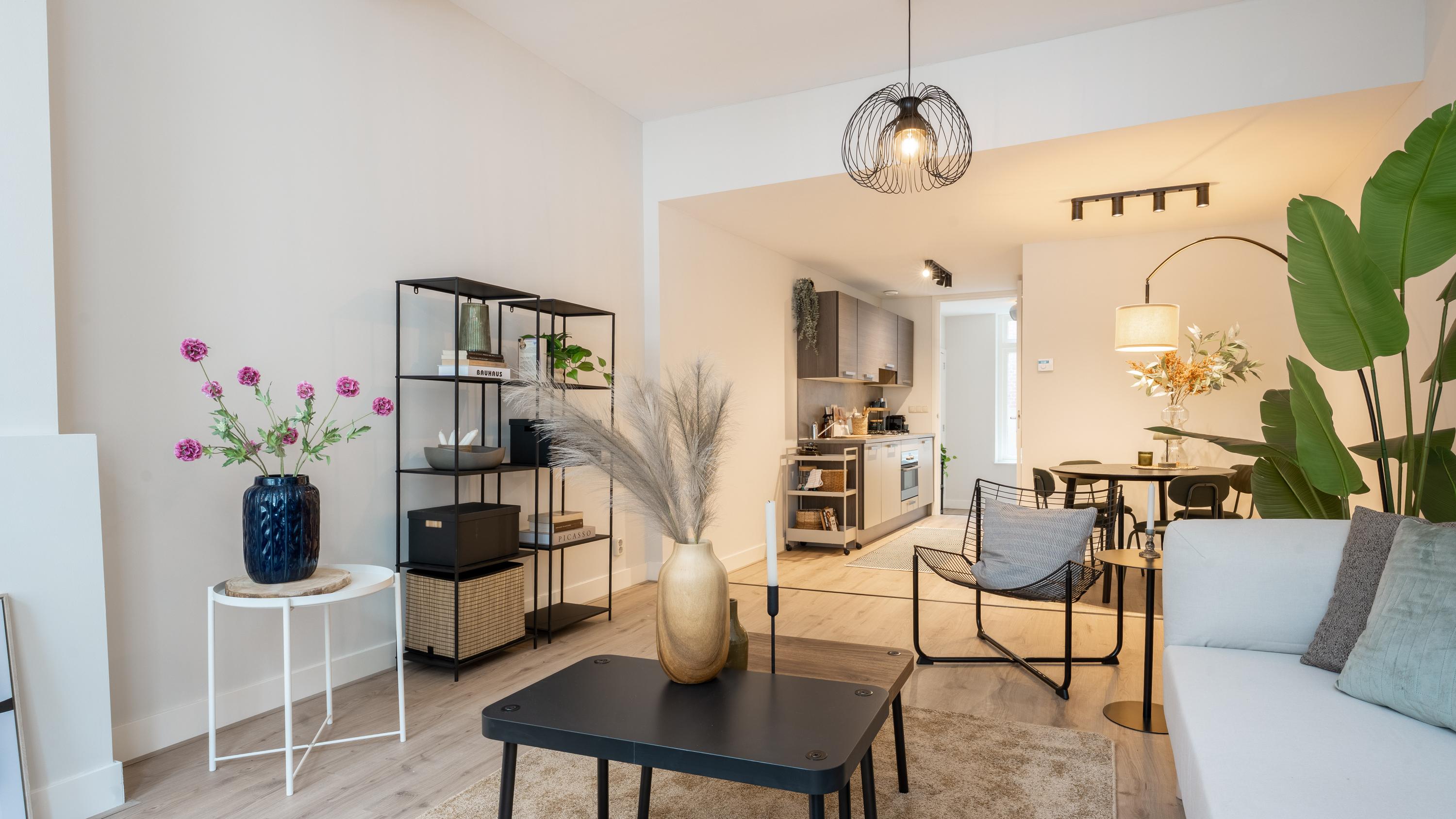 De entreehal op de eerste verdieping is praktisch ingedeeld met een meterkast, separaat toilet en trapkast voor extra opbergruimte. De moderne keuken is strak afgewerkt en voorzien van hoogwaardige inbouwapparatuur, waaronder een koelkast, vaatwasser, inductiekookplaat en afzuigkap. Vanuit de keuken loop je door naar de ruime living, waar een gezellige eethoek en een lichte, sfeervolle zitkamer samenkomen tot een heerlijke leefruimte.
