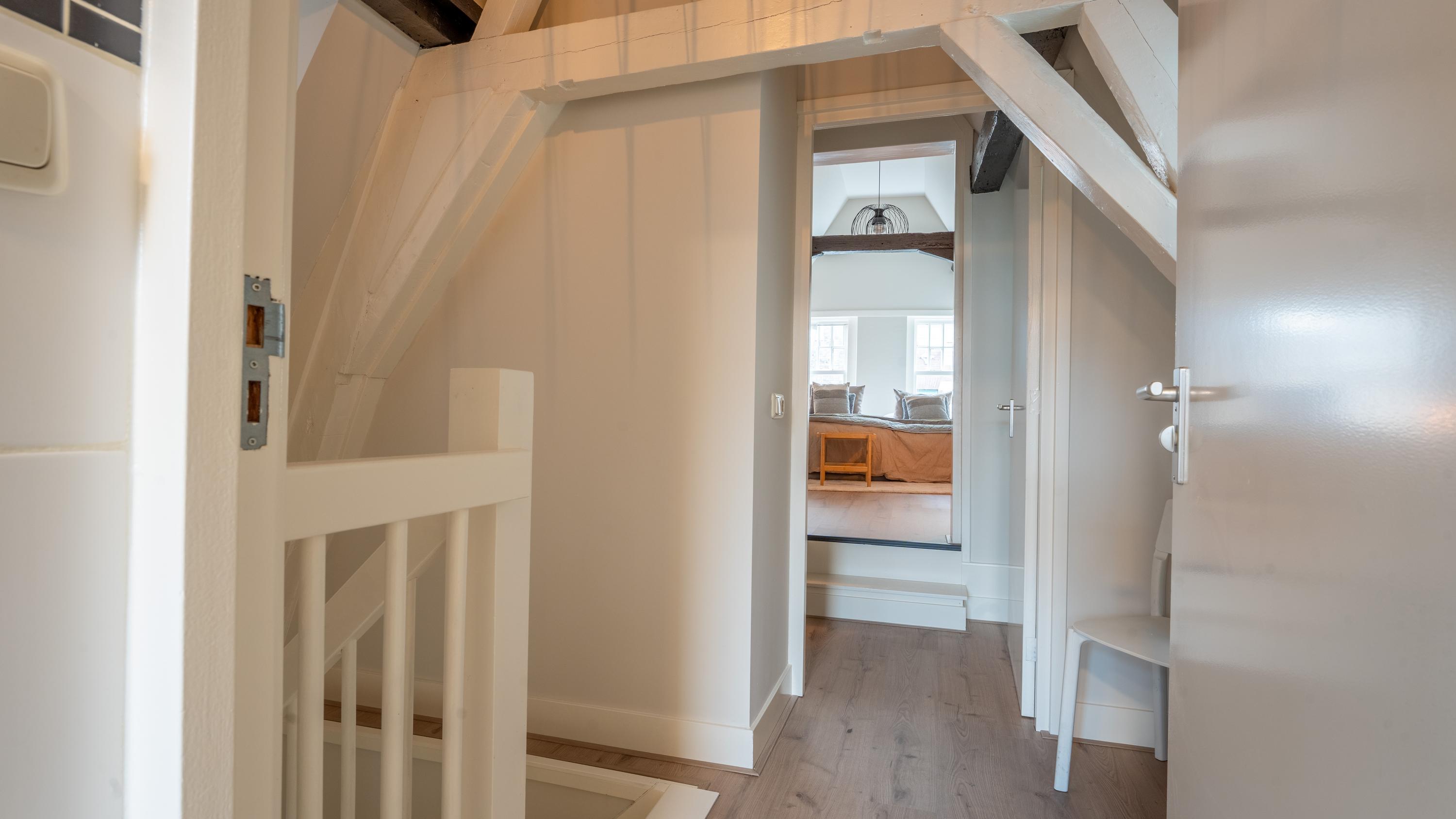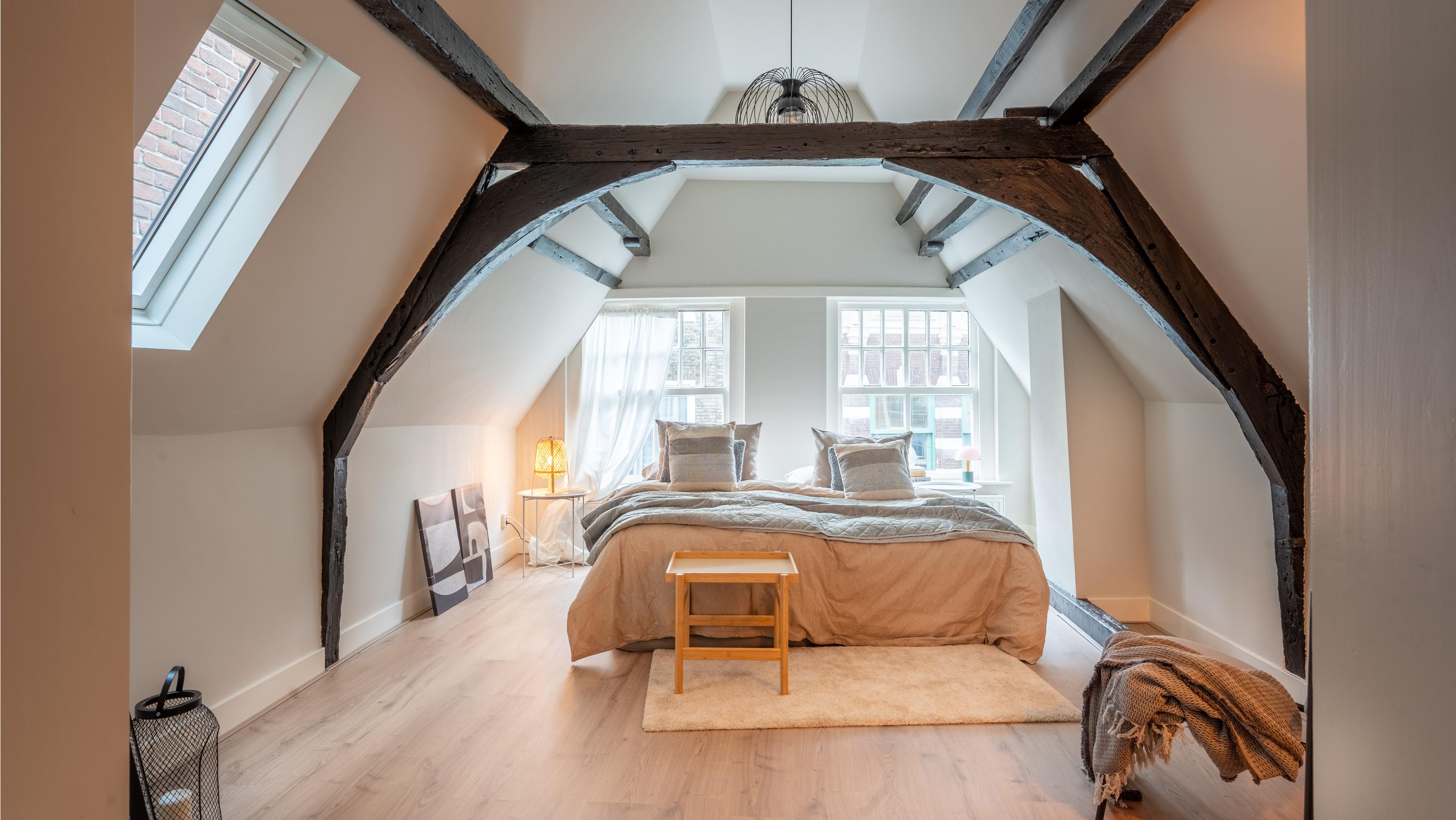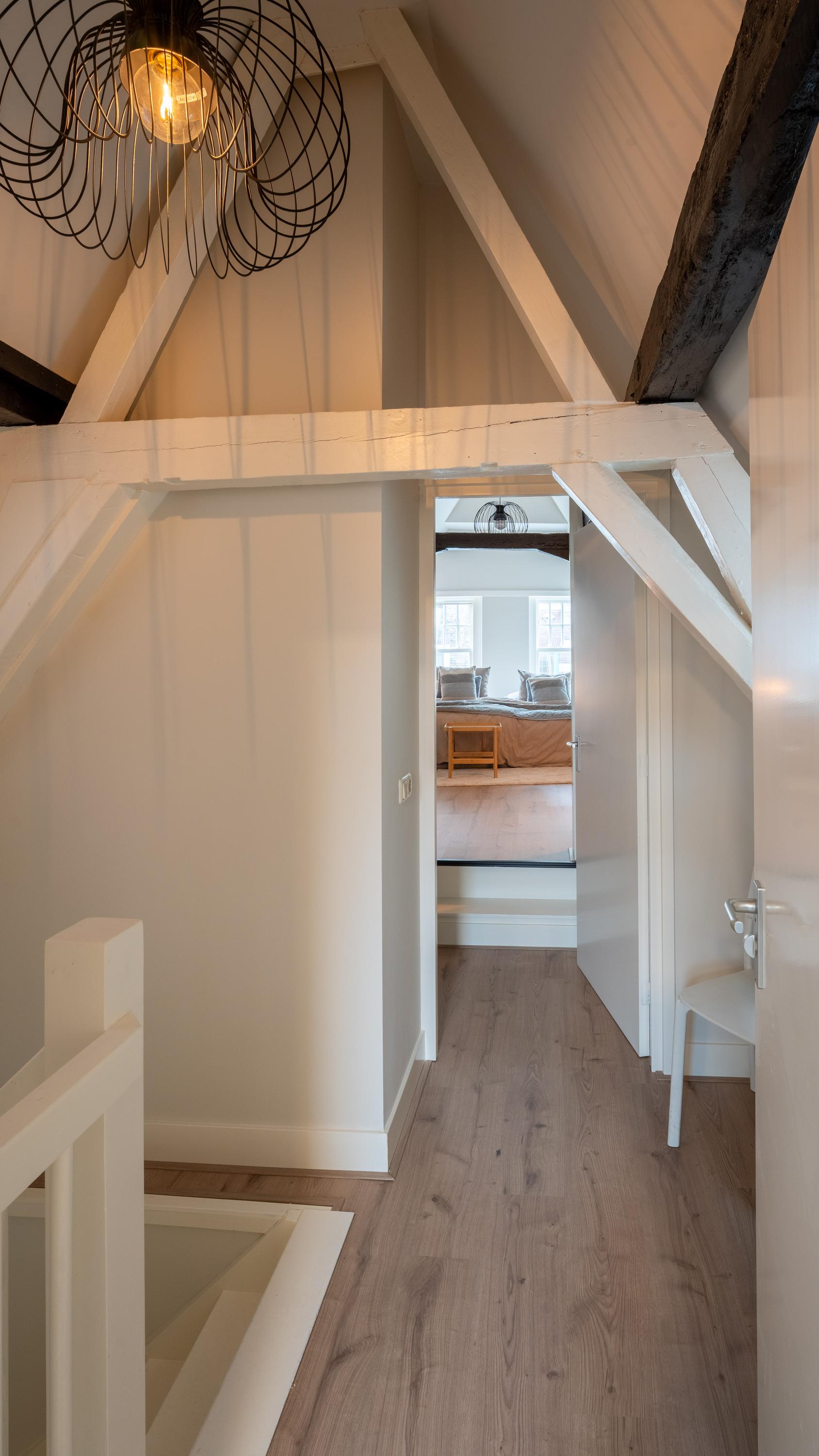 Op de tweede verdieping leidt de overloop, met indrukwekkend hoog plafond, naar een moderne badkamer met een ruime inloopdouche, een stijlvol wastafelmeubel en een praktische wasmachine-opstelplaats. Een tweede hal biedt ruimte voor garderobekasten, voordat je de zeer ruime slaapkamer betreedt. Hier komt de karakteristieke kapconstructie prachtig tot zijn recht, wat de kamer een warme en unieke uitstraling geeft.