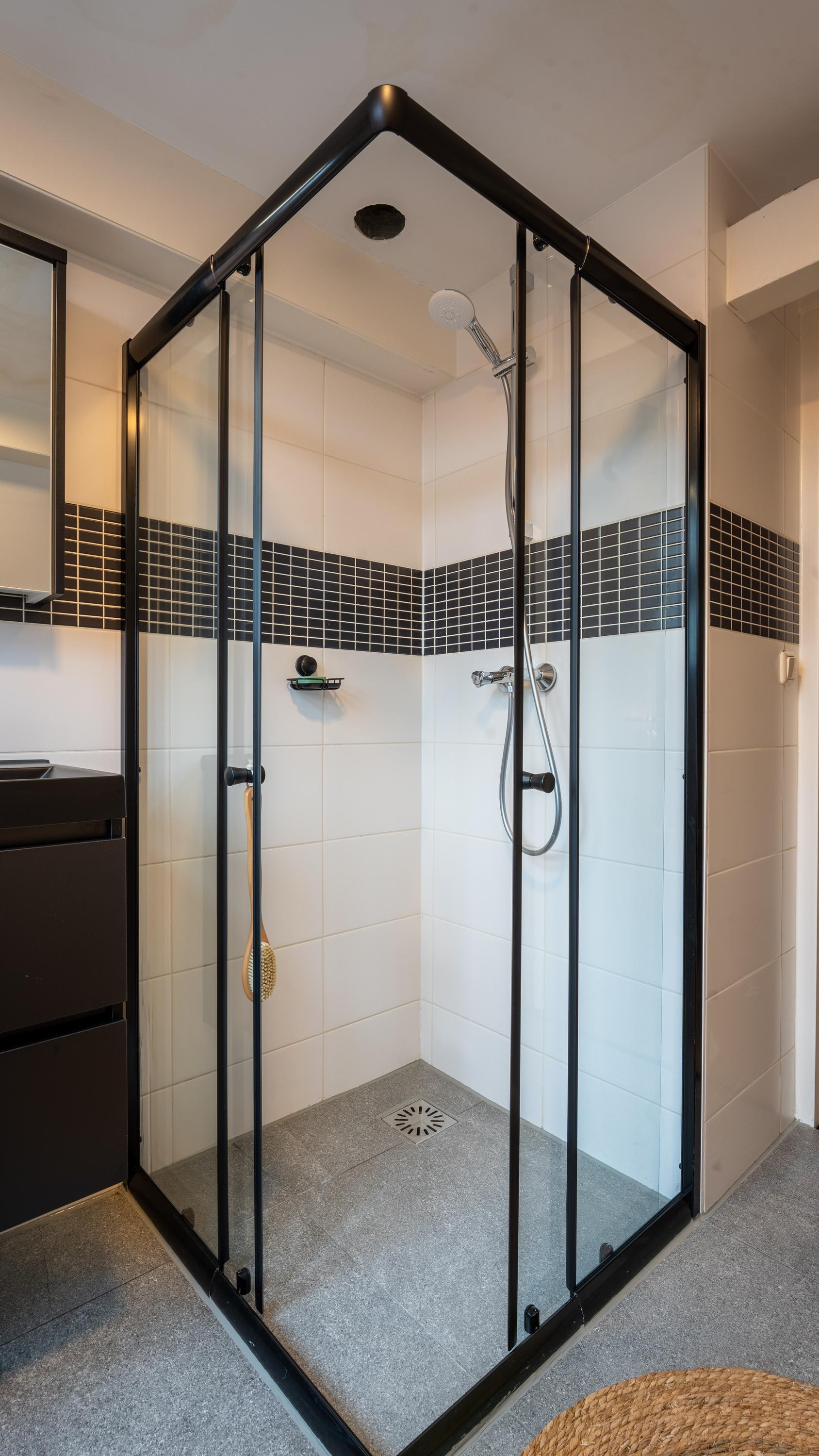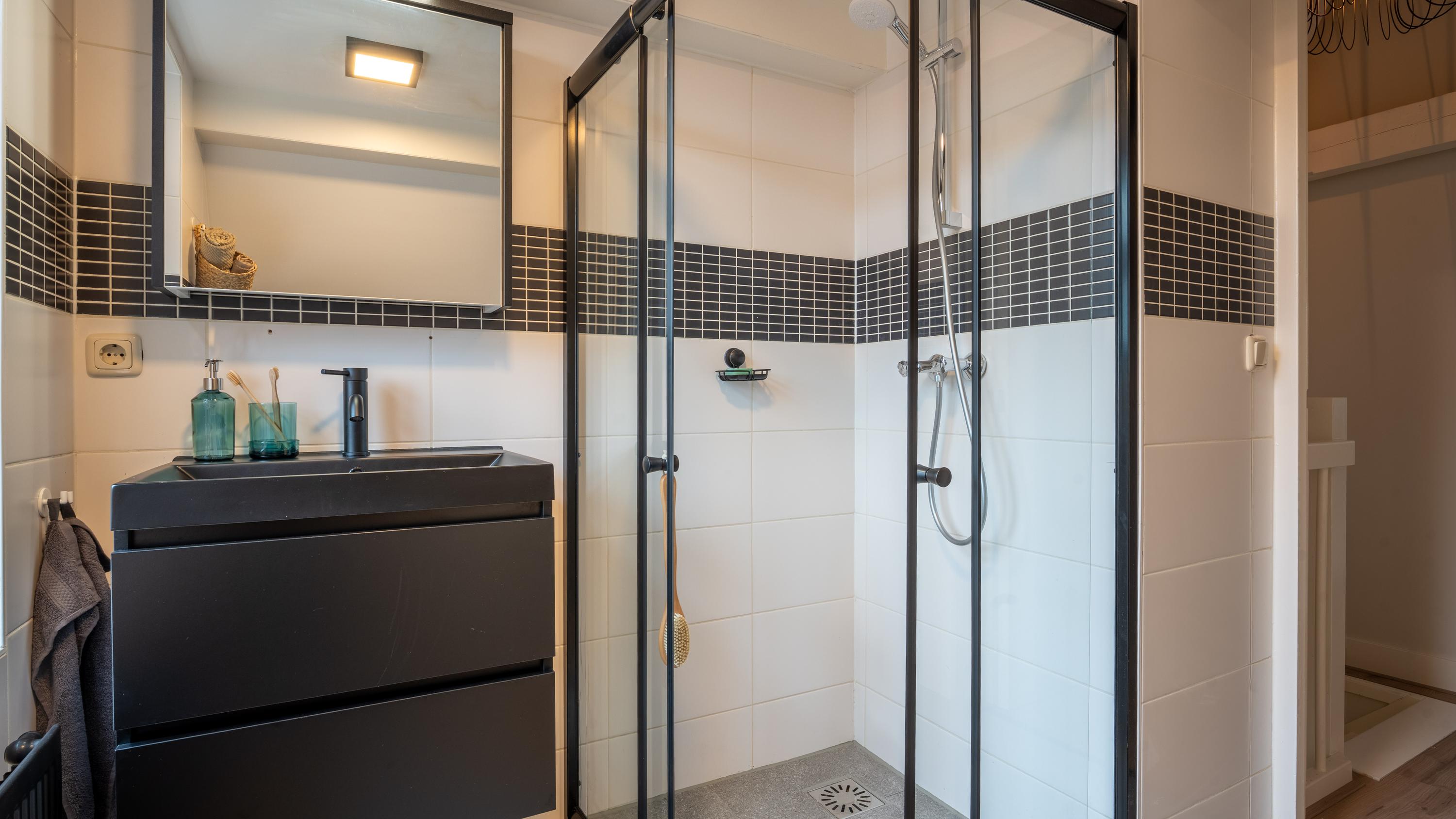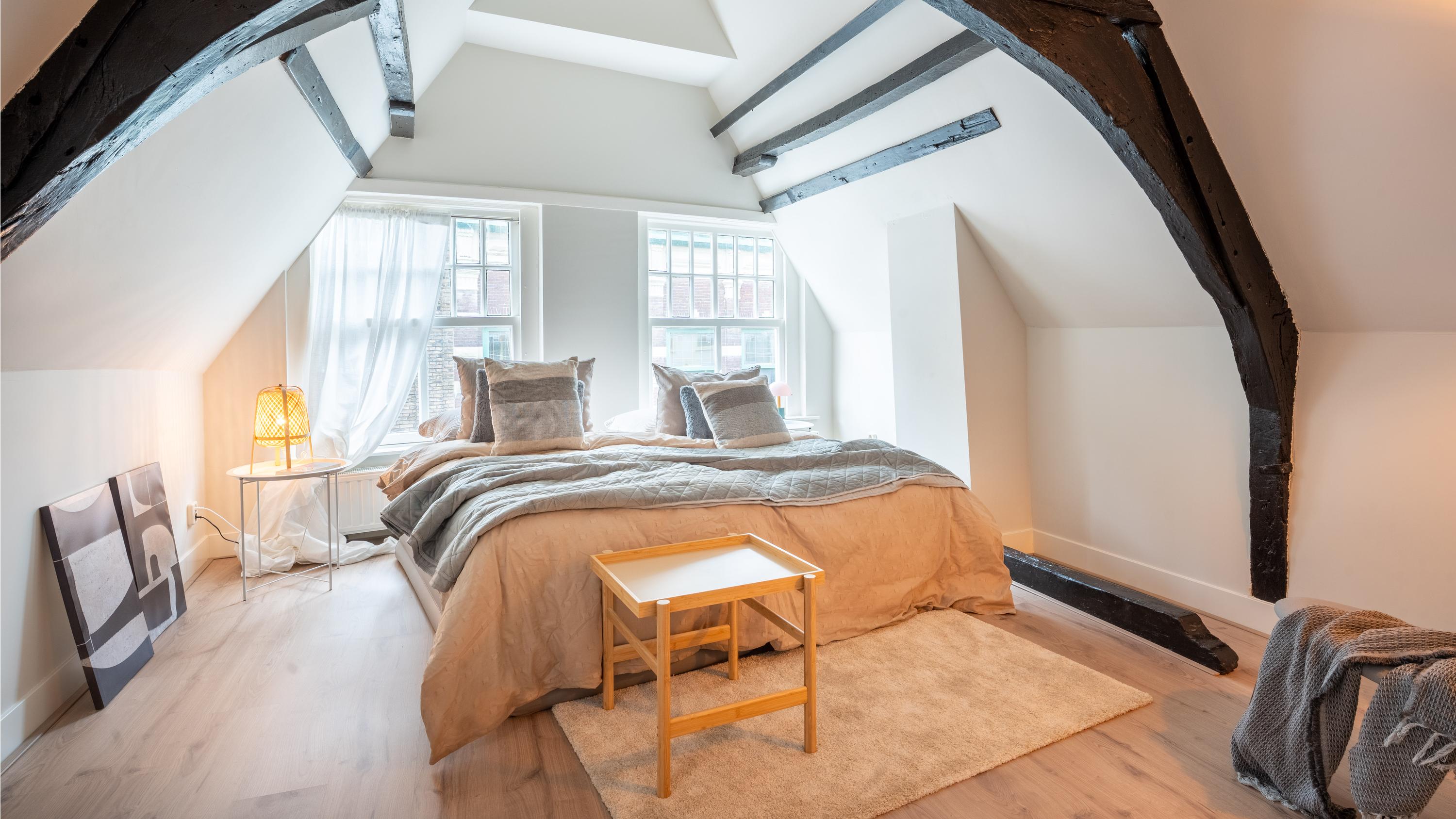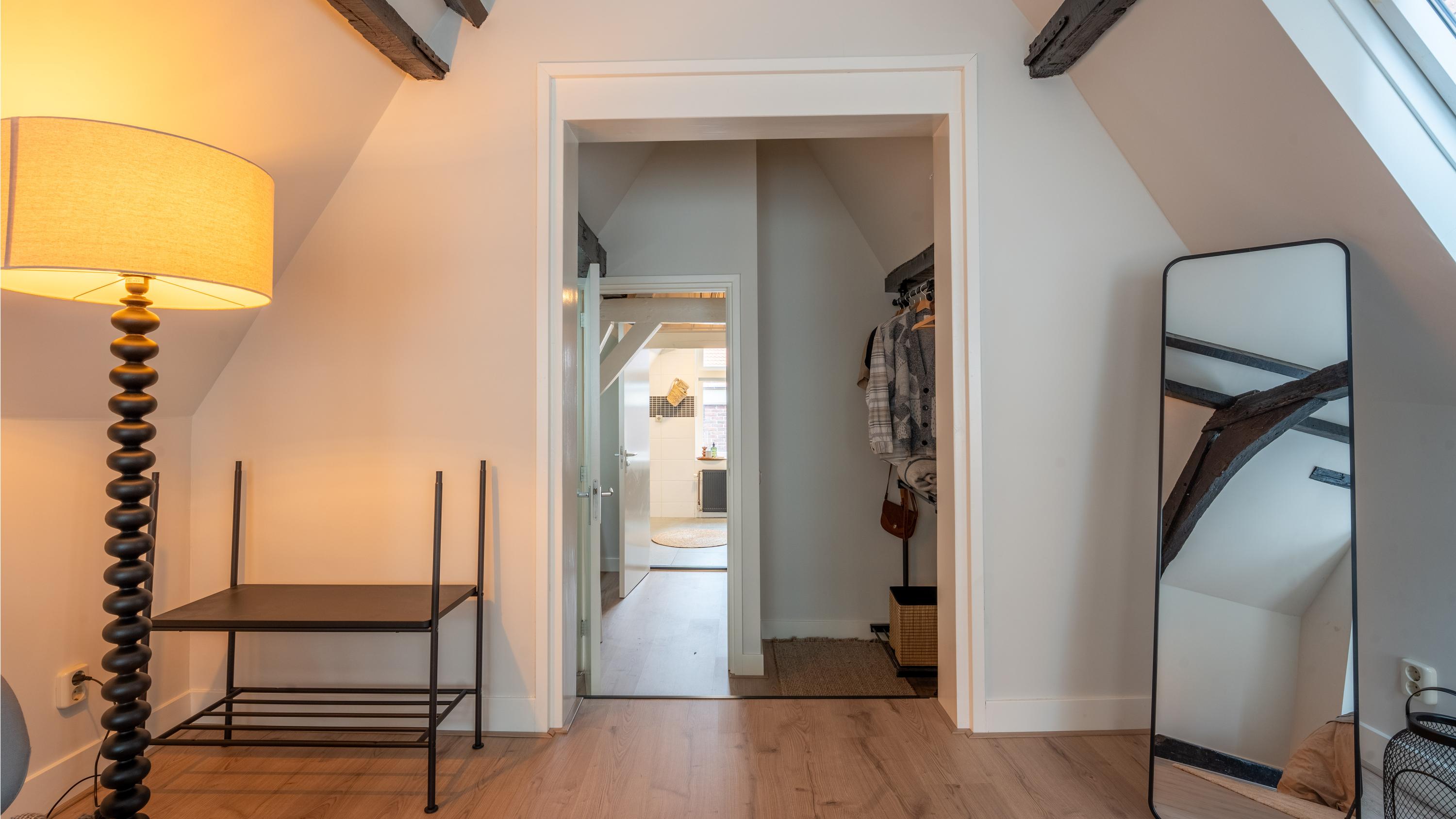 Op de tweede verdieping leidt de overloop, met indrukwekkend hoog plafond, naar een moderne badkamer met een ruime inloopdouche, een stijlvol wastafelmeubel en een praktische wasmachine-opstelplaats. Een tweede hal biedt ruimte voor garderobekasten, voordat je de zeer ruime slaapkamer betreedt. Hier komt de karakteristieke kapconstructie prachtig tot zijn recht, wat de kamer een warme en unieke uitstraling geeft.