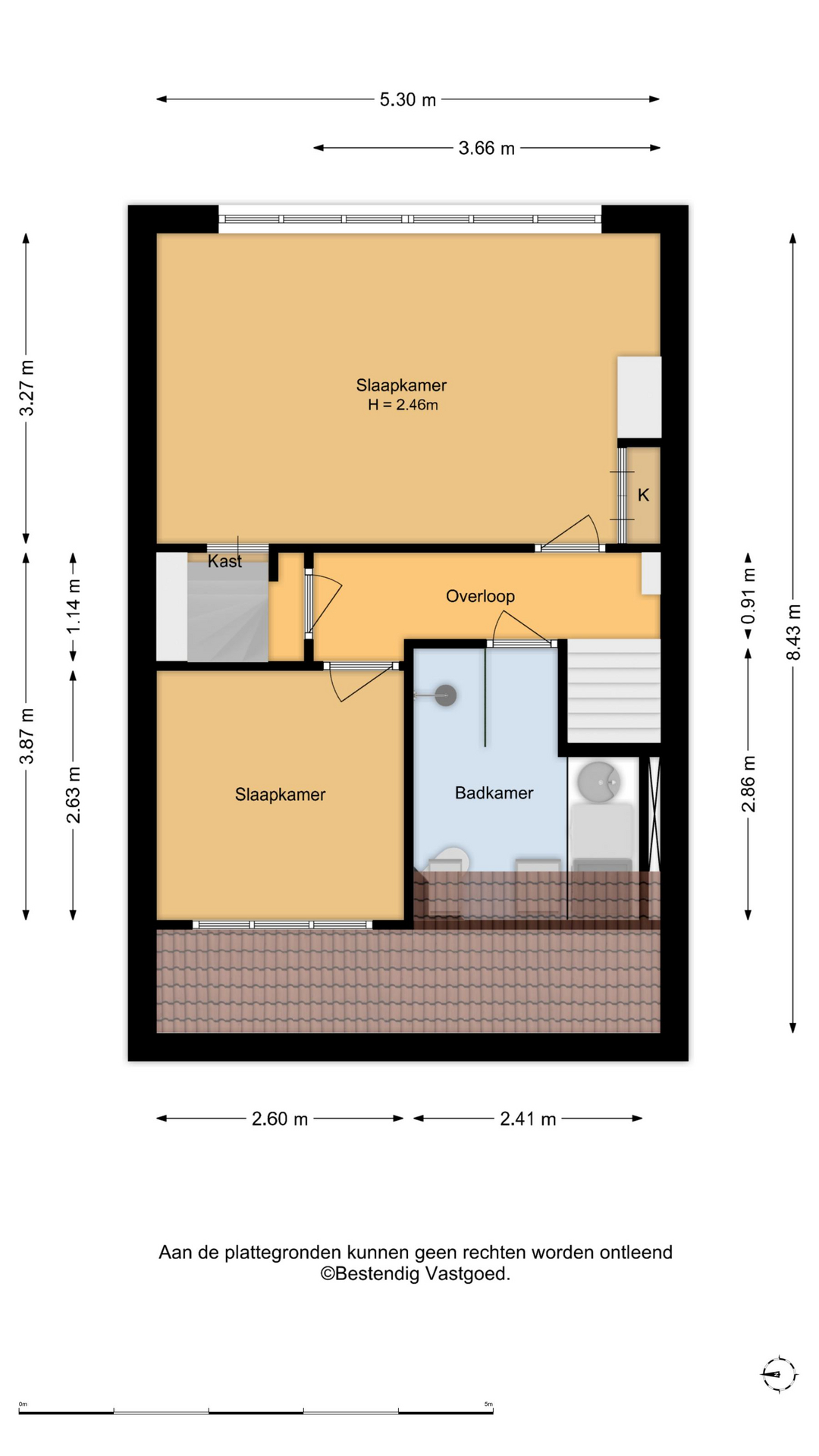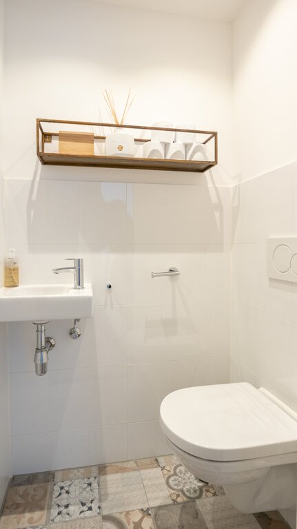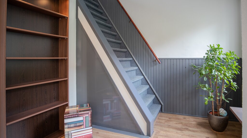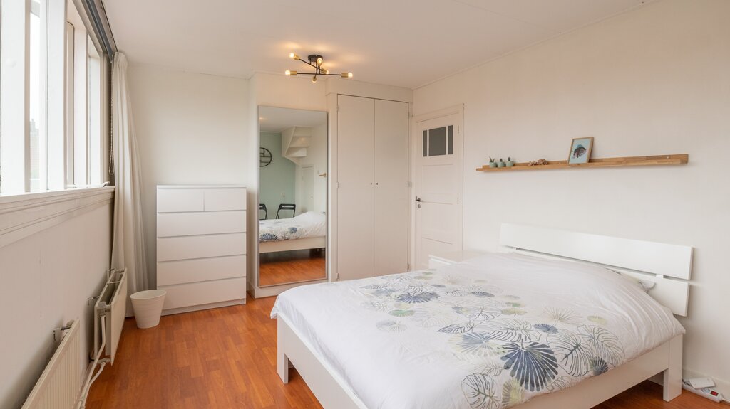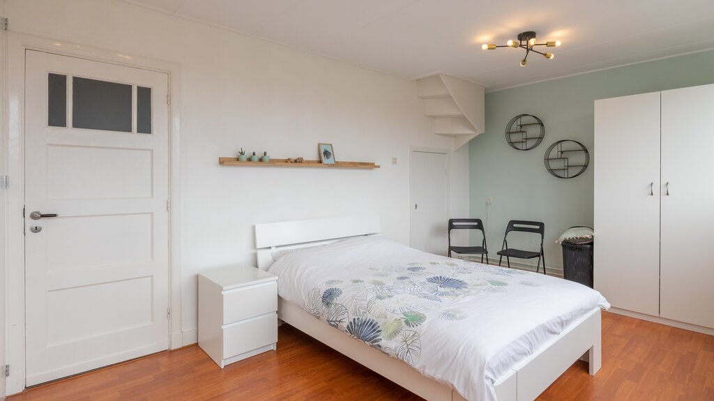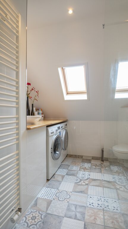 De tweede woonlaag herbergt twee comfortabele slaapkamers en een recent vernieuwde badkamer die aanvoelt als een luxe spa. Hier geniet u van een ruime inloopdouche, toilet, een modern wastafelmeubel en vloerverwarming voor extra comfort. Tevens bevinden zich hier de aansluitingen voor een wasmachine én droger.