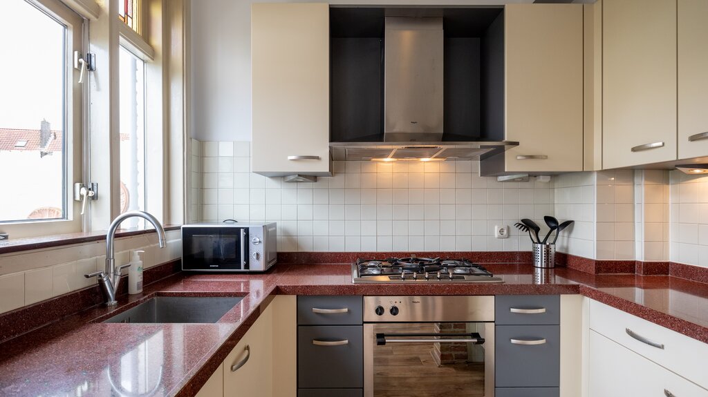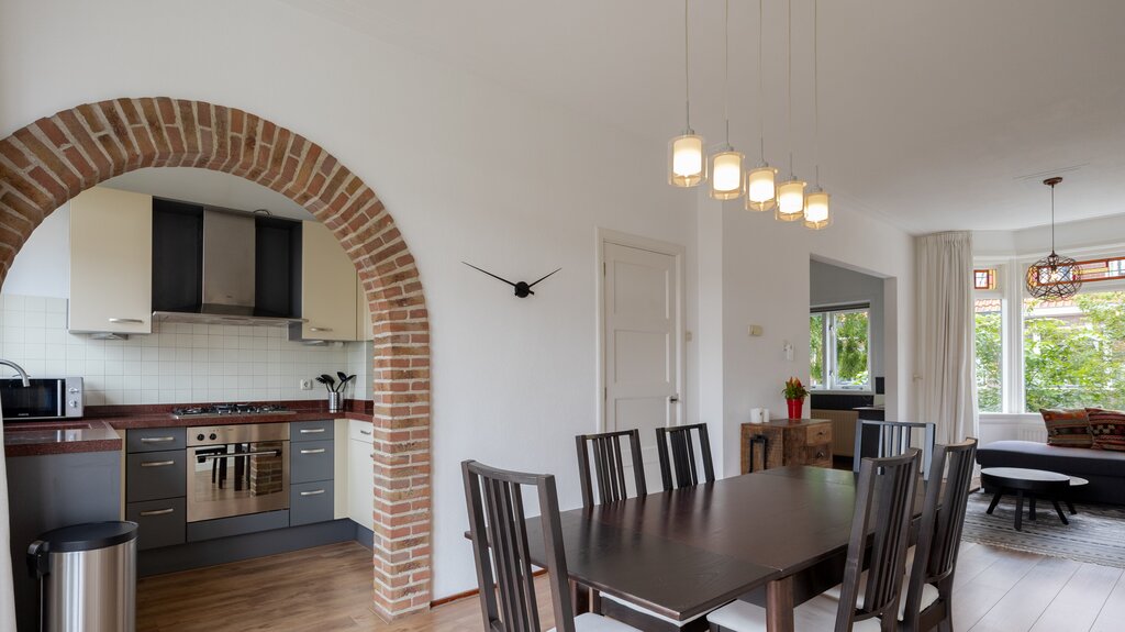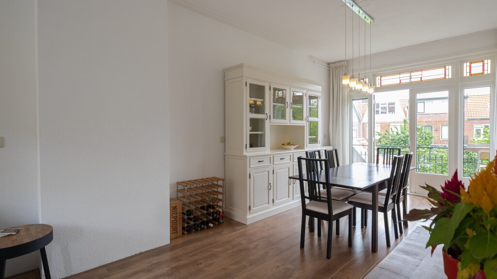 Bij binnenkomst valt direct de lichte en ruime woonkamer op, waar authentieke details zoals glas-in-loodramen en paneeldeuren de sfeer bepalen. De moderne open keuken, uitgevoerd in een stijlvol design, is voorzien van hoogwaardige inbouwapparatuur en biedt volop werk- en opbergruimte. Vanuit de eetkamer is er toegang tot het balkon, waar u in alle rust kunt genieten van de buitenlucht.