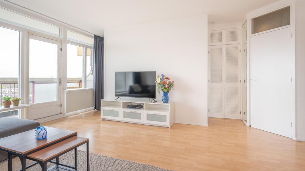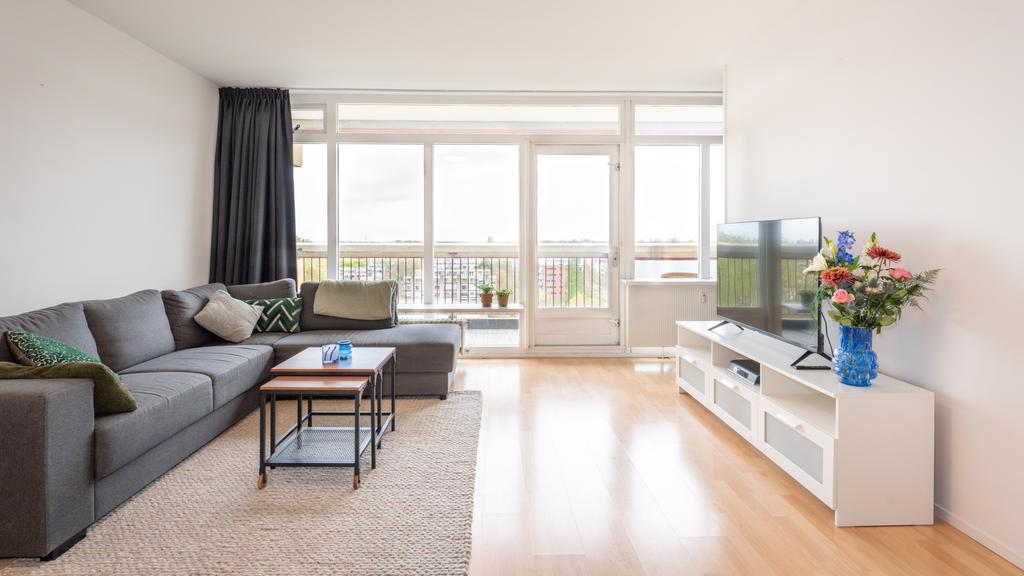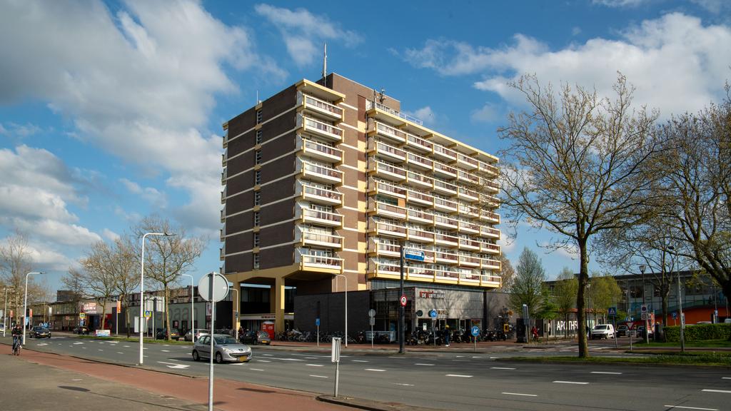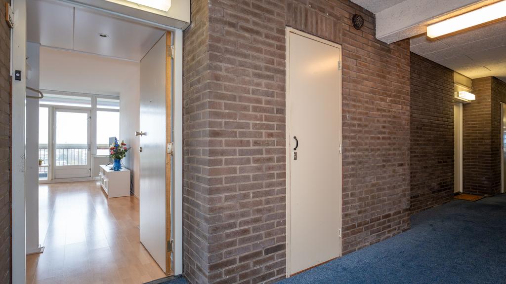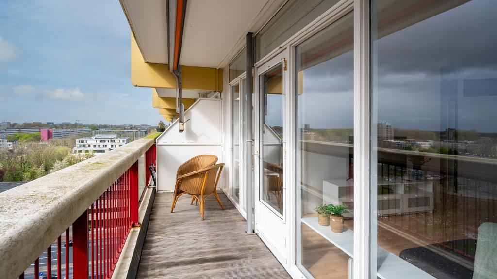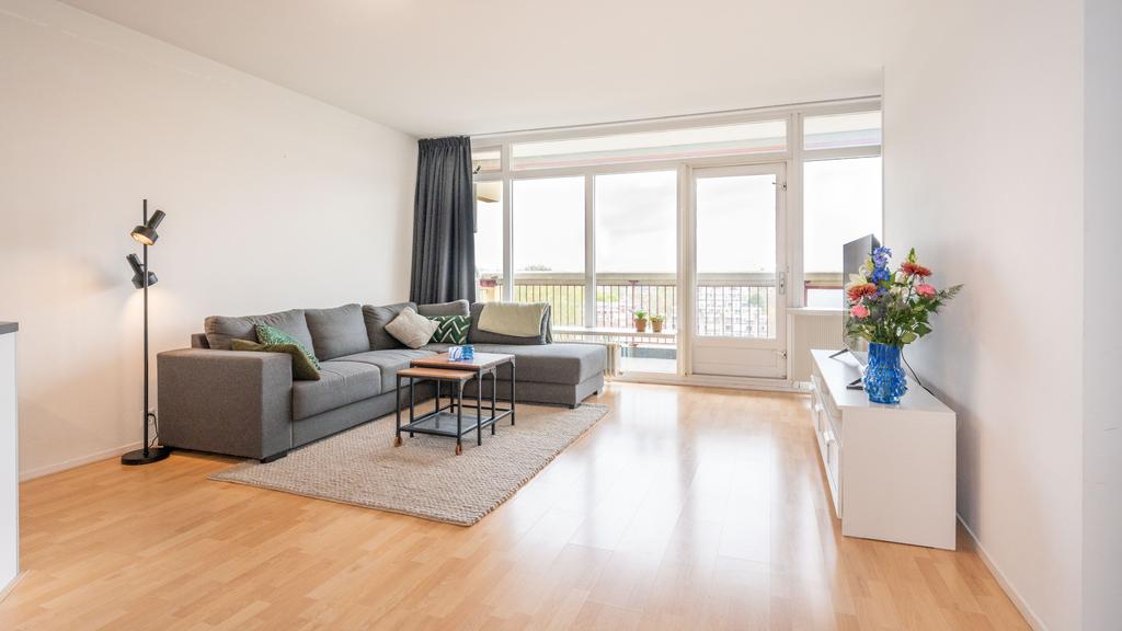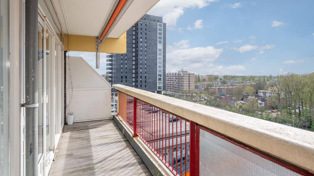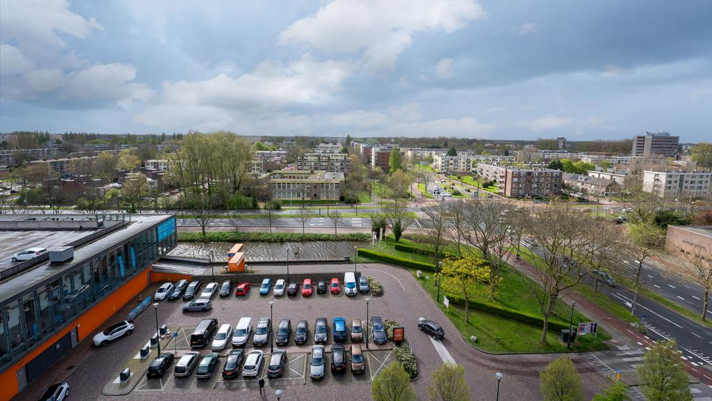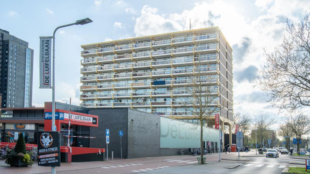 Op de 7e woonlaag van dit centraal gelegen appartementencomplex is deze nette twee kamer woning beschikbaar. Vanuit de centrale hal is de etage middels trap en lift bereikbaar. De entree komt uit in een hal waarvandaan de lichte en ruime woonkamer te bereiken is. De woonkamer, met gestukt plafond, is voorzien van een neutrale laminaatvloer en geeft toegang tot het ruime balkon, gelegen op het Westen. Het balkon volgt de volledige breedte van de woning en heeft tevens een zonnescherm. De open keuken is netjes en voorziet in een elektrische kookplaat met afzuigkap, oven, inbouwkoelkast en vaatwasser. De slaapkamer is bereikbaar vanuit de woonkamer. De nette en goed onderhouden badkamer is met toilet, een wastafel en een douche. Tevens beschikt de woning over voldoende bergruimte door de privé berging op de begane grond en een gemeenschappelijke fietsenstalling. Met het winkelcentrum de Luifelbaan op de begane grond zijn alle boodschappen snel gedaan. Verder is de woning gunstig gelegen ten opzichte van het centrum, horecagelegenheden en het centraal station (10 minuten afstand). Uitvalswegen zoals de A4, N11 en A44 zijn tevens op korte afstand gelegen.