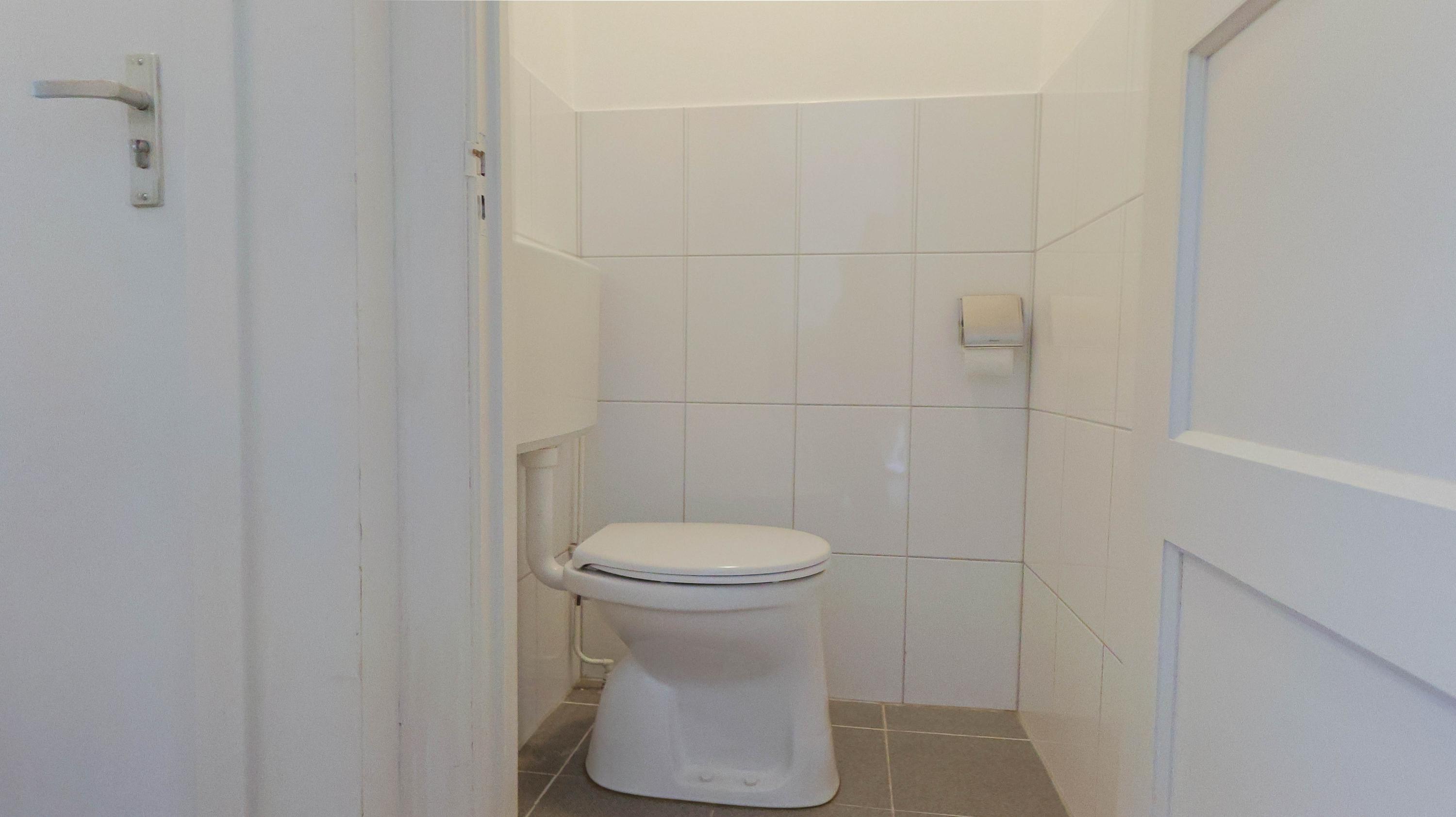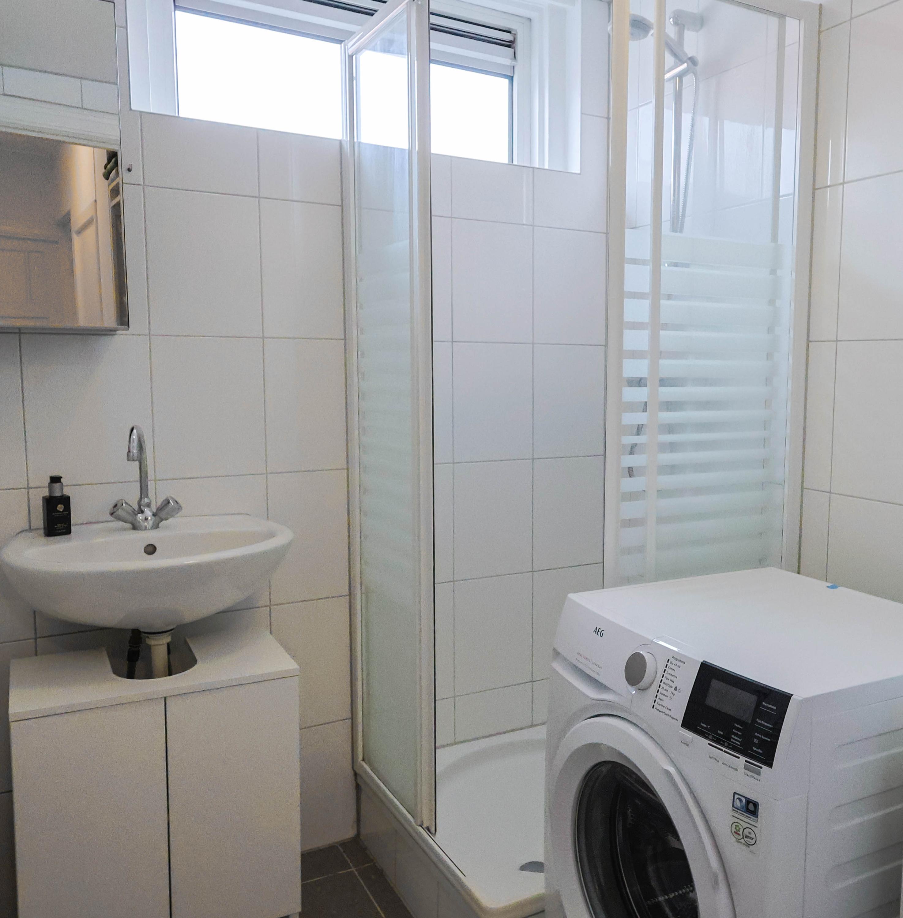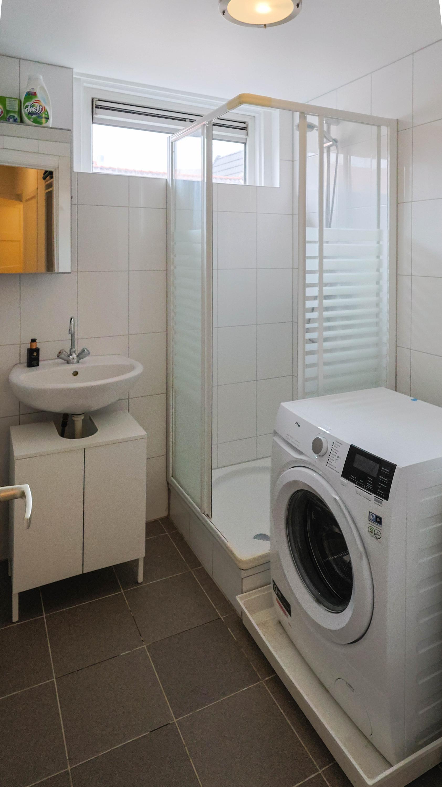 De badkamer is compact en praktisch ingericht en beschikt over een douche en wastafel. Tevens is er ruimte voor een wasmachine. Daarnaast is er een separaat toilet aanwezig.