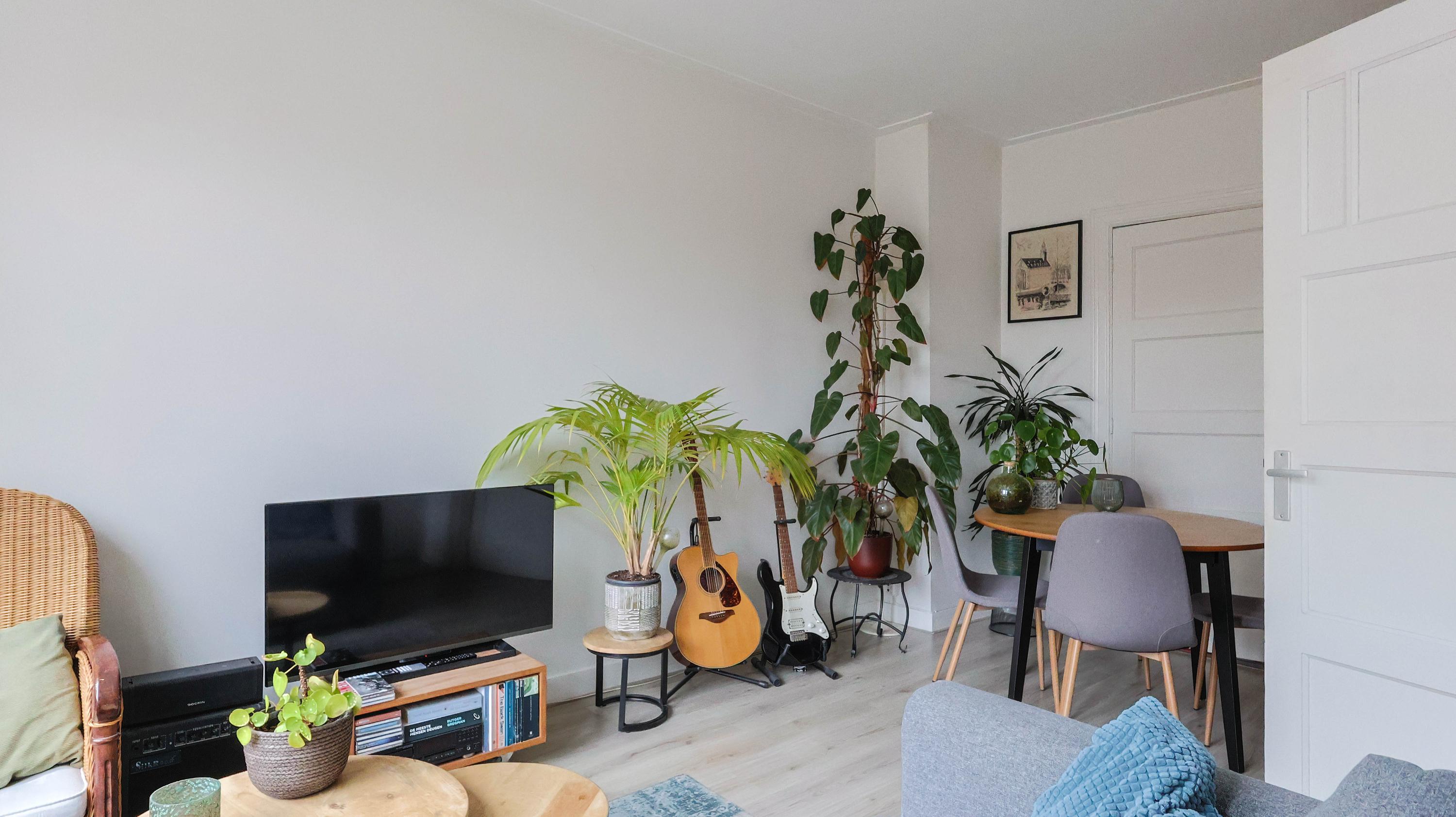 Bij binnenkomst leidt de hal naar de verschillende vertrekken van de woning. De lichte woonkamer beschikt over grote raampartijen waardoor er veel natuurlijk daglicht binnenvalt en er een prettig uitzicht is op de omgeving. De ruimte biedt voldoende mogelijkheden voor het creëren van een comfortabele woon- en eetkamer.