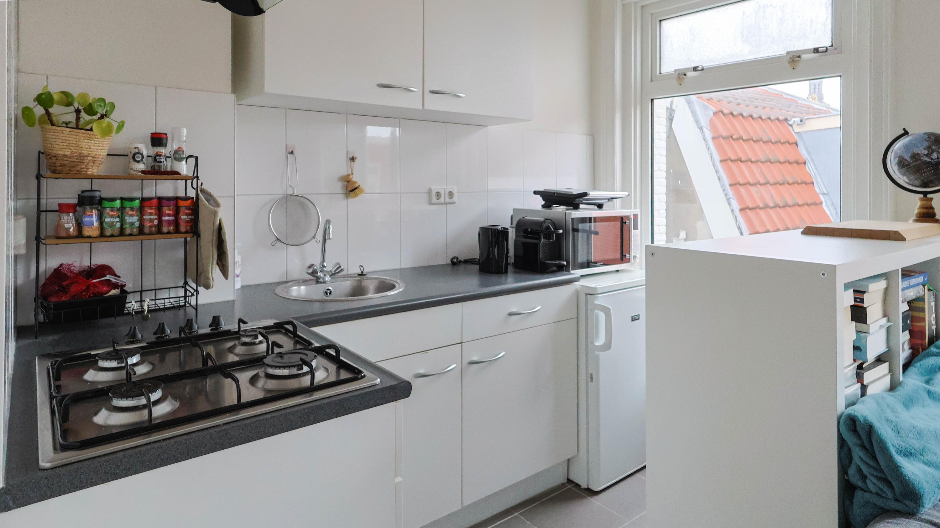 De open keuken is functioneel ingericht en voorzien van diverse opbergmogelijkheden en ruimte voor keukenapparatuur. Dankzij de efficiënte indeling is de keuken praktisch in gebruik.
