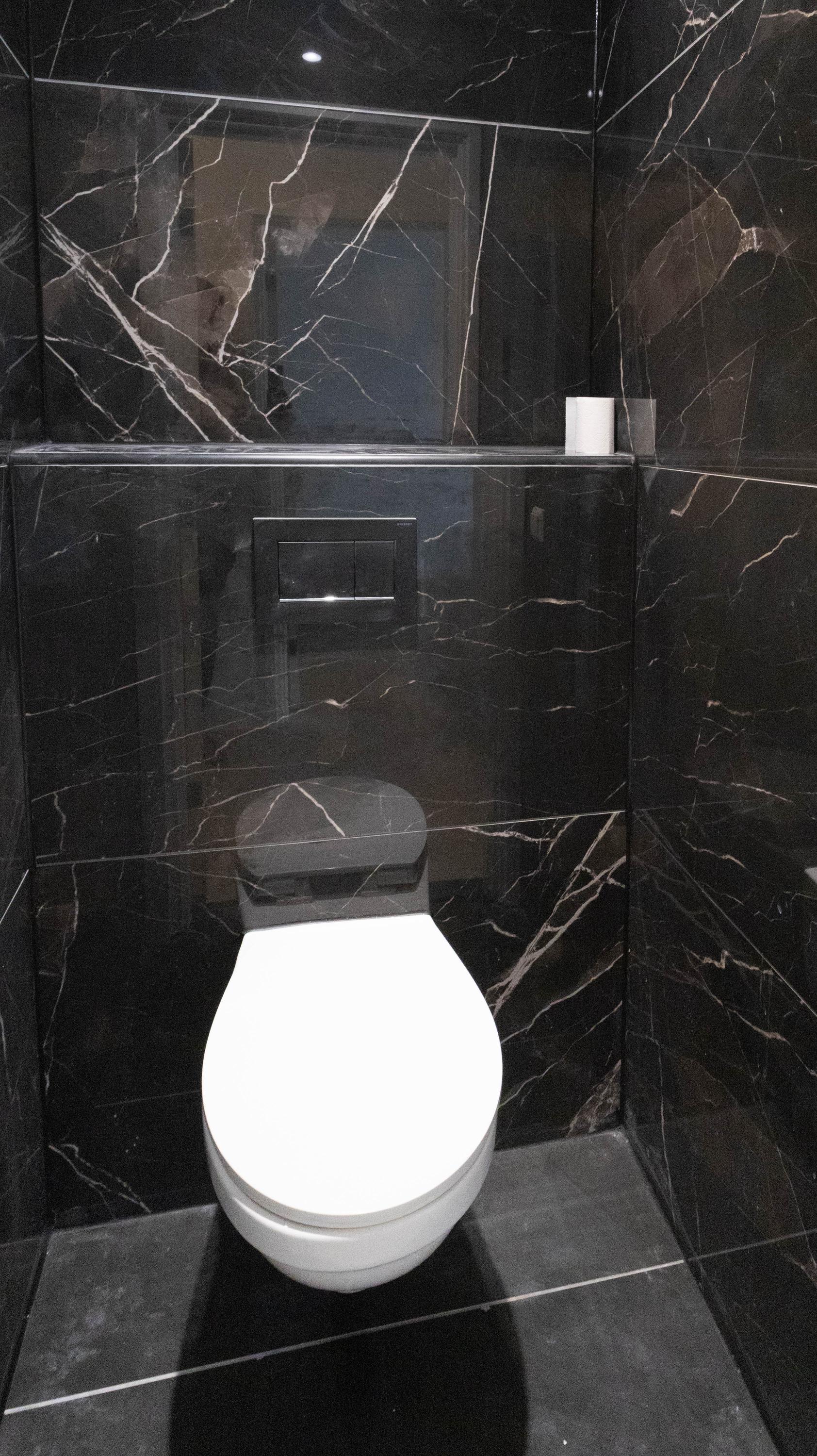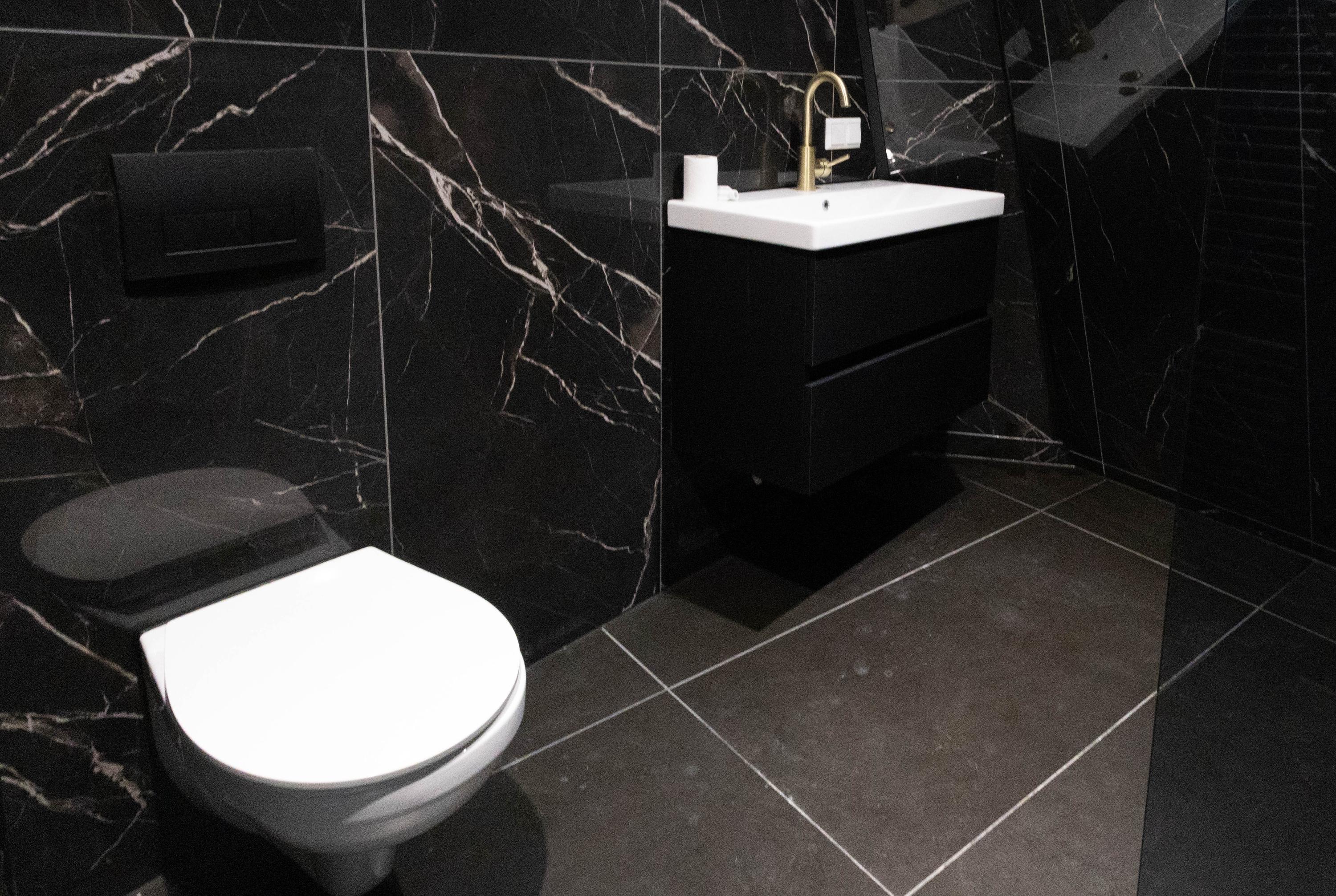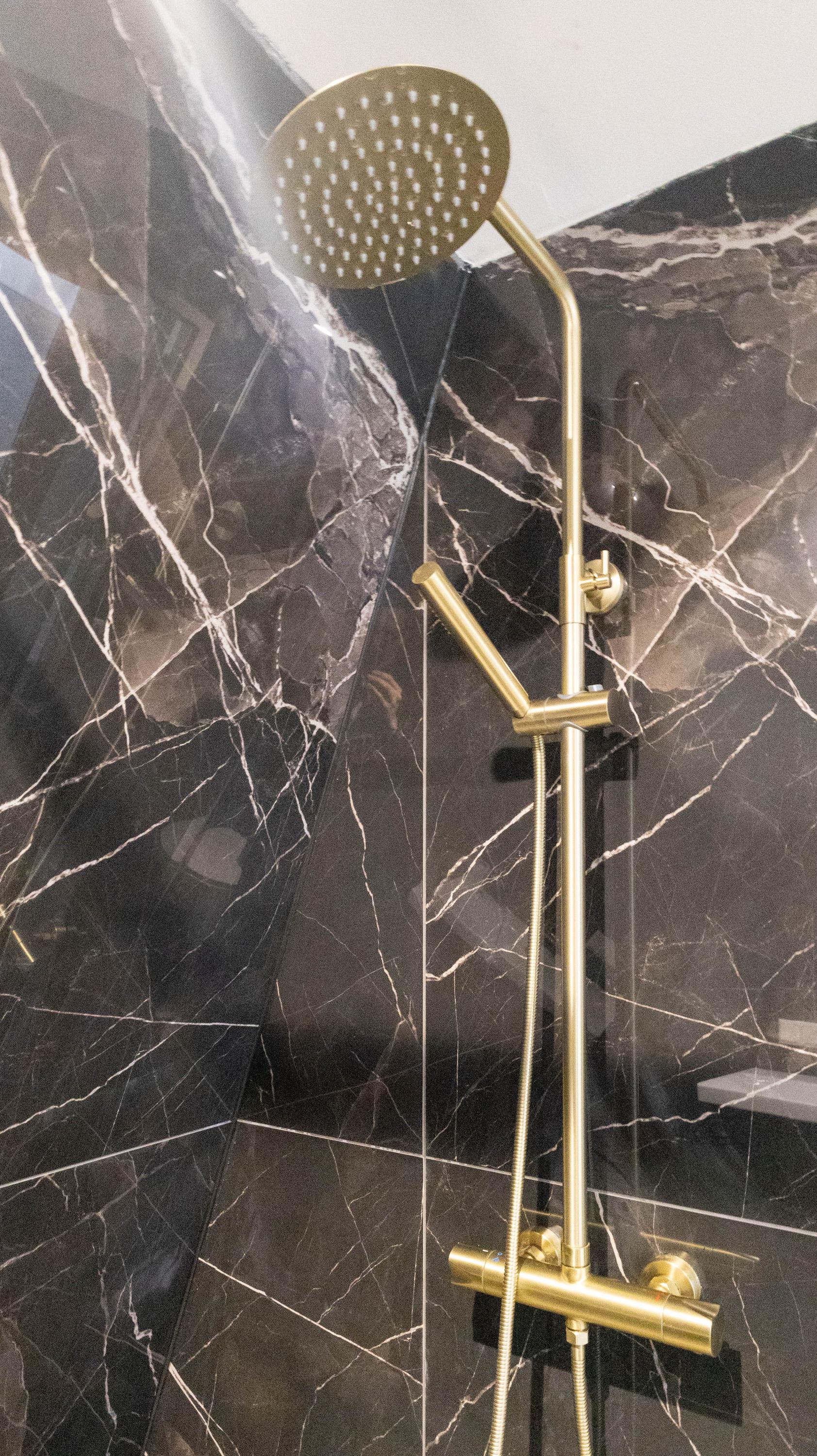 De trap brengt je naar de tweede woonlaag. Hier geeft de overloop toegang tot een tweede, moderne badkamer met hangend toilet, wastafelmeubel, handdoekradiator en inloopdouche.