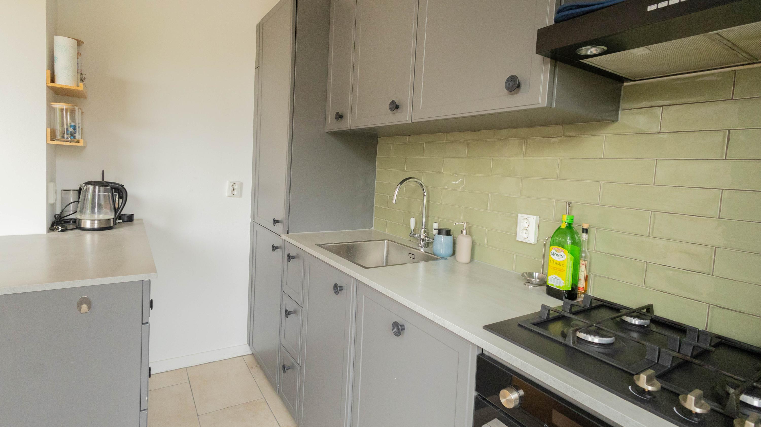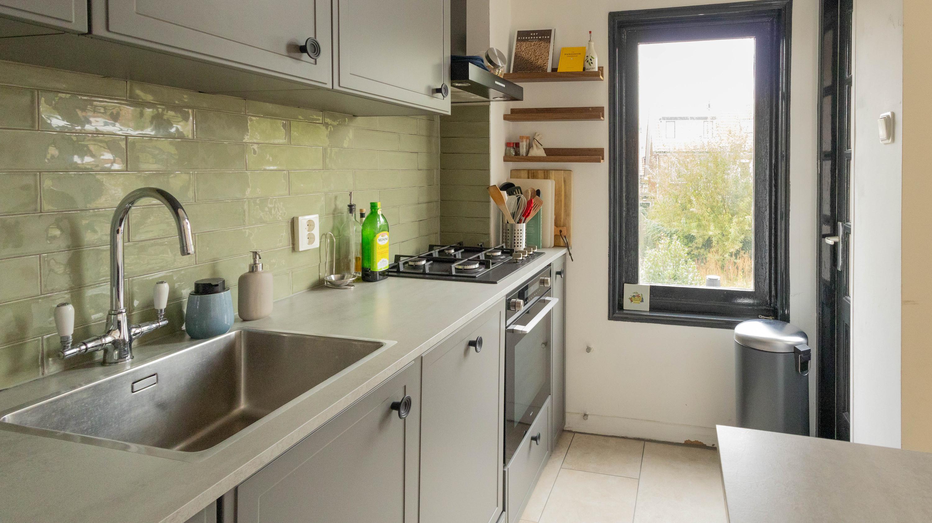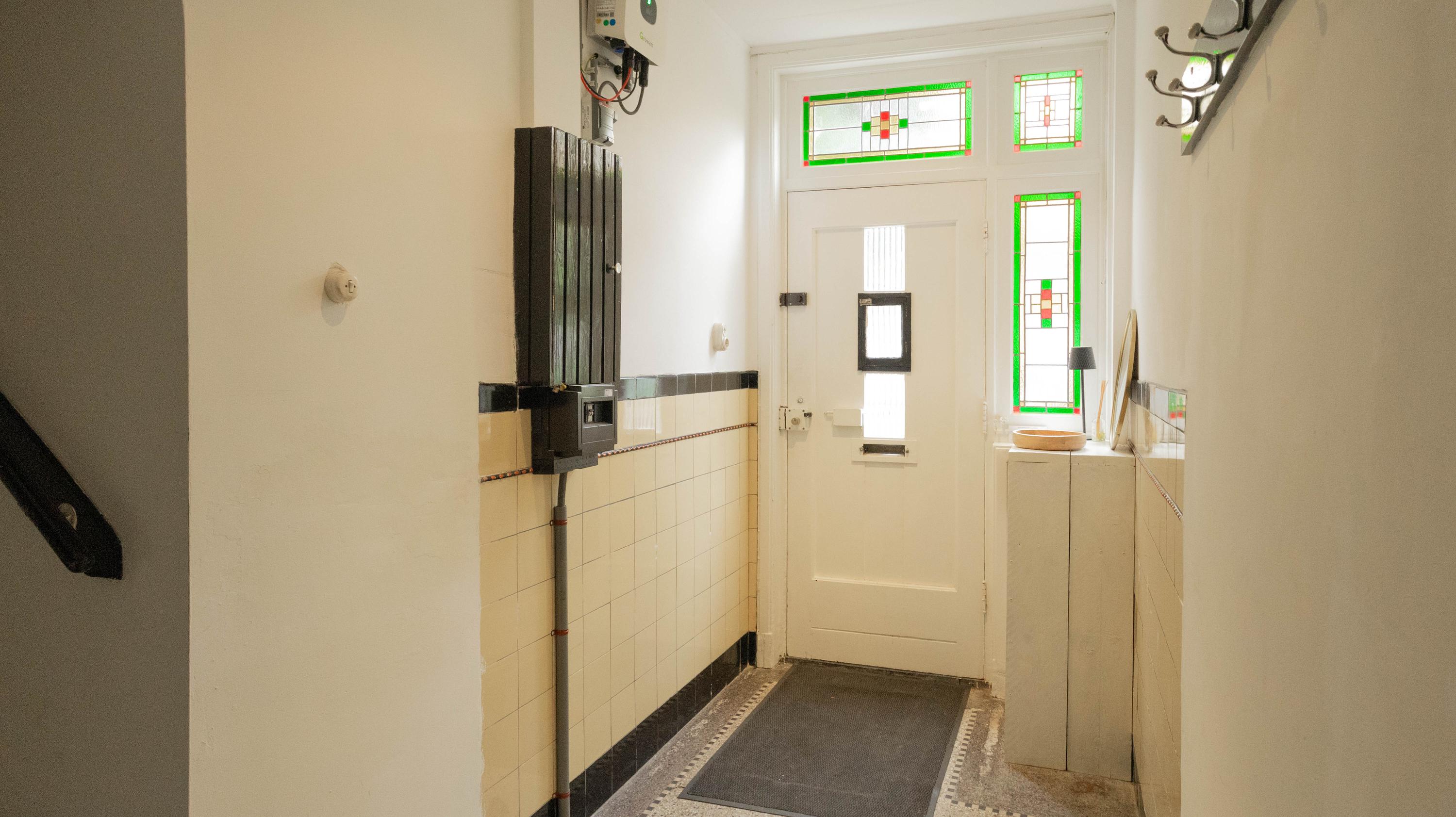 Via de voortuin betreed je de woning via de privé-entree. De vestibule is voorzien van authentieke jaren ’30-details, zoals een glas-in-lood bovenraam en wandbetegeling. Via de trap en de hal bereik je het woongedeelte. De woonkamer, gelegen aan de voorzijde van het perceel, is ruim en door de grote raampartijen komt er veel licht binnen. De open keuken is uitgerust met een vaatwasser, combi-oven-magnetron, gasfornuis, koelkast en vriezer. Het balkon naast de keuken biedt de mogelijkheid om prettig in de buitenlucht van je kopje koffie te genieten. De overloop biedt toegang tot de toiletruimte, voorzien van een hangend toilet en wastafel.