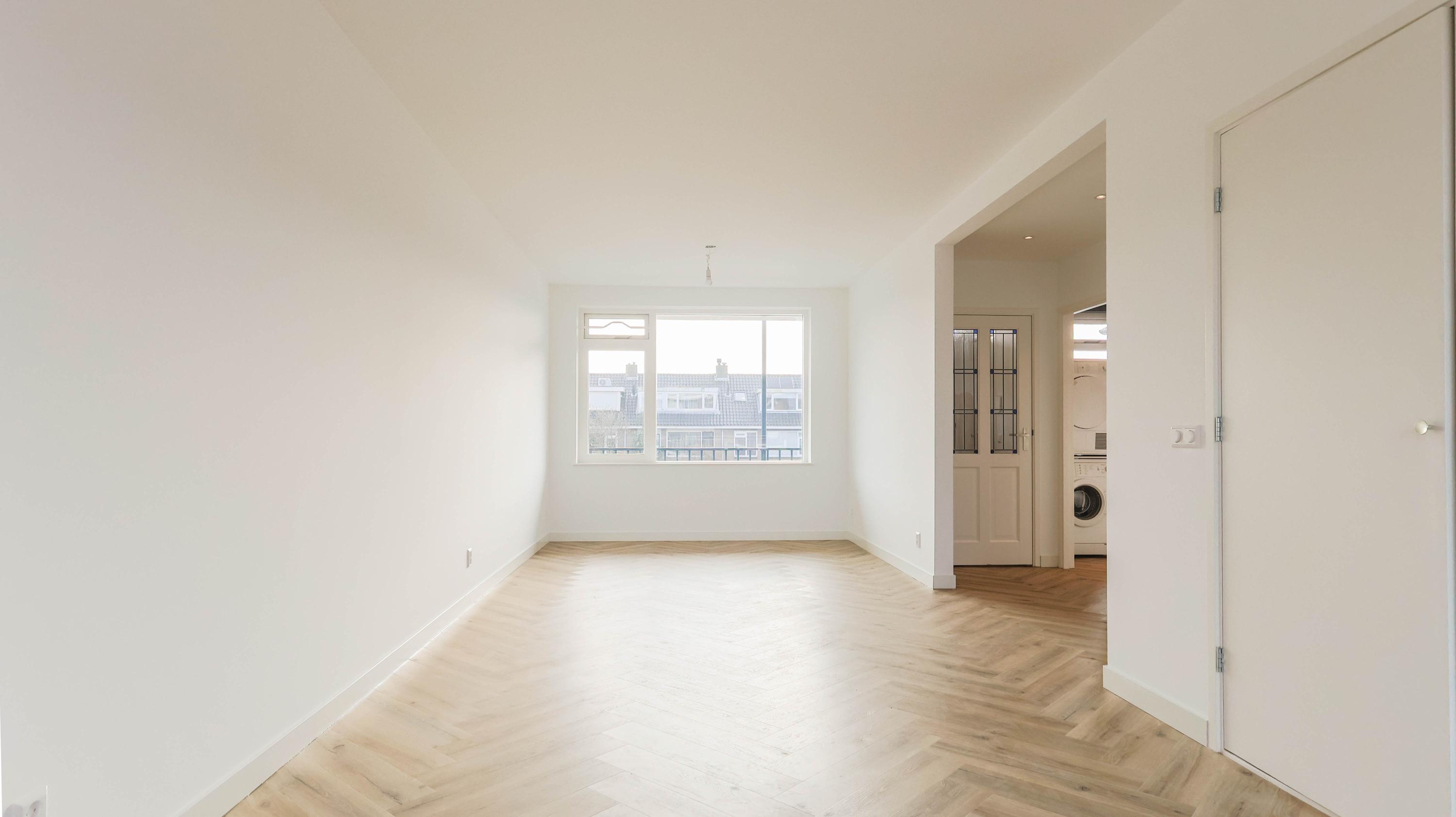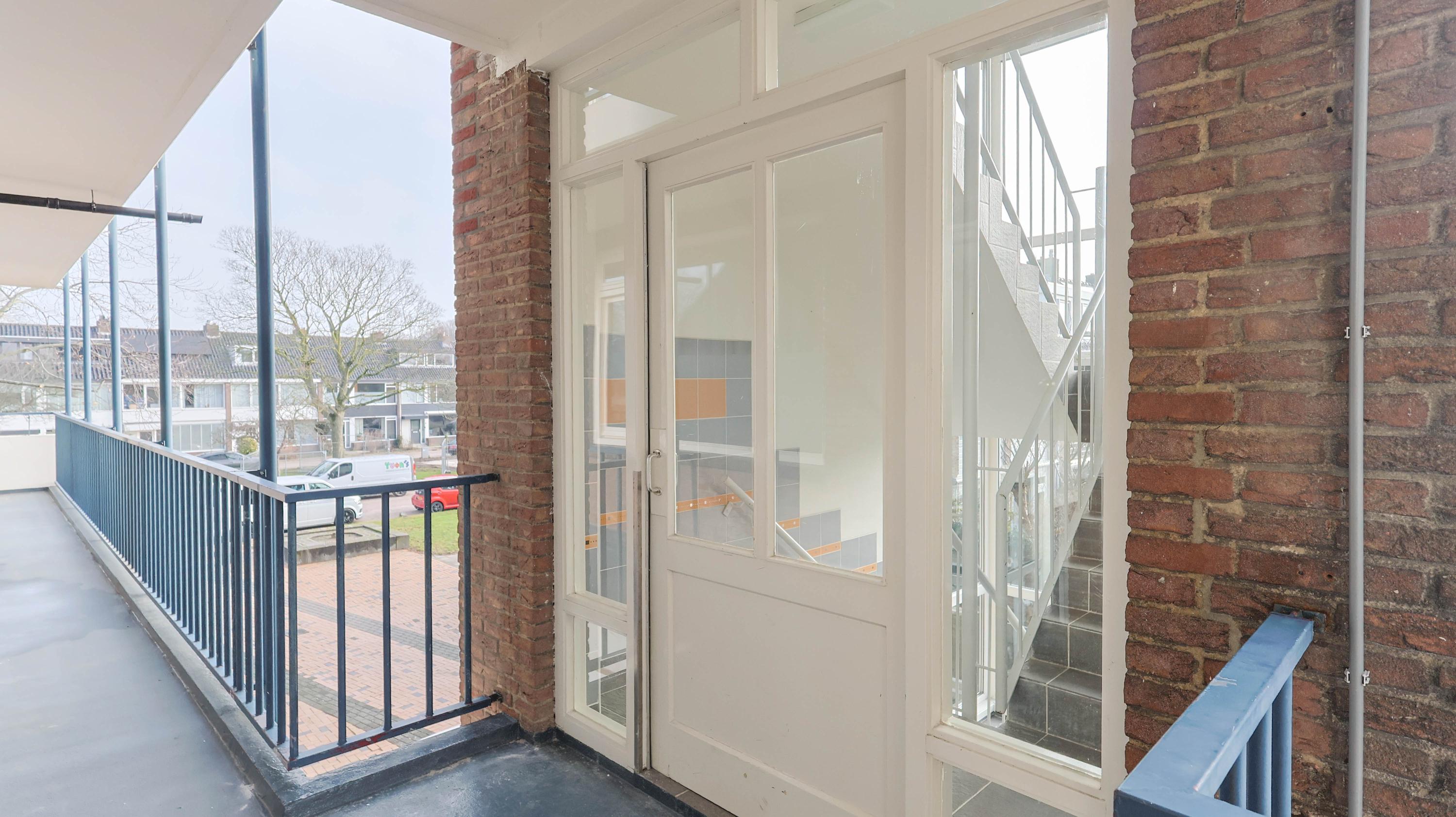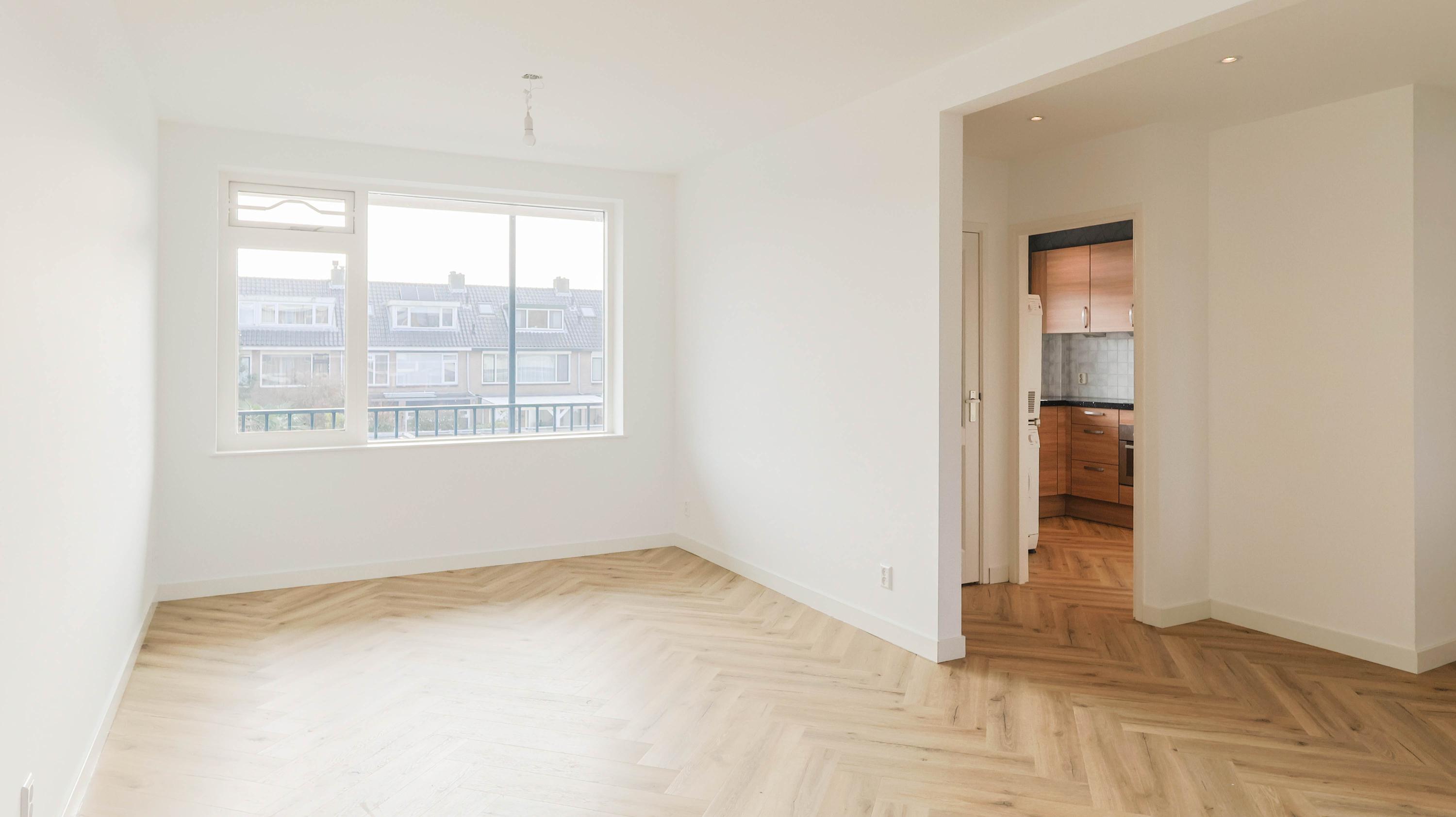 Binnenkomst is via de hal, die toegang geeft tot alle vertrekken. De separate keuken is modern en praktisch ingericht met diverse inbouwapparatuur en heeft een opstelplaats voor wasmachine en droger, de huidige machines blijven staan voor extra gemak. De badkamer is netjes afgewerkt en voorzien van een douche-badcombinatie, een wastafel met meubel en een zwevend toilet. De slaapkamer voelt prettig en rustig aan, beschikt over een handige inbouwkast en biedt directe toegang tot het balkon, een fijne plek om even buiten te zitten. De woonkamer is opvallend ruim en licht dankzij de doorzonindeling, met grote ramen en eveneens toegang tot het balkon, wat het geheel een open en luchtige sfeer geeft.