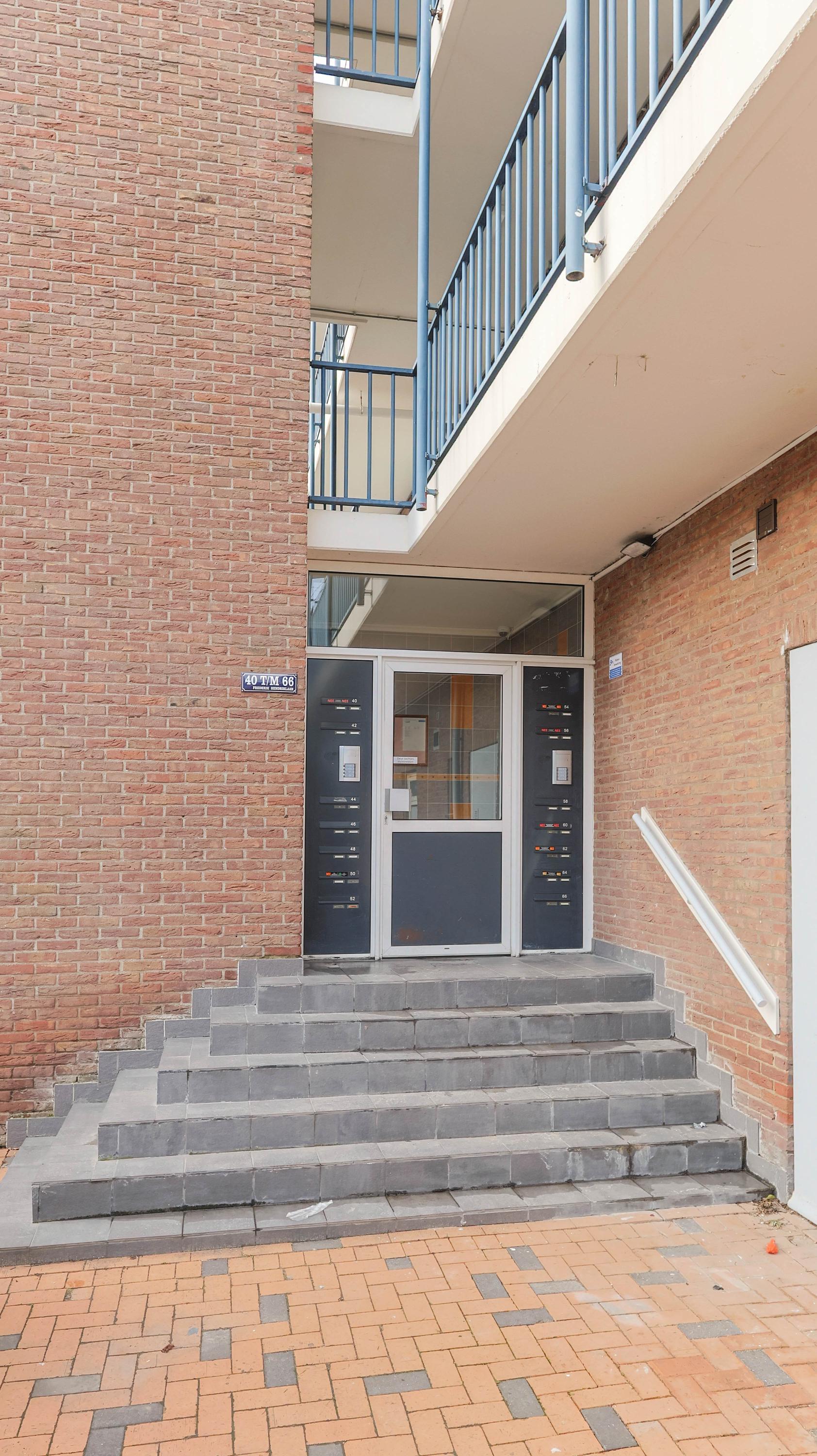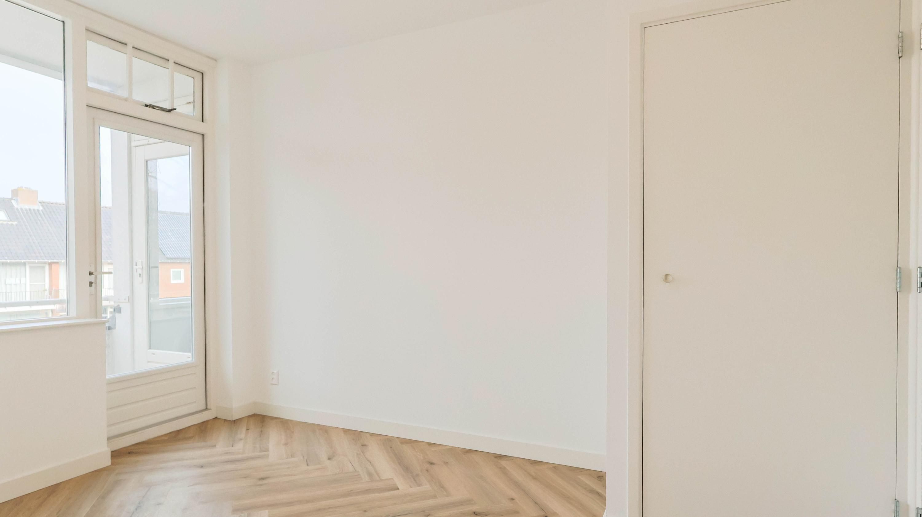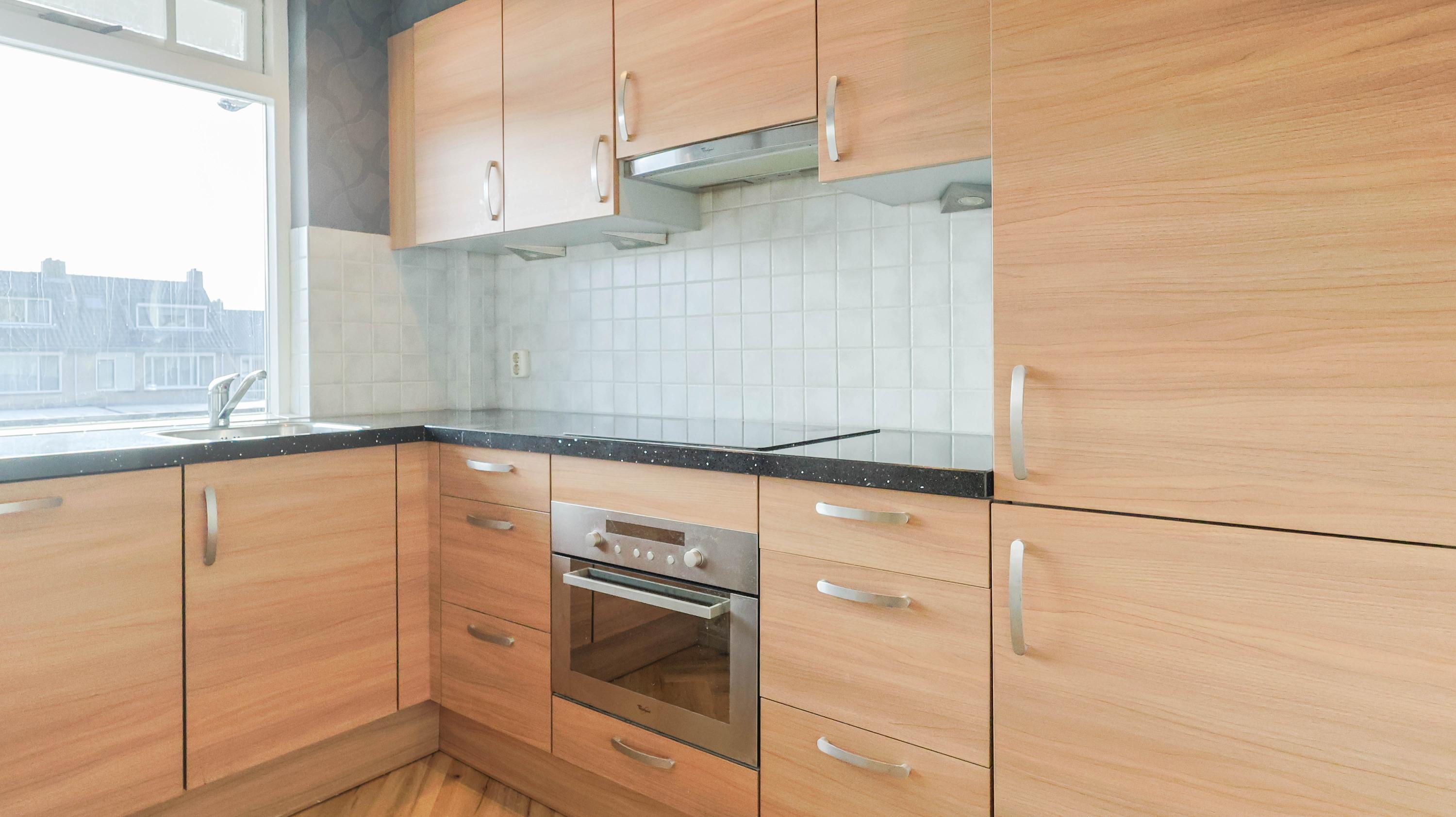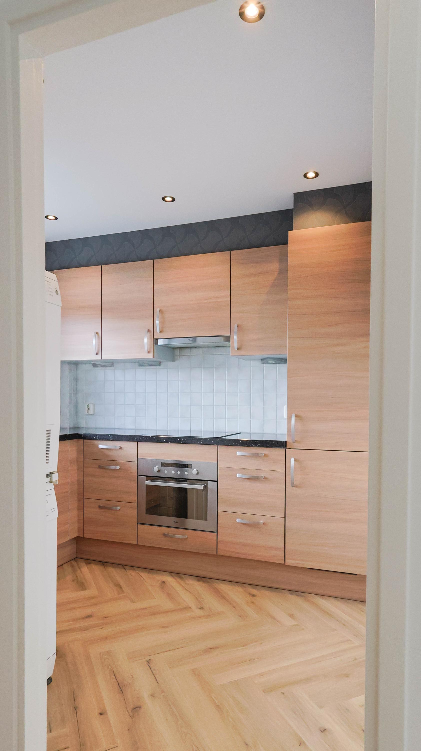 Binnenkomst is via de hal, die toegang geeft tot alle vertrekken. De separate keuken is modern en praktisch ingericht met diverse inbouwapparatuur en heeft een opstelplaats voor wasmachine en droger, de huidige machines blijven staan voor extra gemak. De badkamer is netjes afgewerkt en voorzien van een douche-badcombinatie, een wastafel met meubel en een zwevend toilet. De slaapkamer voelt prettig en rustig aan, beschikt over een handige inbouwkast en biedt directe toegang tot het balkon, een fijne plek om even buiten te zitten. De woonkamer is opvallend ruim en licht dankzij de doorzonindeling, met grote ramen en eveneens toegang tot het balkon, wat het geheel een open en luchtige sfeer geeft.