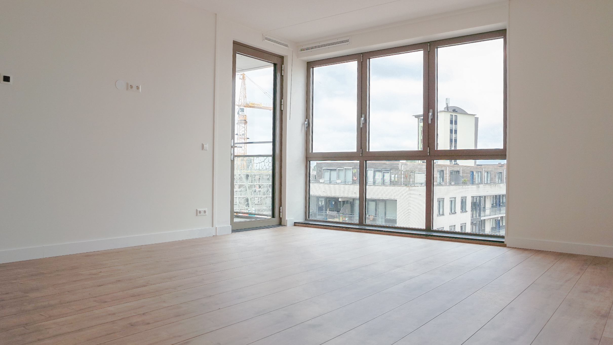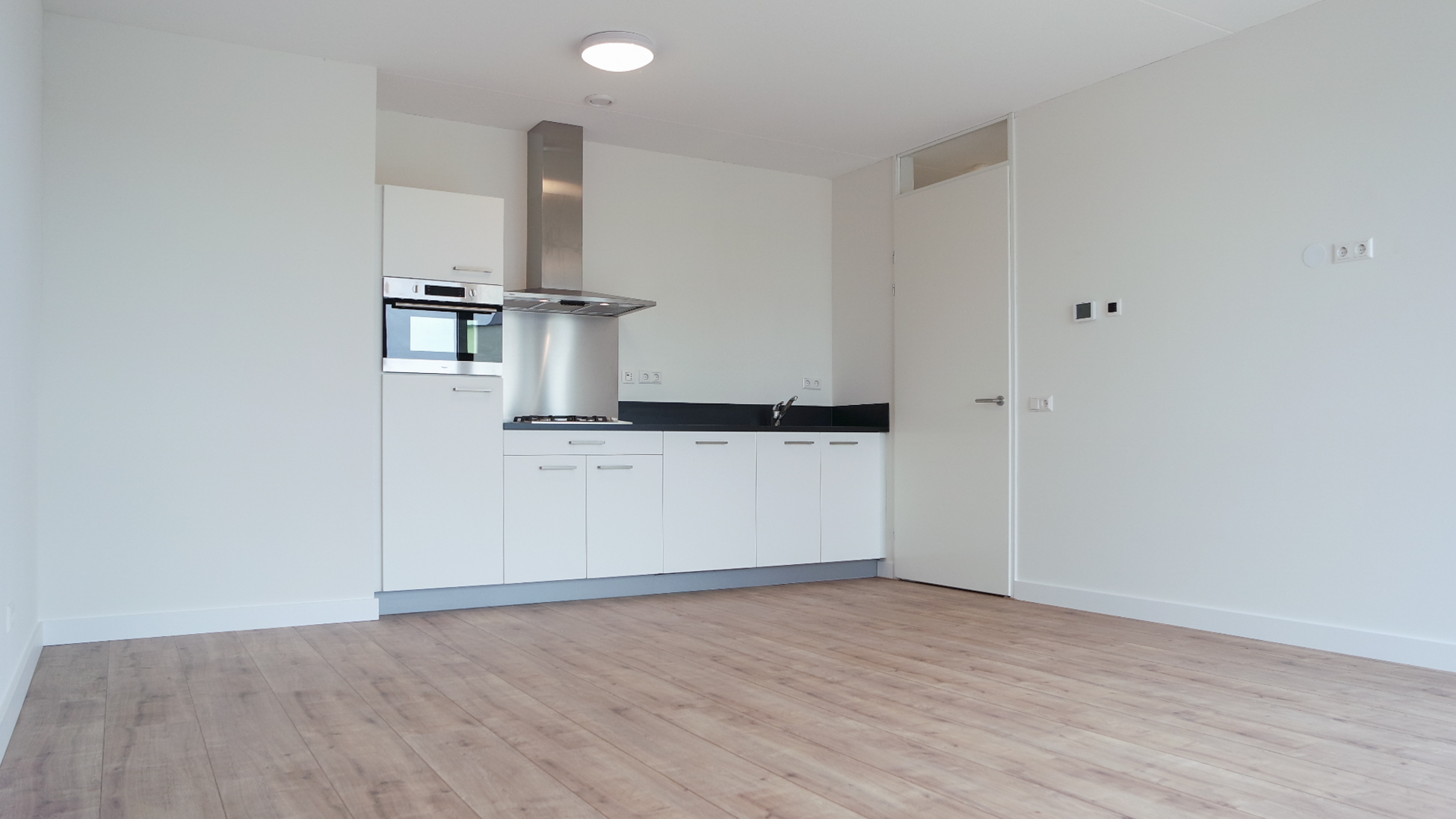 Met een grote supermarkt op de begane grond en parkeerdek op de 1e etage beginnen de woonlagen vanaf de tweede etage. Op de 3e etage bevindt zich dit ruime appartement met balkon op het noorden. De entree komt uit in de hal met toegang tot de berging met wasmachine aansluiting, slaapkamer en de woonkamer. De lichte woonkamer is met moderne open keuken voorzien van alle moderne gemakken waaronder een vaatwasmachine en oven- combimagnetron. De woonkamer geeft toegang tot het balkon van 6m2. De badkamer is voorzien van zwevend toilet, inloopdouche en wastafel. Het gehele appartement is voorzien van moderne laminaat vloer. De woning wordt verhuurd met privé berging en verplicht afneembare parkeerplaats van € 60,- per maand.