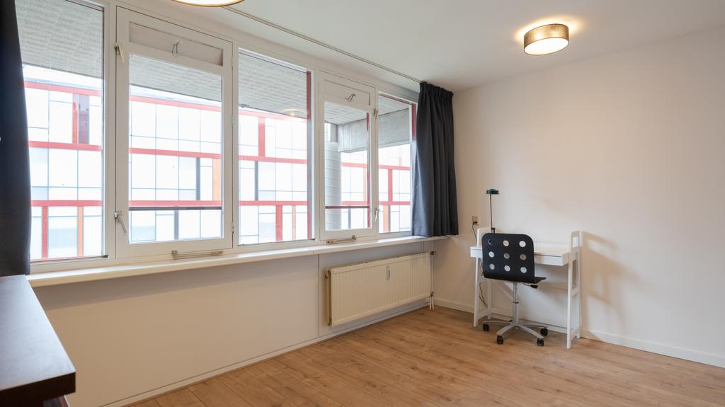 Deze komt uit in de hal waarvandaan een separaat toilet, prettige bergkast en de tweede slaapkamer bereikbaar zijn. Deze slaapkamer kan tevens dienst doen als kantoor en/of logeerkamer. De vaste trap komt uit op de 2e woonlaag van het appartement. Vanaf de overloop is er toegang tot de moderne open keuken welke volledig voorzien is van alle moderne gemakken waaronder een koel- vriescombinatie, vaatwasmachine, kookplaat met afzuiging en was- én droogmachine opstelling. De woonkamer bevindt zich aan de voorzijde en geeft mooi uitzicht over het Schouwburgplein. De overloop geeft toegang tot de prettige en zeer nette badkamer met 2e toilet, wastafel met ladekast, spiegel met verlichting en verwarming en ligbad met douche. De hoofd slaapkamer is aan de achterzijde gelegen en geeft tevens toegang tot het balkon. Dit zeer net afgewerkte appartement is volledig gemeubileerd beschikbaar voor langere termijn en wordt verhuurd inclusief gebruik van privé berging alsmede toegang tot de gezamenlijke fietsenstalling.