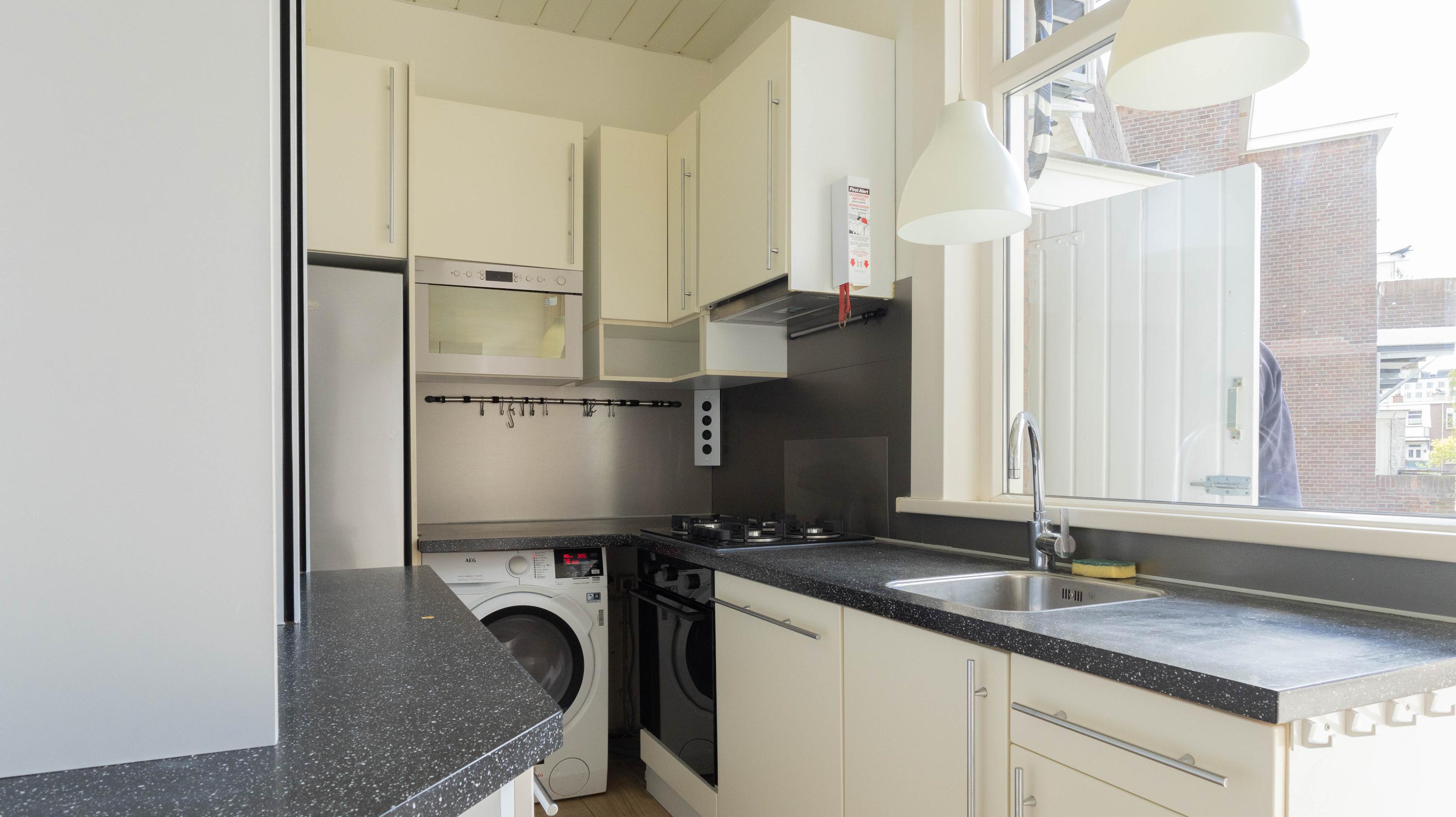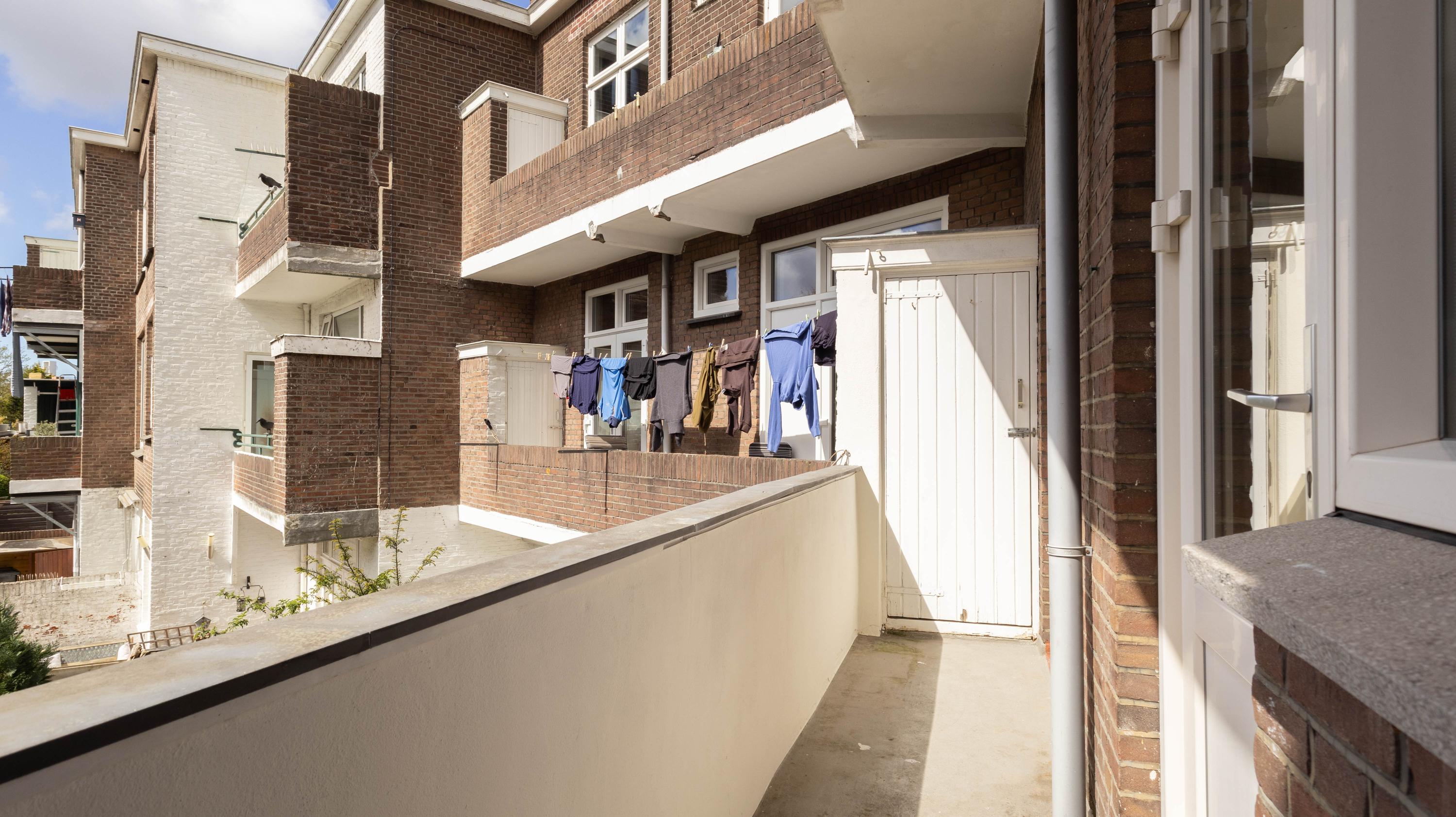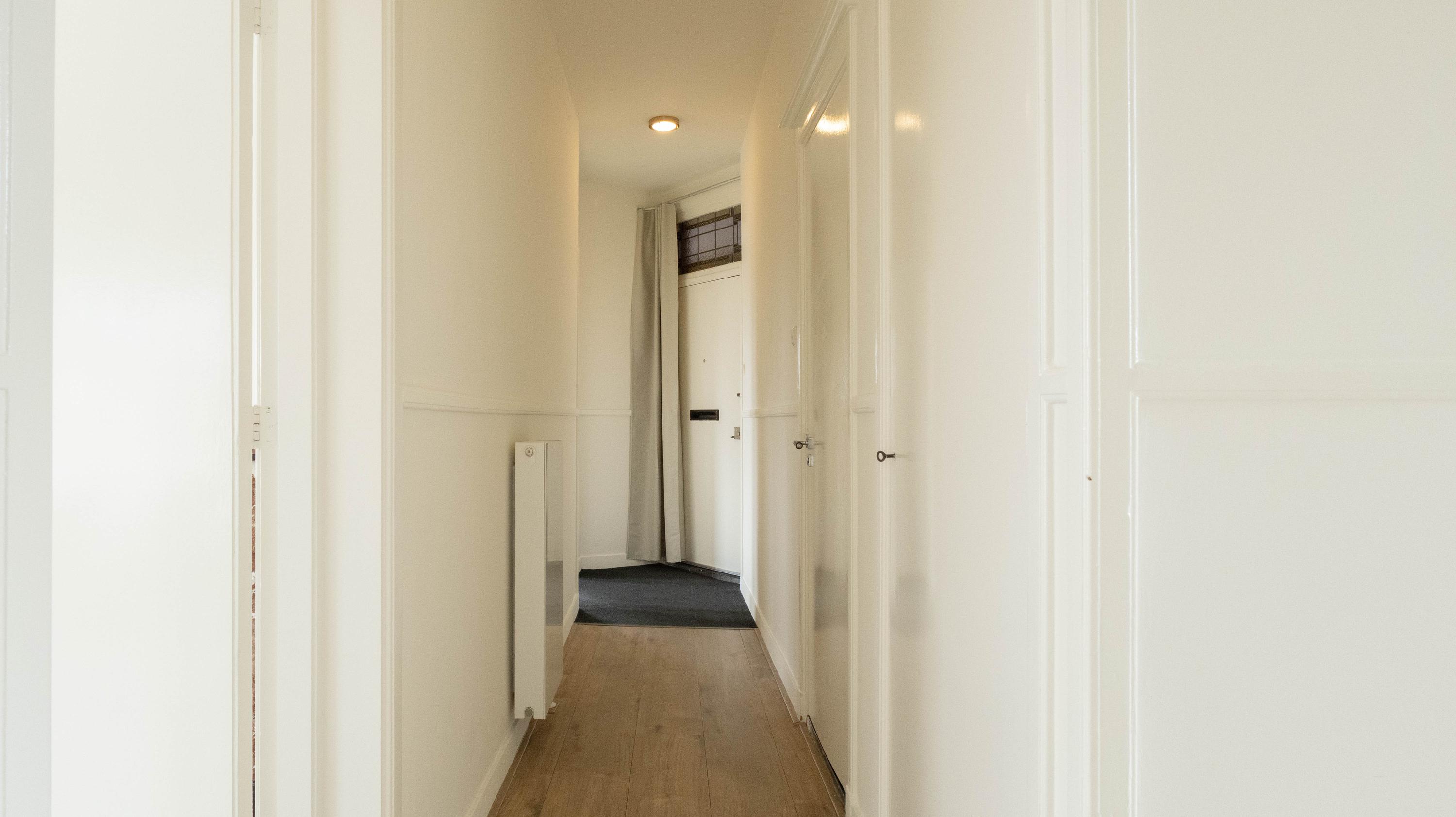 De entree van de woning is bereikbaar via een trap vanaf de straat. Eenmaal binnen komt de woning uit in de centrale hal, die toegang biedt tot alle vertrekken. Vanuit hier zijn de twee ruime slaapkamers, de verzorgde badkamer voorzien van een douche en wastafel met meubel en het separate toilet bereikbaar. De woonkamer is ruim en licht en vormt het hart van de woning. De open keuken is voorzien van diverse inbouwapparatuur, waaronder een kookplaat, afzuigkap, oven, koelkast-vries combinatie en vaatwasser. Vanuit de keuken is het balkon op het zuiden bereikbaar, waar heerlijk van de zon genoten kan worden. De woning beschikt over twee goed bemeten slaapkamers. De hoofdslaapkamer biedt voldoende ruimte voor een tweepersoonsbed en een kledingkast. De tweede slaapkamer is ideaal te gebruiken als werk-, logeer- of kinderkamer.