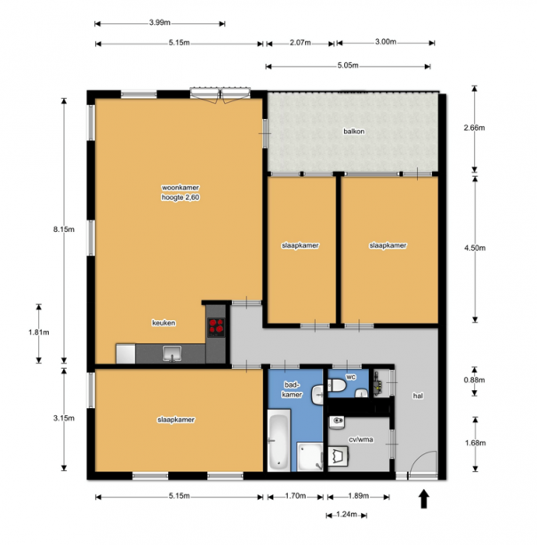 Het appartement beschikt over drie ruime slaapkamers, een stijlvolle badkamer met ligbad met whirlpoolfunctie, douche en wastafelmeubel en een separaat toilet. De technische ruimte is uitgerust met opstelplaats voor de wasmachine.