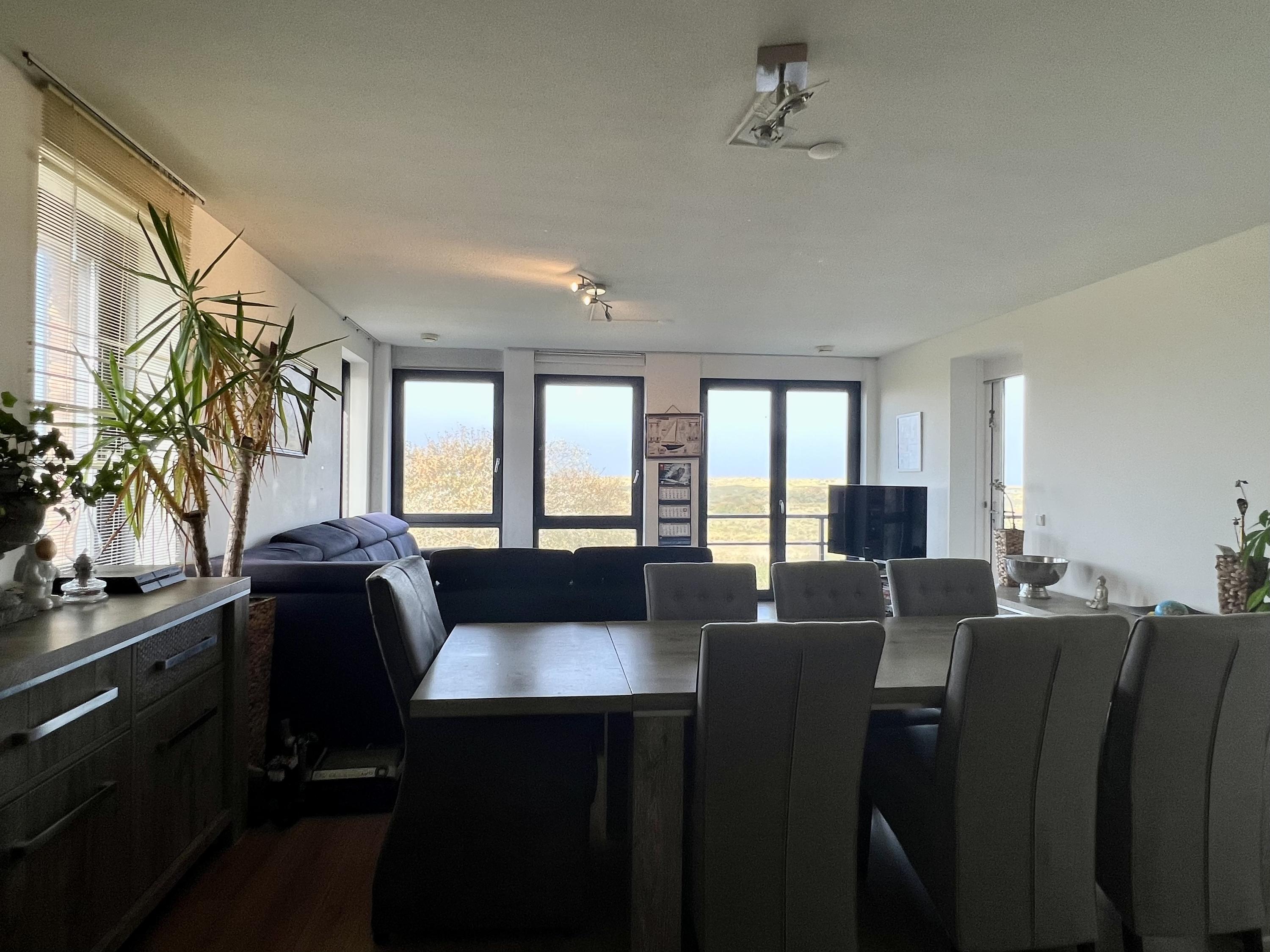 De woonkamer met open keuken vormt het hart van de woning, een plek waar u ontspannen kunt genieten van het uitzicht over de duinen en de Noordzee, waar de schepen langzaam voorbijvaren en de Schotse hooglanders vrij grazen.